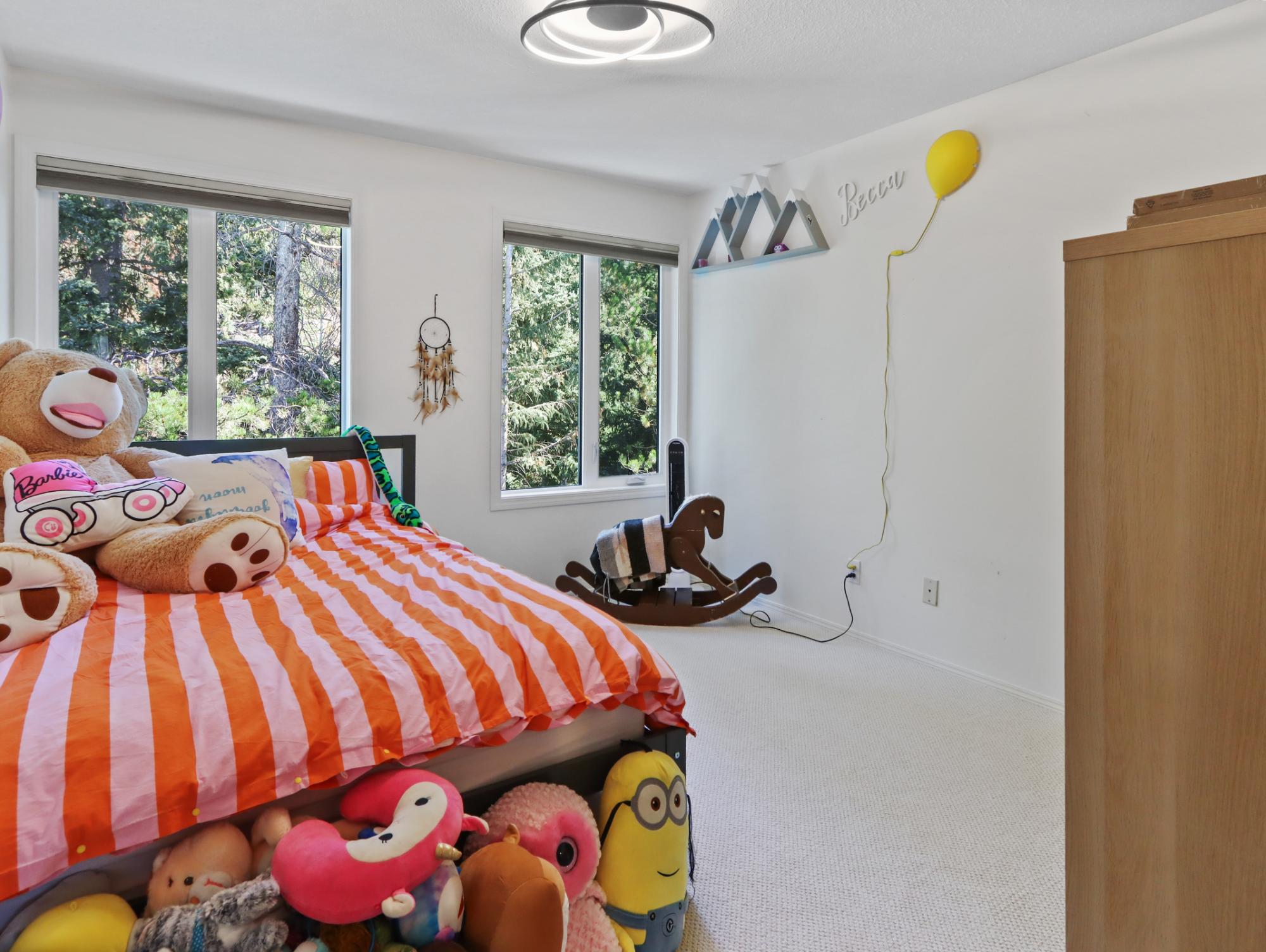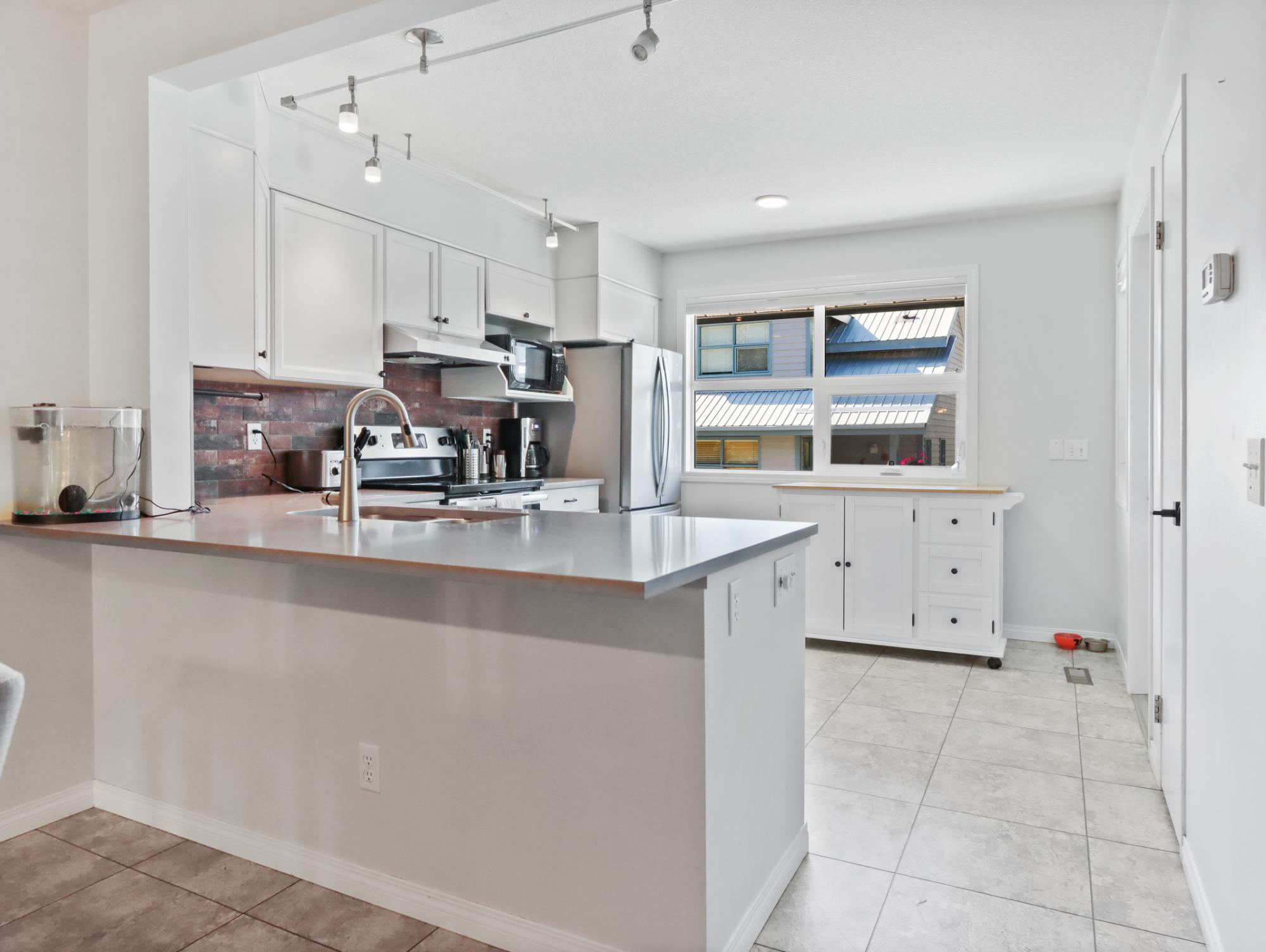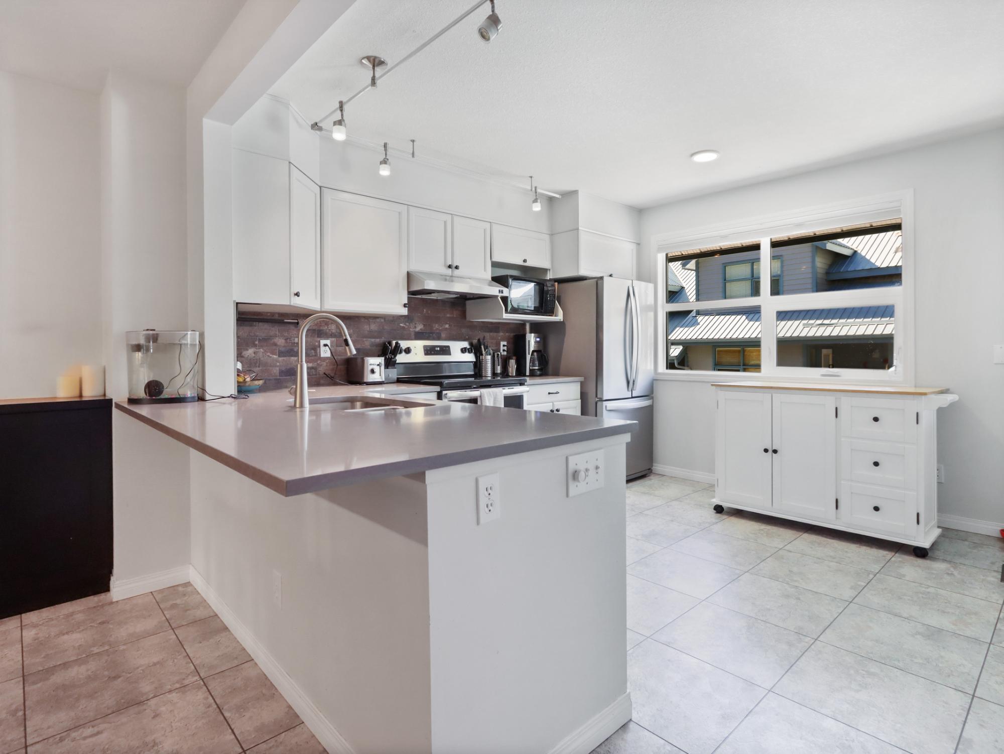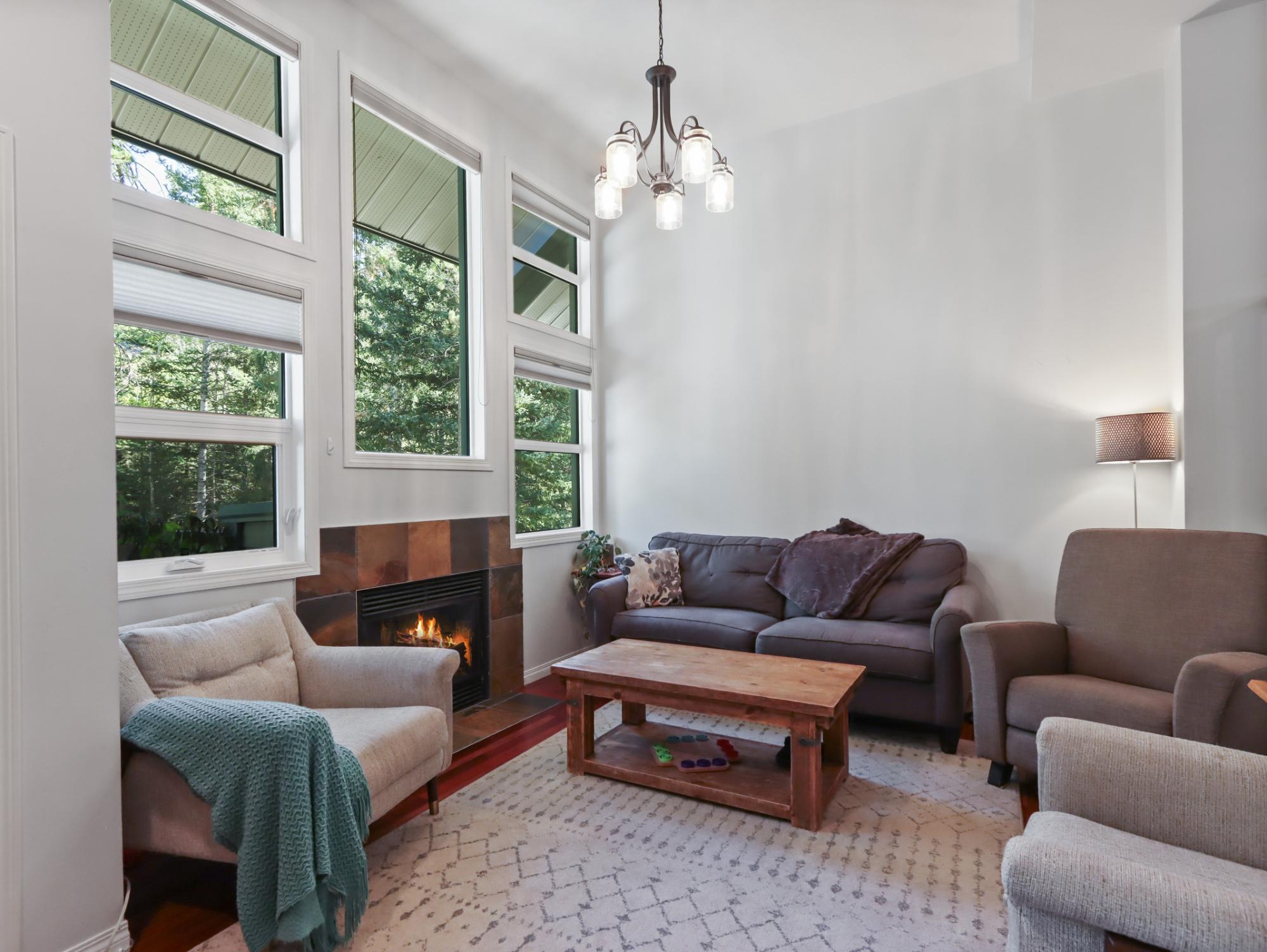This lovely 1,535 sqft three bedroom, two and a half bath townhome in the desirable Benchlands area offers a thoughtful split-level design with space for family and guests to spread out. The welcoming living room features hardwood floors, a cozy gas fireplace, and access to a private deck with forest reserve views. A half flight up, the generous kitchen boasts stainless appliances, stone counters, eating bar, and direct access to a south-facing BBQ deck. The adjoining dining area overlooks the living room, enhancing the bright, open flow. Upstairs, both bedrooms include private ensuites; the primary offers a large walk-in closet. The lower level provides a versatile flex room or third bedroom with oversized windows, plus a separate laundry. Added features include a half bath on the main level, central vacuum, and a single-car insulated garage offering secure parking, storage, or workspace—an inviting mountain retreat near trails, school, and downtown.