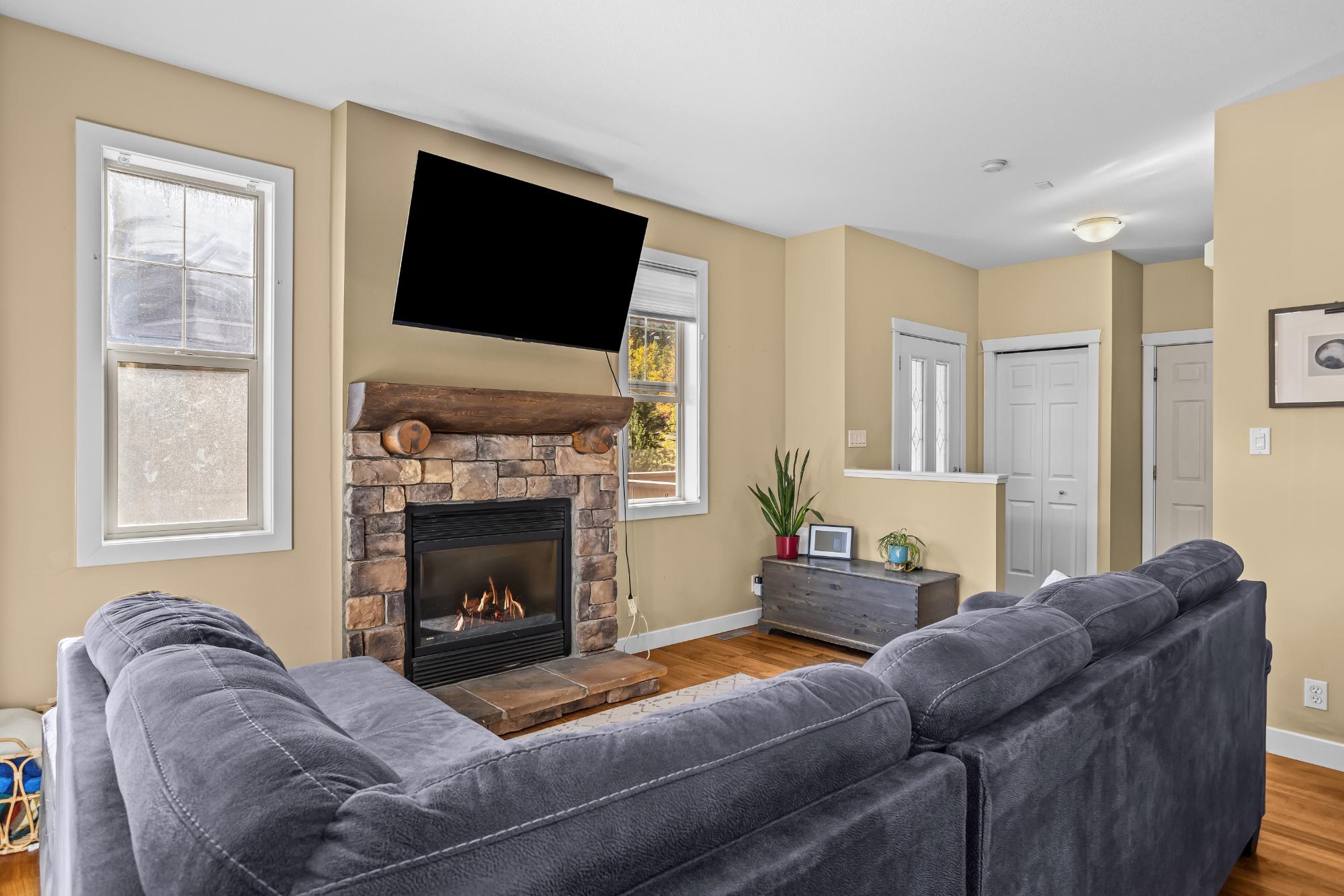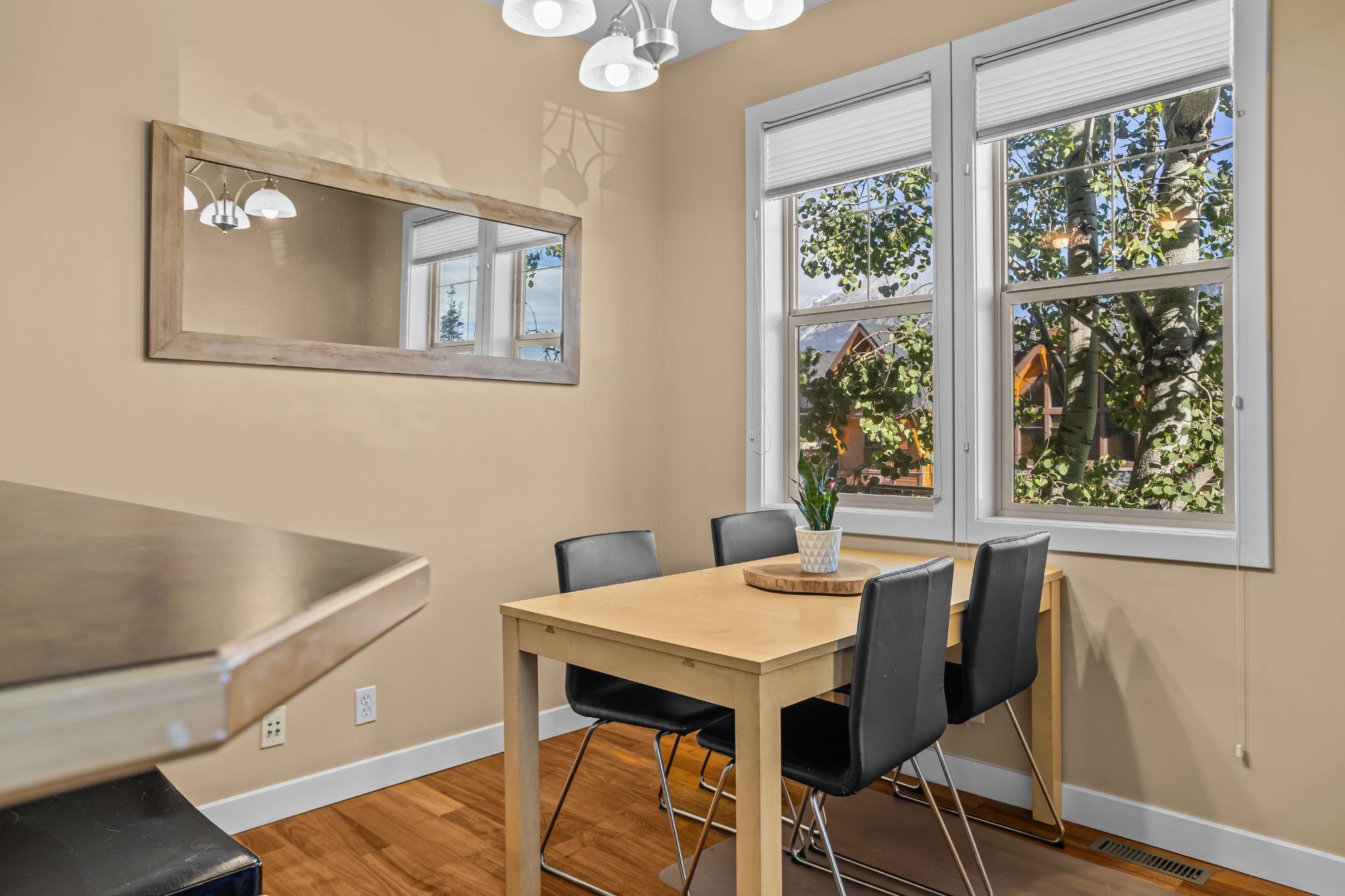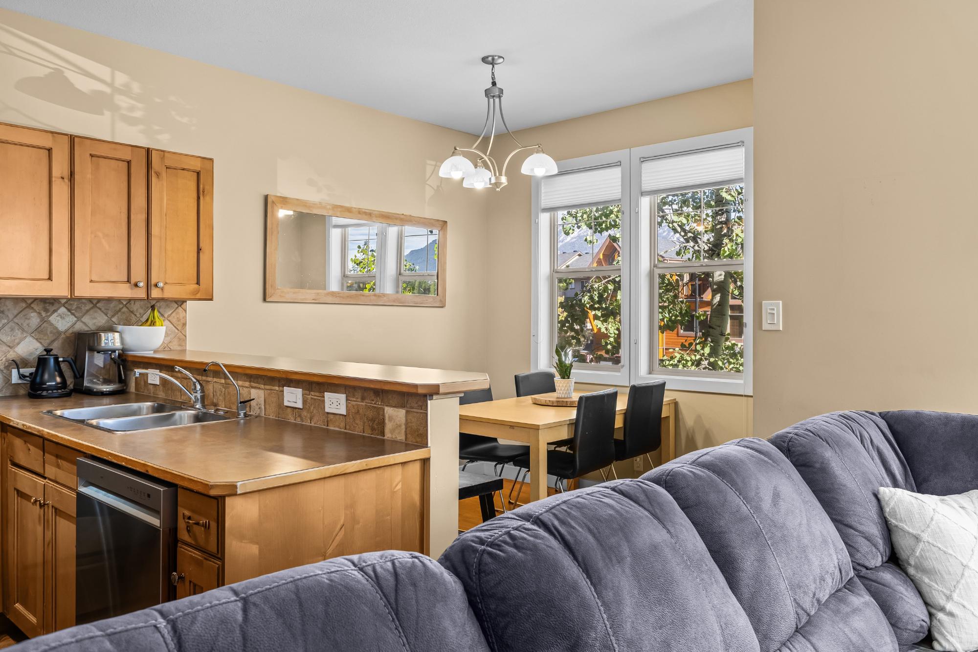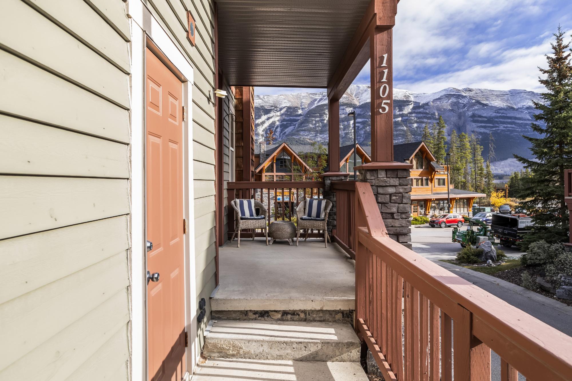Beautiful corner townhouse in the sought-after Collier’s Ridge community, offering over 1,000 sq. ft. of bright, open living space and stunning mountain views. The main level features an inviting open-concept kitchen, dining, and living area with 9’ ceilings and a cozy gas fireplace with a charming log mantle. Step out from the dining area onto the spacious deck and take in the unobstructed views. The entry level also includes a powder room and a single attached garage for added convenience. The walkout lower level hosts two generous bedrooms with heated floors, a 4-piece bath, laundry, and a private patio off the primary suite. This well-managed complex is just steps from hiking and biking trails and minutes from Stewart Creek Golf Course — the perfect blend of comfort, style, and mountain living.
