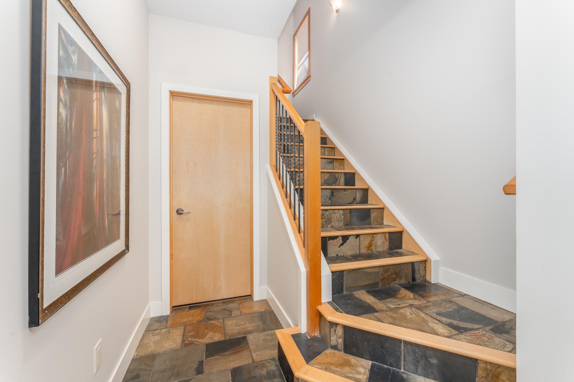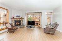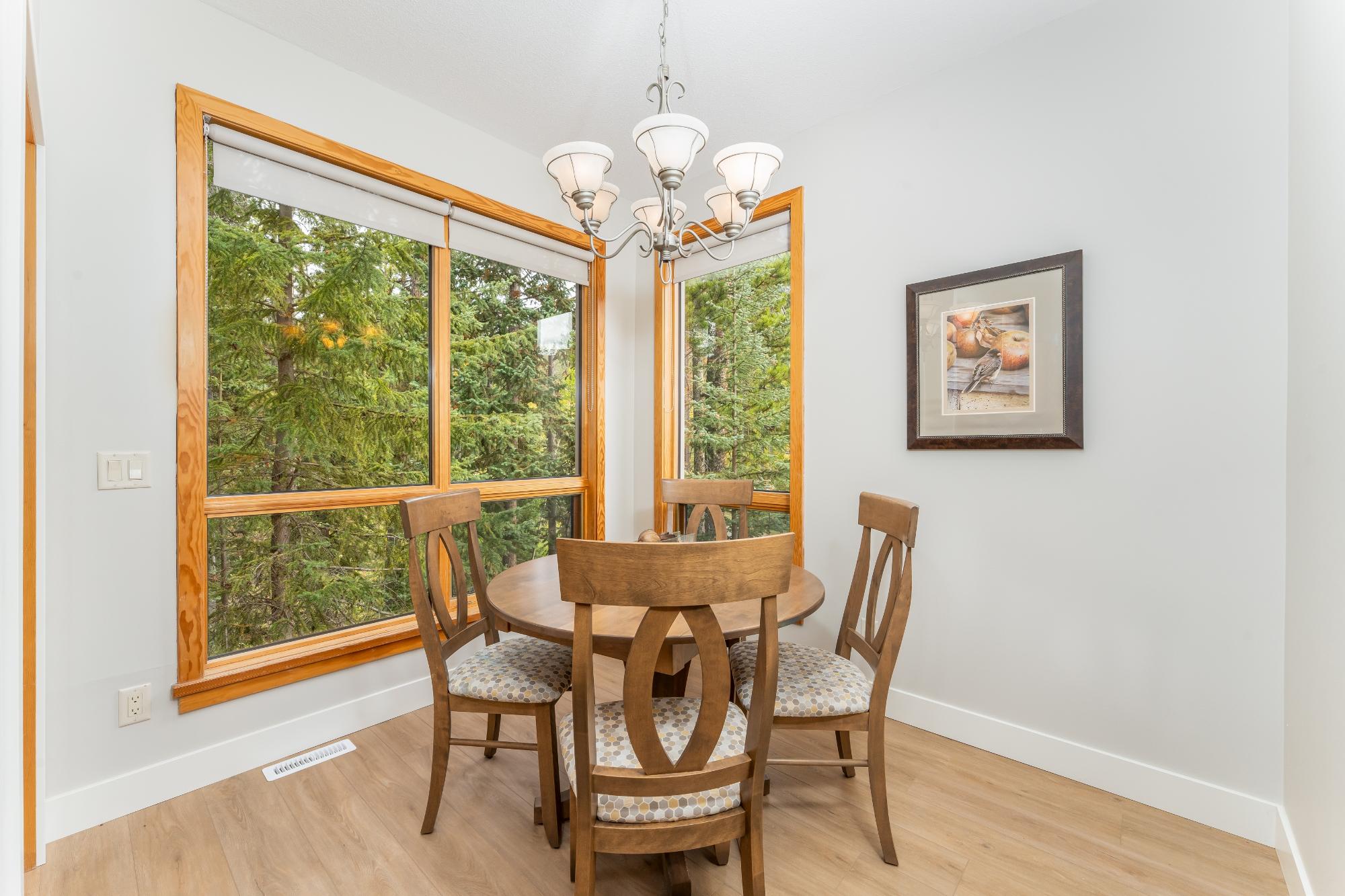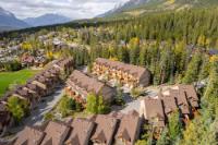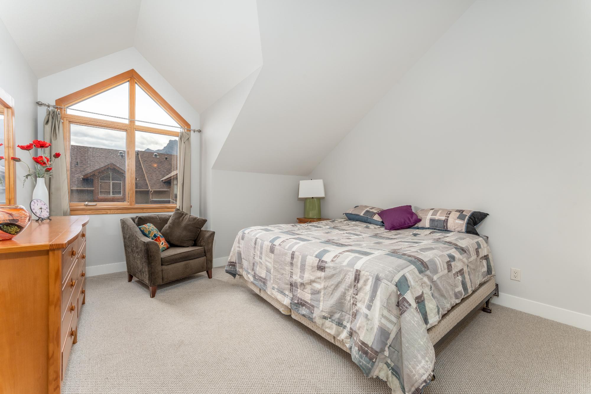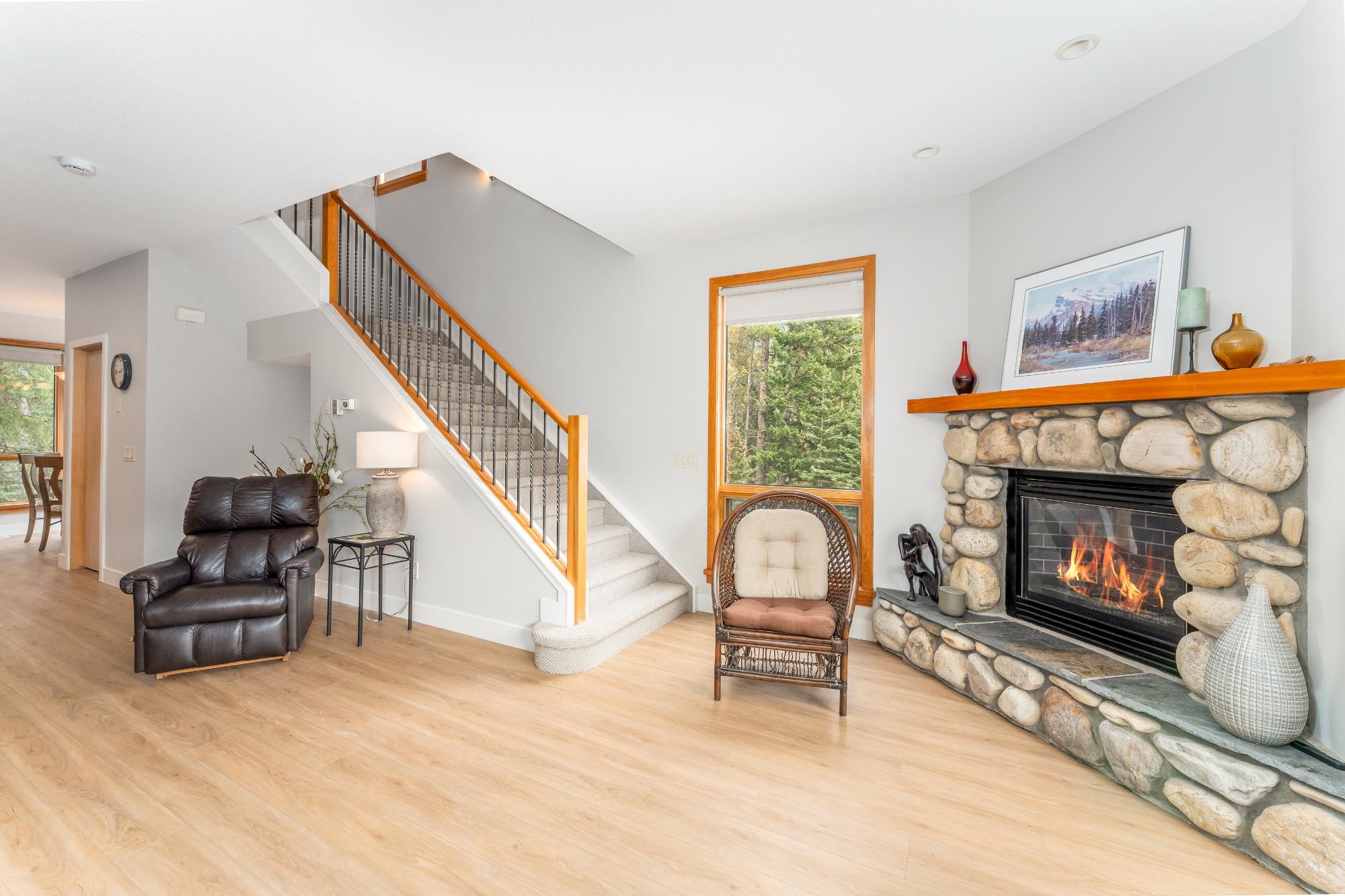 Perched above Eagle Terrace, this three-level walkout townhouse blends mountain living with modern comfort. A coveted corner suite with single car garage, it was thoughtfully reimagined by the original owners to add space and windows framing stunning alpine views. The open concept main level features a river rock gas fireplace, dining area, powder room, and smart kitchen with island and breakfast nook that opens to a balcony overlooking a treed reserve. A second balcony captures sweeping vistas of the Three Sisters peaks. Upstairs, two vaulted bedrooms each boast a private ensuite, separated by a dedicated laundry. One enjoys mountain views, the other peaceful treetops. The walk-out level offers a versatile flex room with patio and hot tub, plus a full bath and storage. Whether as a full-time residence or retreat, this home offers a gateway to the Eagle Terrace lifestyle; where trails, community, and breathtaking views are right outside your door.