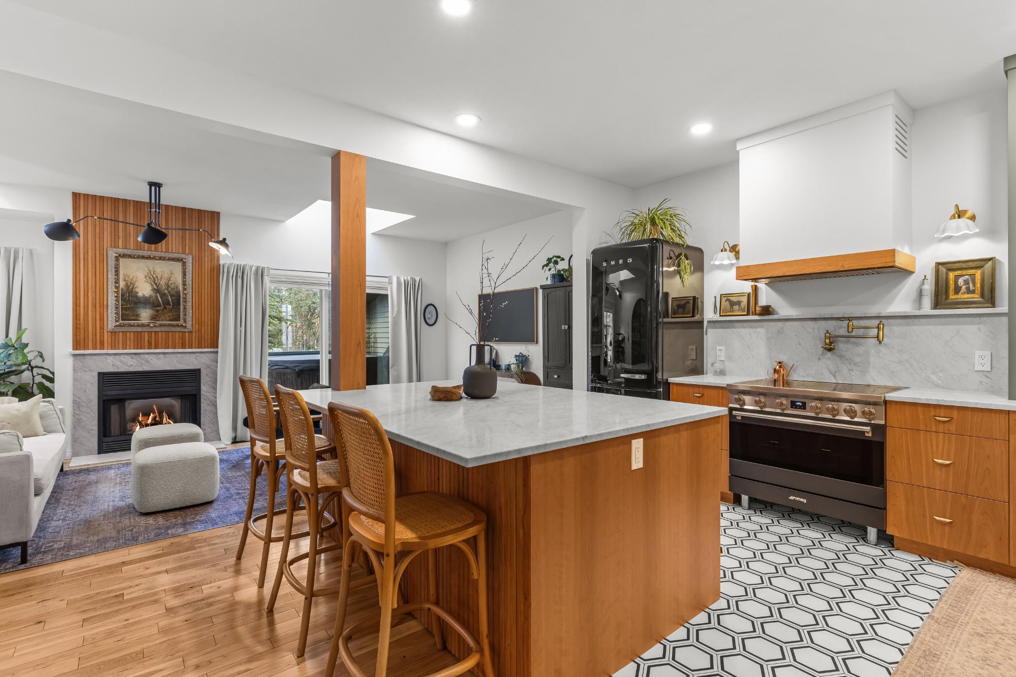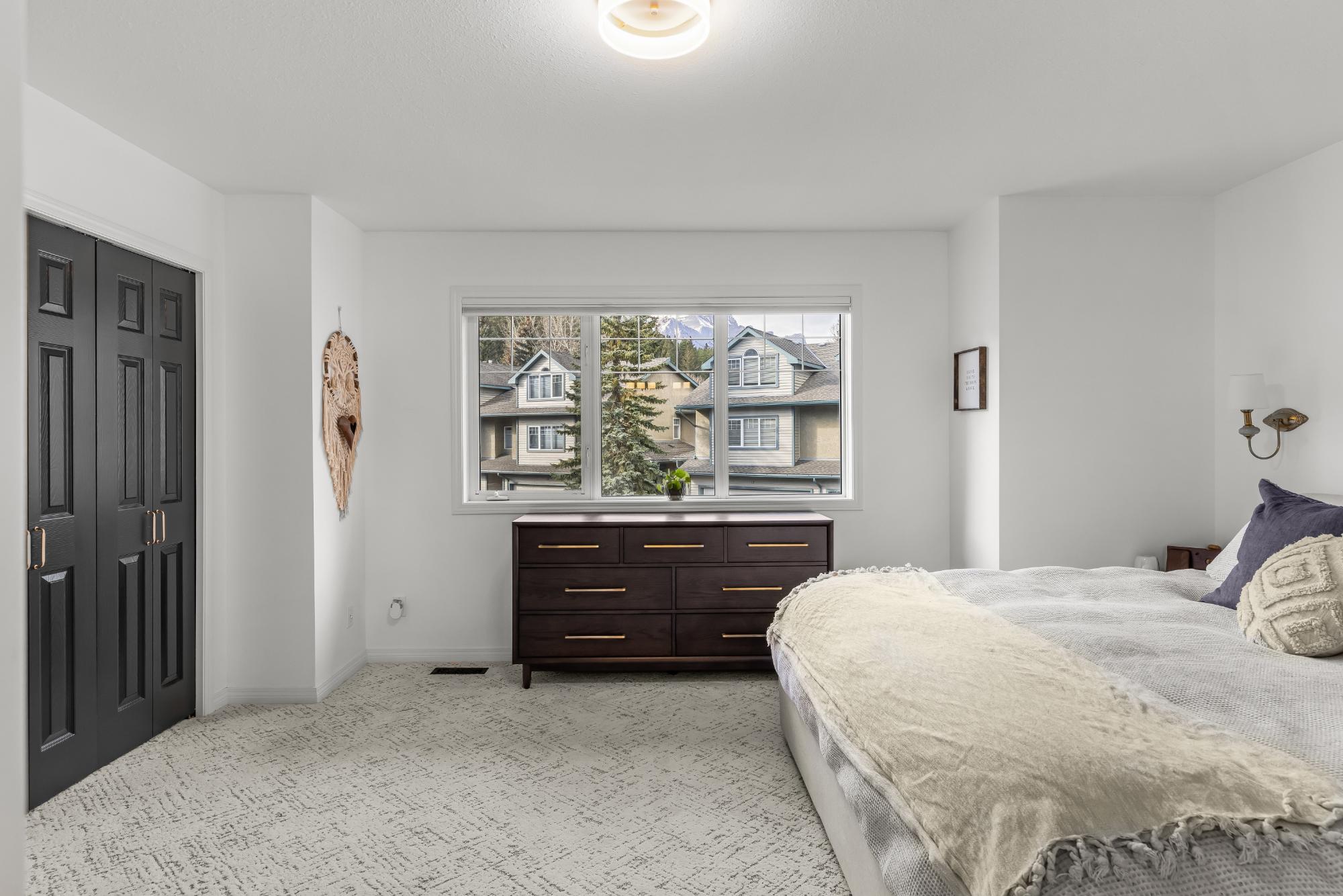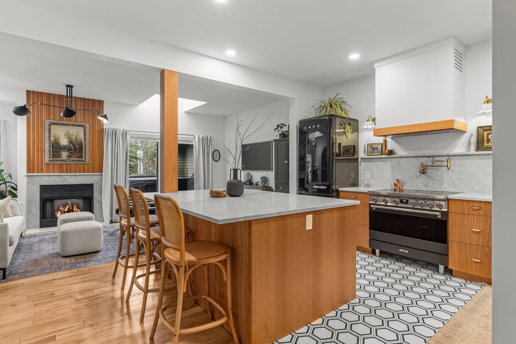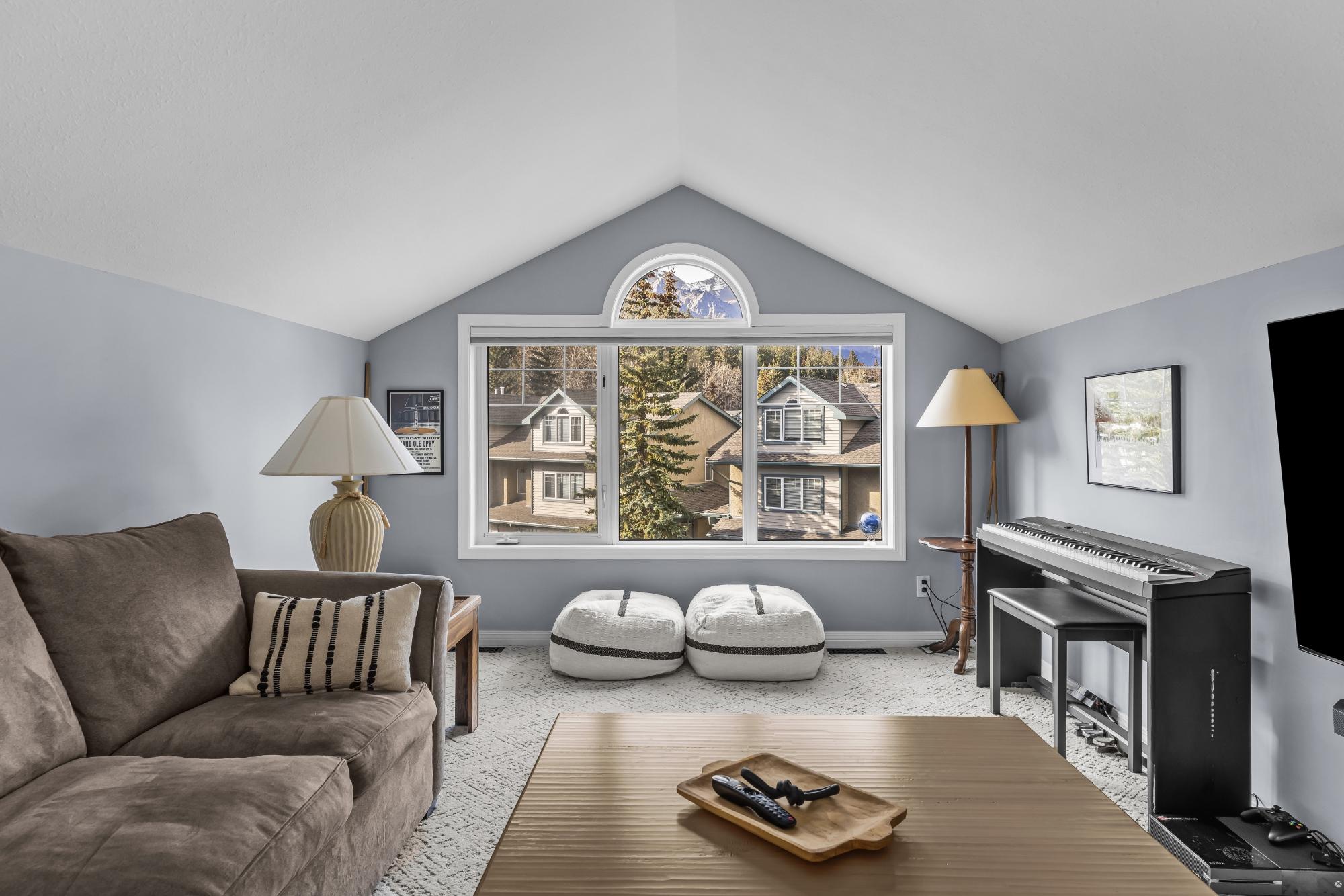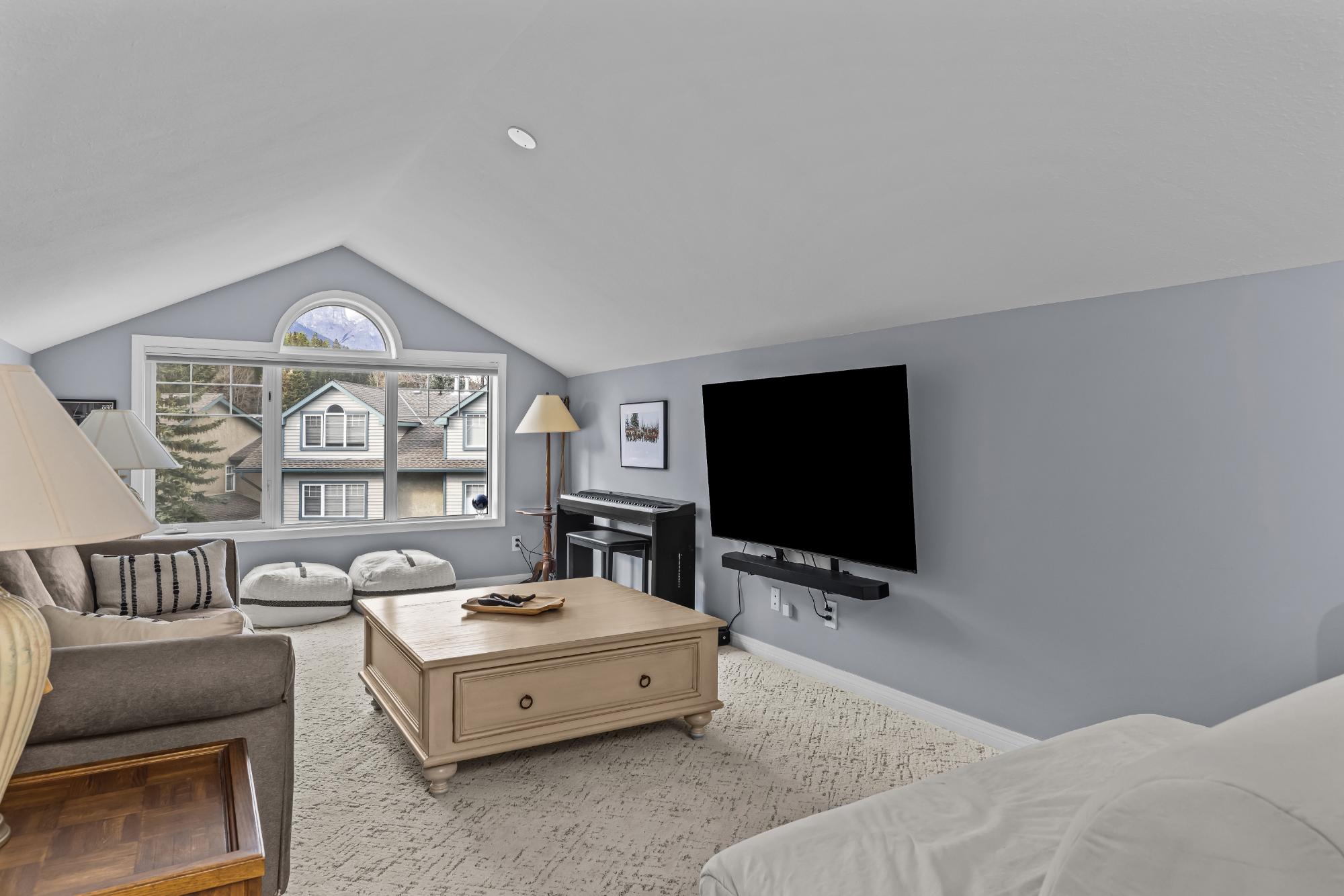 Fully renovated from top to bottom this stunning 3 bed 3 bath townhome offers over 2100SF of beautifully designed living space. The reimagined kitchen is a showpiece, featuring an oversized marble island w/ hidden storage, black SMEG appliances, brass accents, & sleek marble backsplash. Warm wood tones flow through the open-concept living area, complemented by a cozy gas fireplace, large skylights, & soft lighting that leads to a spacious deck w/ a private hot tub. Upstairs enjoy new carpet, railings, & lighting that enhance the space. Sunny mountain views fill the primary bedroom, accompanied by a fully updated ensuite w/ double sinks & tiled shower while 2 guest beds share a modern full bath. The flexible top-floor loft makes for a great home office, media room, kids zone, fitness area. Every detail has been thoughtfully curated to blend comfort, character, & modern elegance, creating a truly move-in-ready home in the heart of Canmore. PLUS enjoy a large 2car garage & driveway.