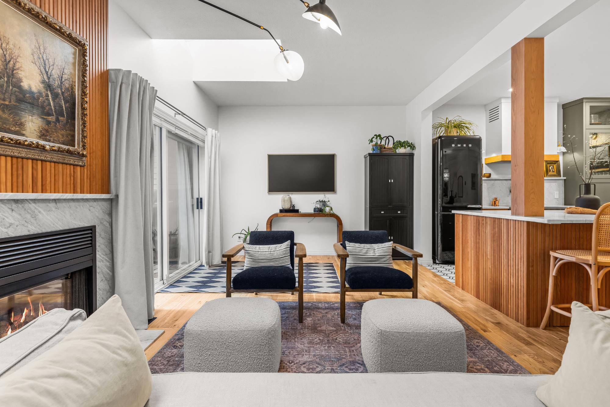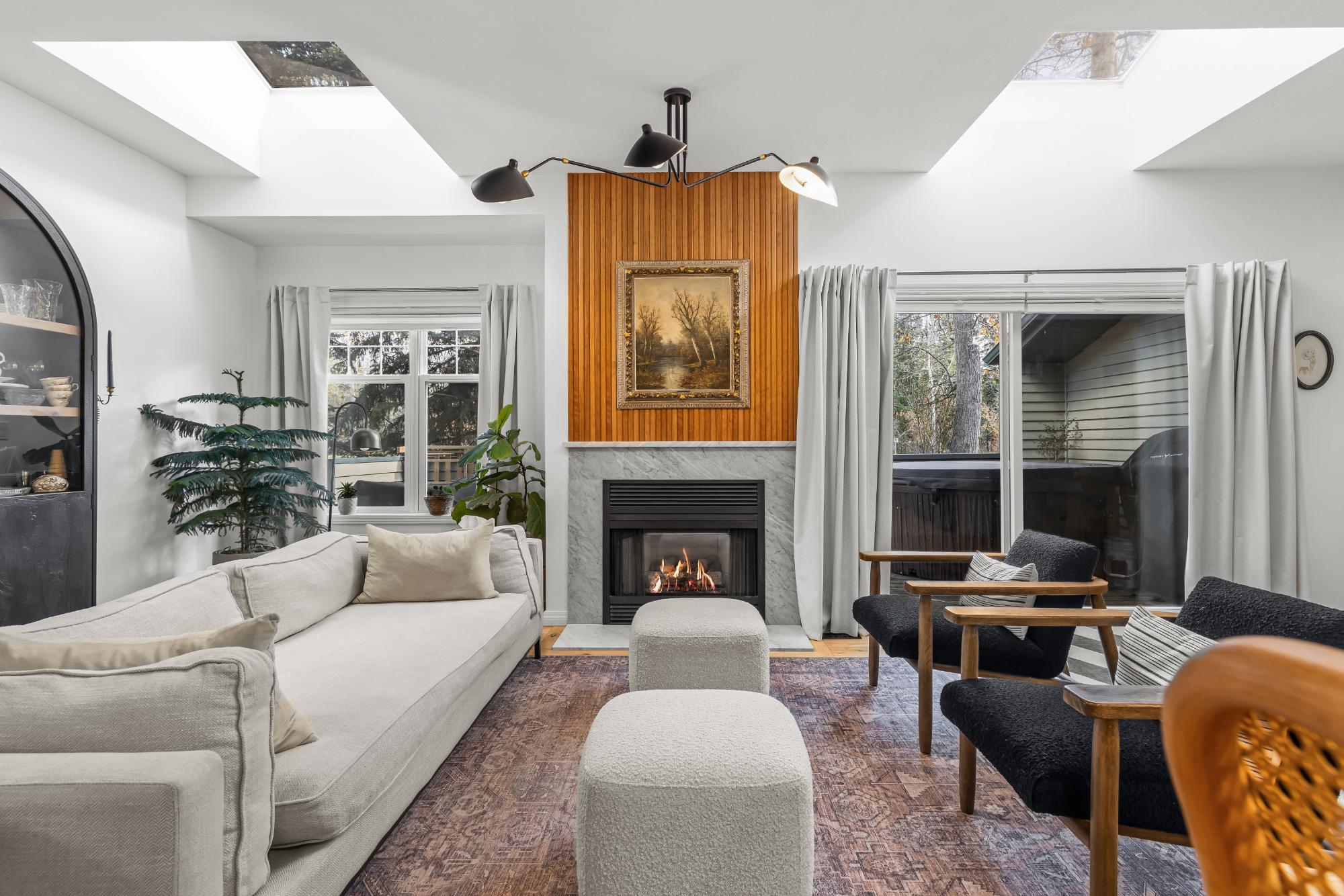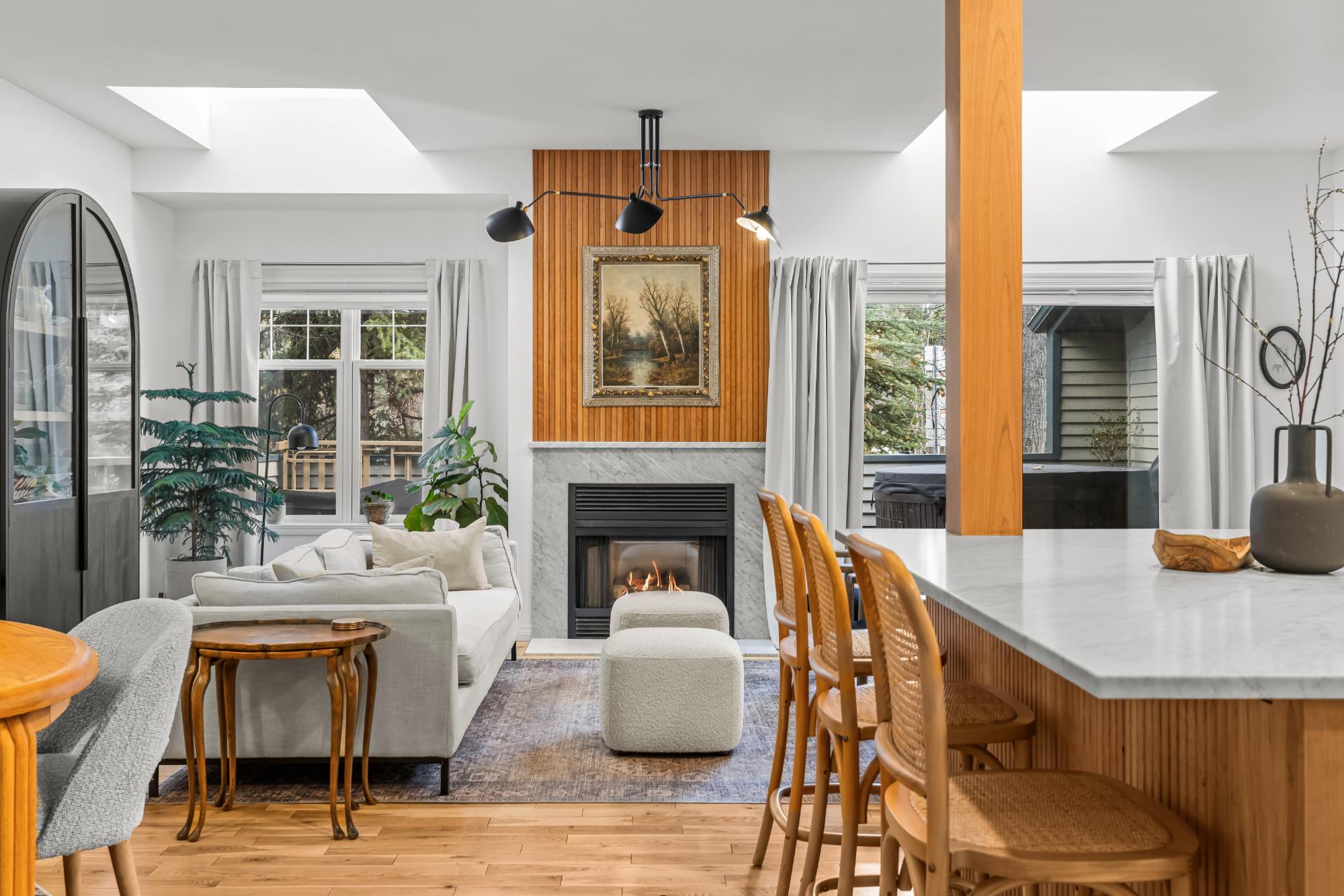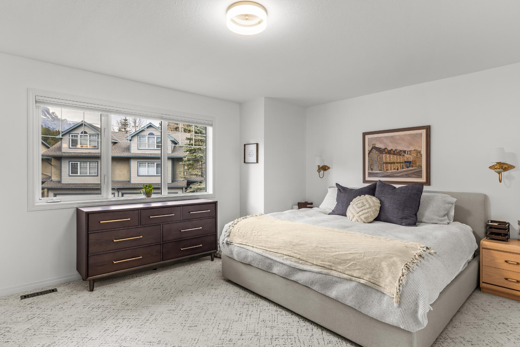 Fully renovated from top to bottom this stunning 3 bed 3 bath townhome offers over 2100SF of beautifully designed living space. The reimagined kitchen is a showpiece, featuring an oversized marble island w/ hidden storage, black SMEG appliances, brass accents, & sleek marble backsplash. Warm wood tones flow through the open-concept living area, complemented by a cozy gas fireplace, large skylights, & soft lighting that leads to a spacious deck w/ a private hot tub. Upstairs enjoy new carpet, railings, & lighting that enhance the space. Sunny mountain views fill the primary bedroom, accompanied by a fully updated ensuite w/ double sinks & tiled shower while 2 guest beds share a modern full bath. The flexible top-floor loft makes for a great home office, media room, kids zone, fitness area. Every detail has been thoughtfully curated to blend comfort, character, & modern elegance, creating a truly move-in-ready home in the heart of Canmore. PLUS enjoy a large 2car garage & driveway.