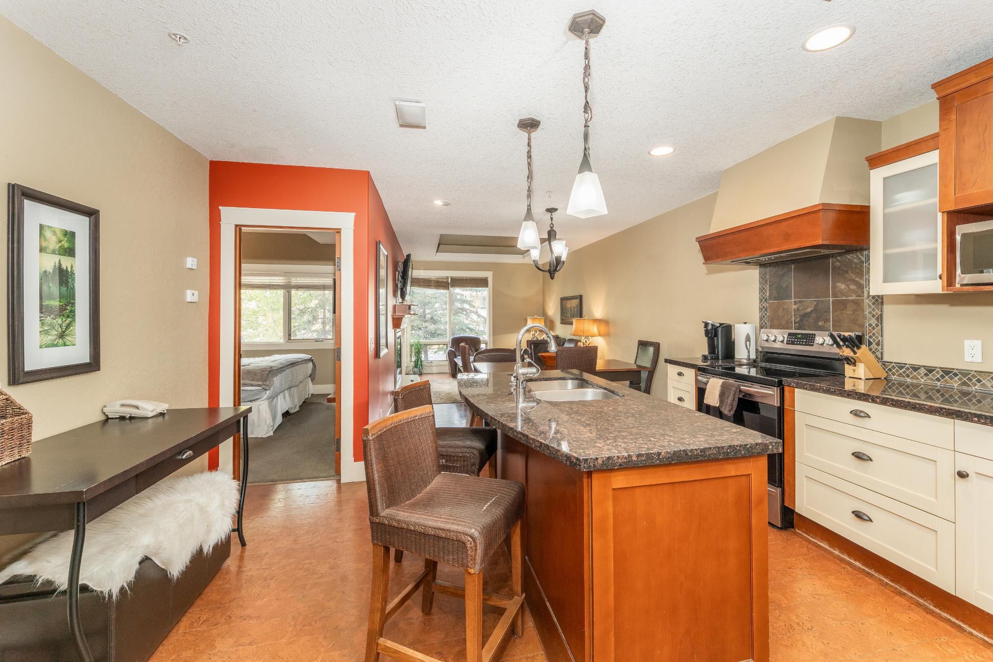 Picture yourself in one of Canmore’s most desirable destinations—Solara Resort & Spa. Offering one of the most functional one-bedroom layouts, welcoming you with a bright, open-concept living space designed for connection. The gourmet kitchen features two-tone cabinetry, granite countertops, imported cork floors, a spacious island, and stainless-steel appliances. perfect after a day of mountain adventure. Gather in the dining area set for four, then unwind in the living room’s plush sofa (which doubles as a queen bed) beside the ambient fireplace. Step onto your private balcony, ideal for stargazing against a backdrop of snowcapped peaks. The spa-inspired bathroom, the largest of the one-bedroom designs, includes a stand-alone tub. Recharge in the serene king bedroom before another day in the Rockies. Amenities: indoor pool, hot tub, One Wellness Spa, Axis Bar & Kitchen, MainSpace event venue, Epic liquor & heated underground parking with gear storage. Zoned for short-term rentals