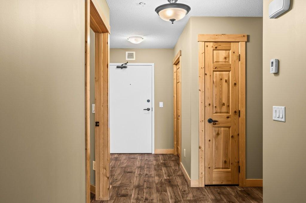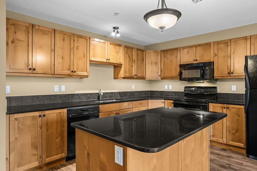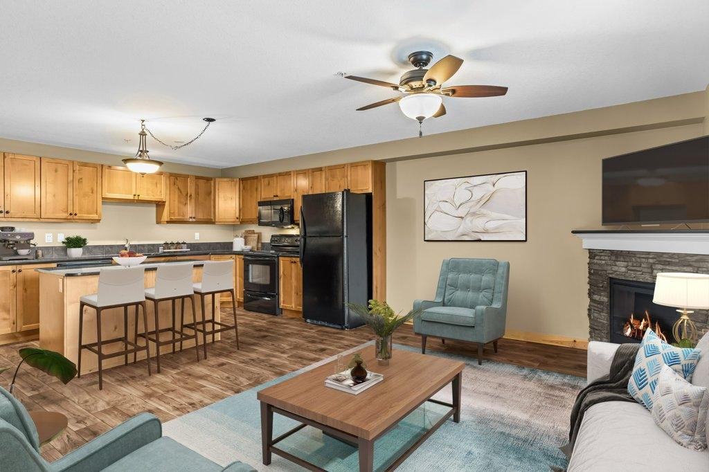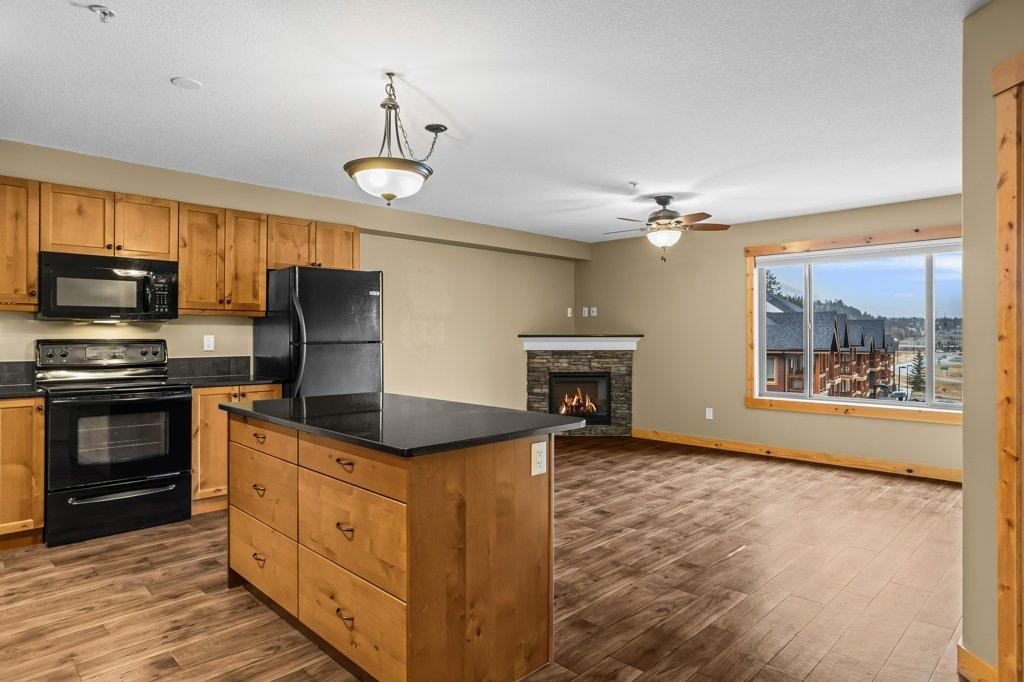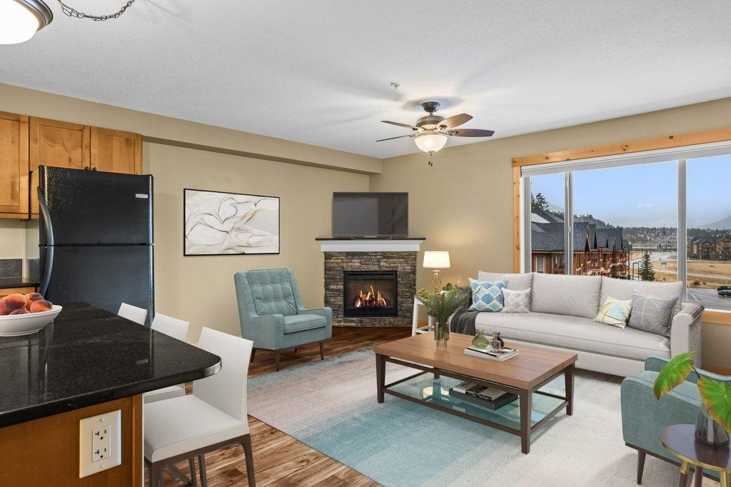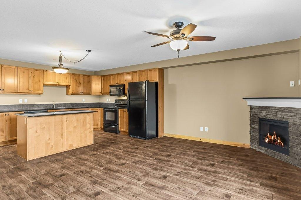 Enjoy the Canmore lifestyle in this bright 1-bedroom + den, 2-bath condo — perfectly designed for singles, couples or young families. The south-facing balcony offers stunning mountain views, even after nearby construction, with the new build adding noise protection from the Highway. Inside, you’ll love the open kitchen with granite countertops and island, the fireplace, and the warm touch of knotty alder wood trims. Ceiling fans in every room, new laundry (2024), and vinyl plank flooring with in floor heat make daily living easy and comfortable. Relax with friends by the fireplace, work from home in the den, or unwind on your balcony as the sun sets over the peaks. With two parking stalls (one underground), storage, and access to an elevator, gym, workroom, and dog park, everything you need is right here. Low condo fees and taxes make this the smart, attainable way to call Canmore home. The unit is vacant and easy to show. Quick possession. Call your Realtor now to view the unit!
