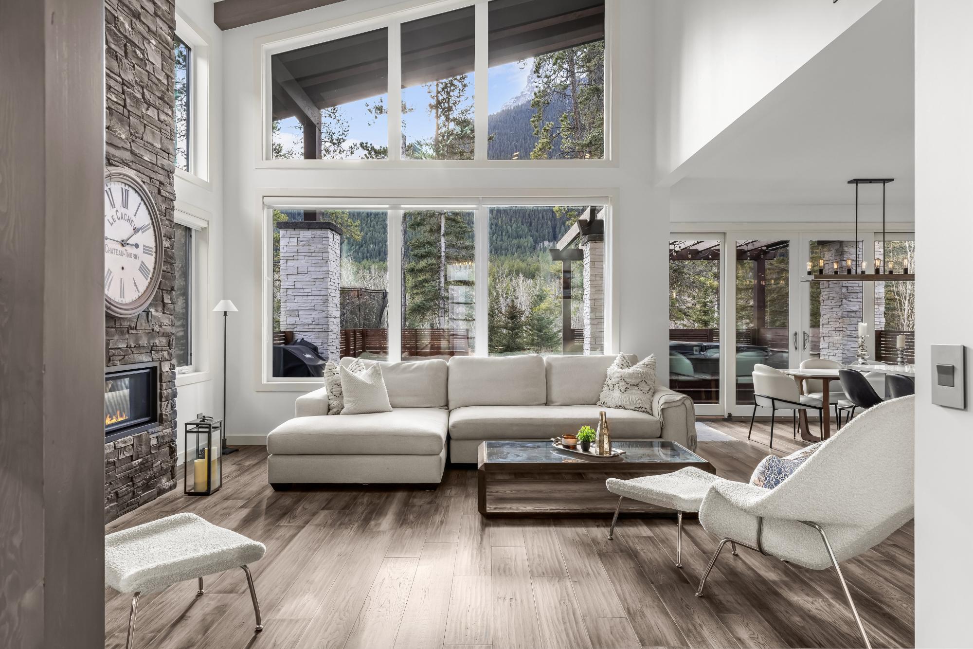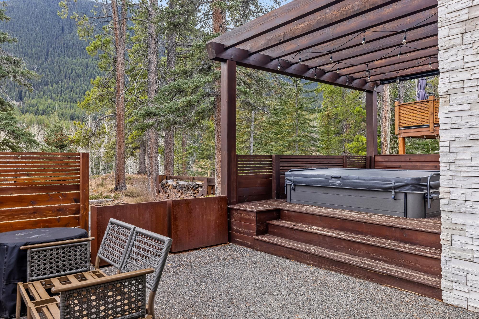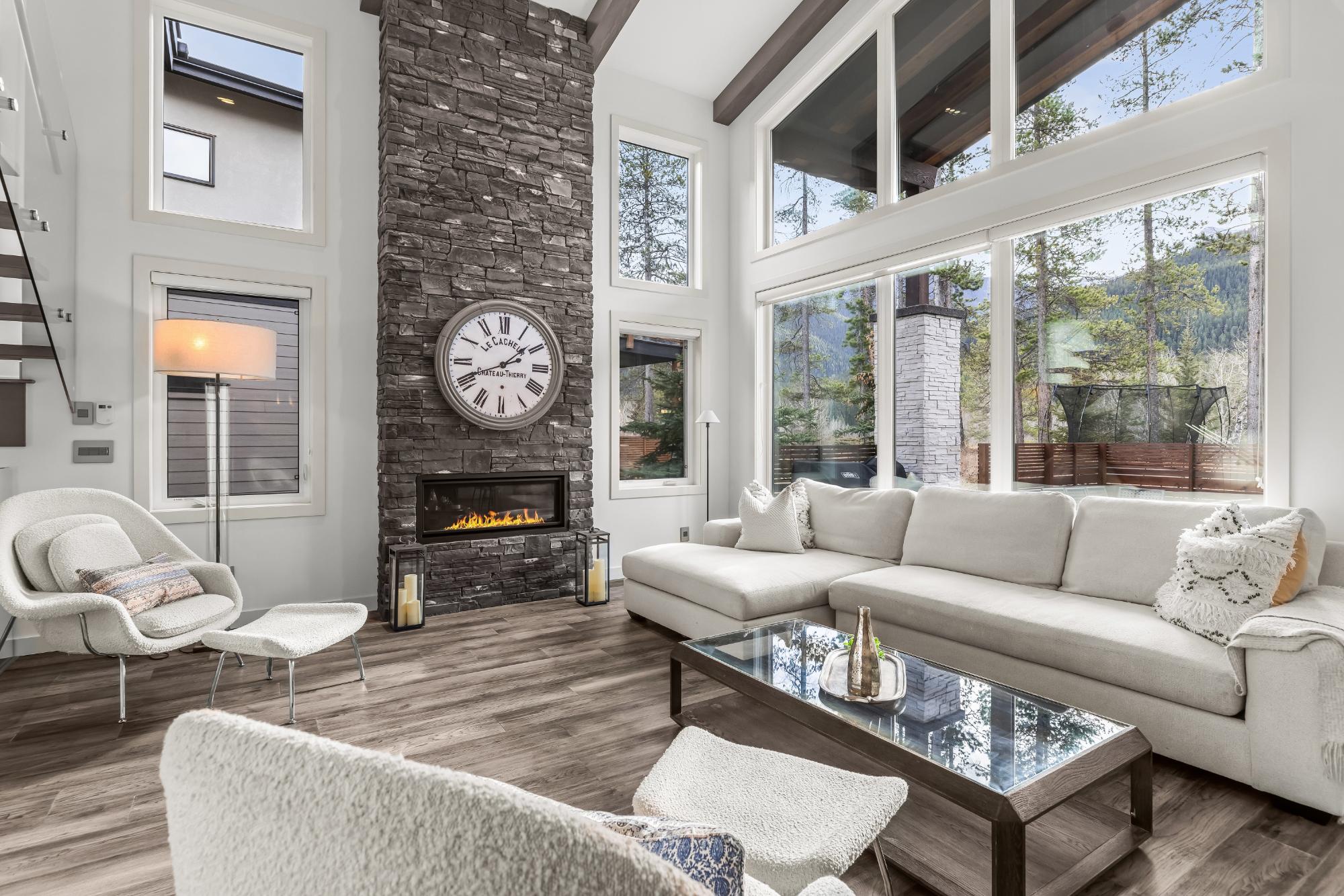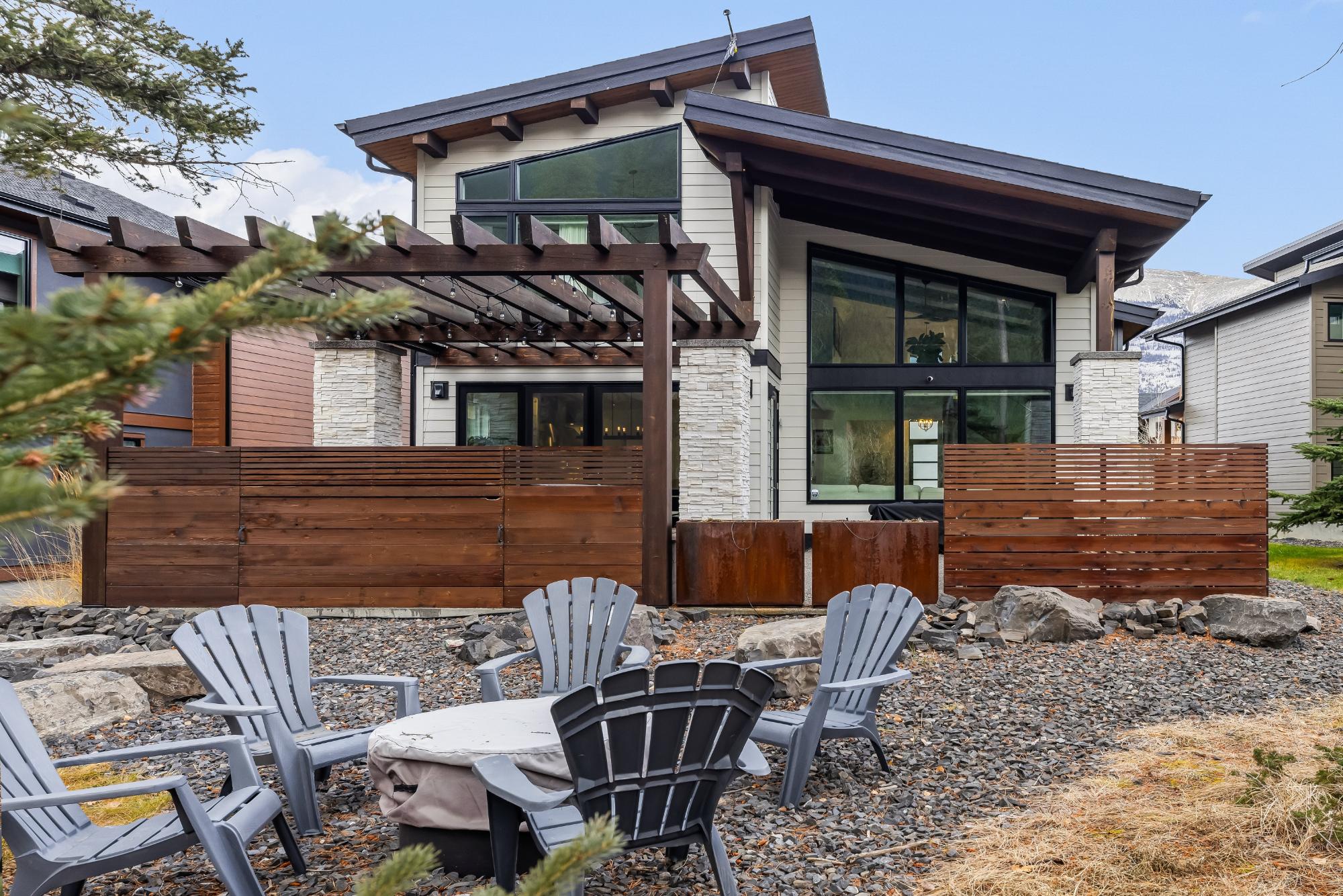 Discover mountain-modern living on the 10th hole of Stewart Creek Golf Course. This thoughtfully designed 4-bed, 4-bath home offers over 3,500 sq ft of bright, functional space with timber beams, large windows, and a warm alpine aesthetic. Enjoy an unobstructed and private backdrop ,creating a sense of calm and separation rarely found. Built with environmental and safety features, including solar panels and Fire-Smart roof sprinklers, the home blends modern efficiency with mountain style. The open-concept main level connects the kitchen, dining, and living areas, ideal for everyday living and entertaining. The private yard is a true retreat, featuring a sunken hot tub, fire pit, underground sprinklers, and thoughtful landscaping. Upstairs offers bright bedrooms and a welcoming primary suite, while the lower level provides flexible space for a gym, media room, or guests. Set in a quiet, scenic neighborhood with direct access to mountain recreation, this home