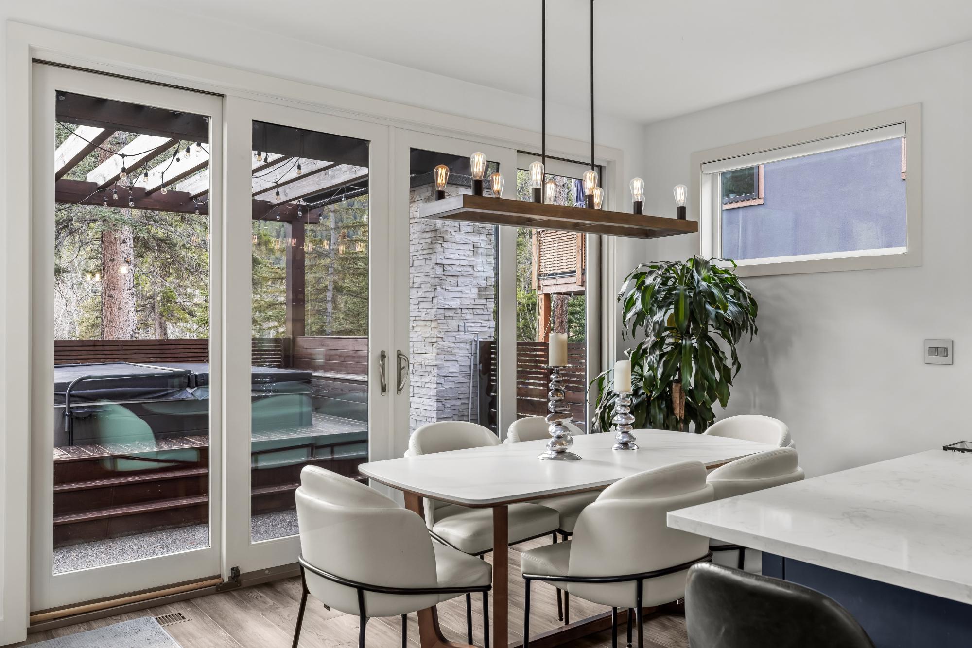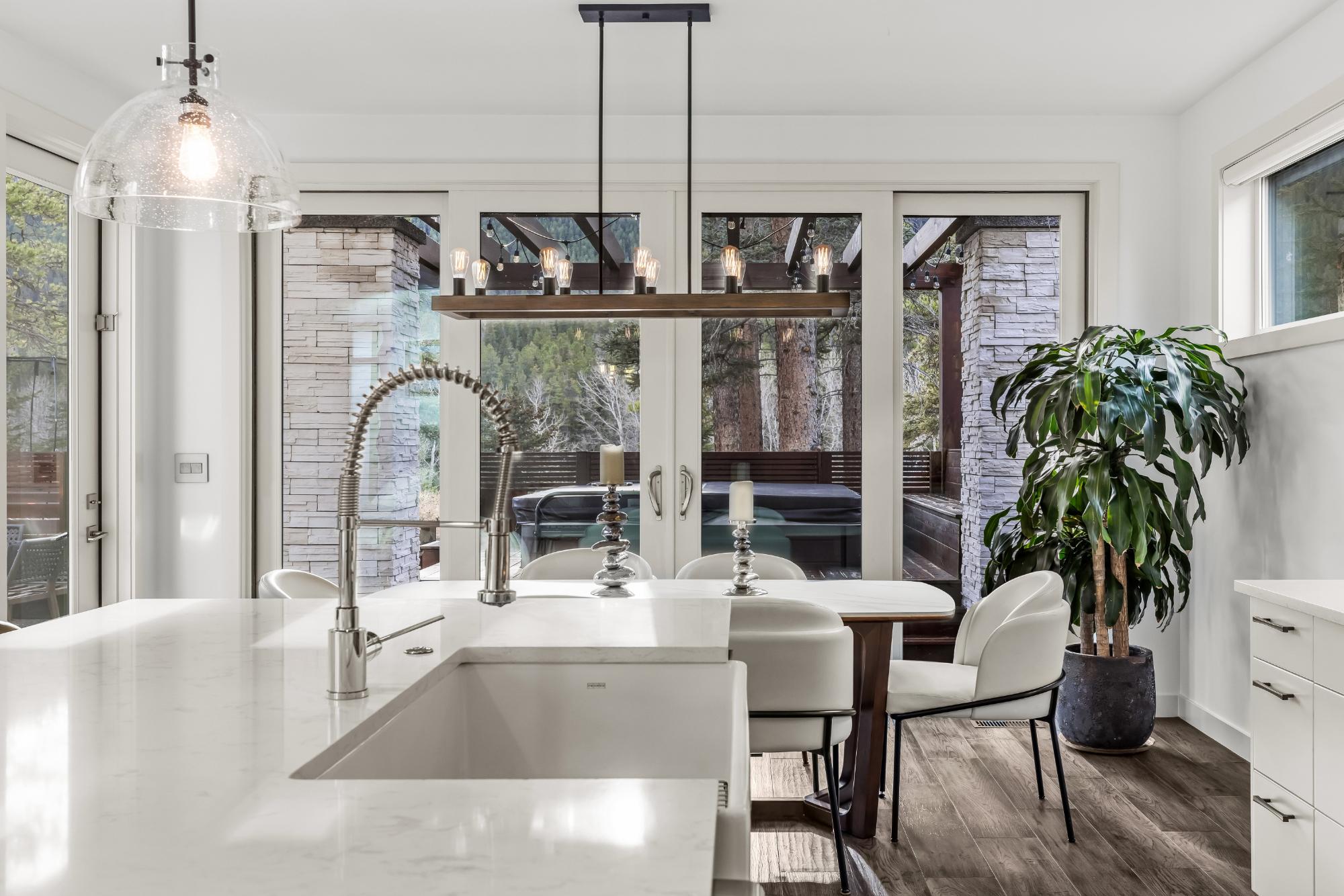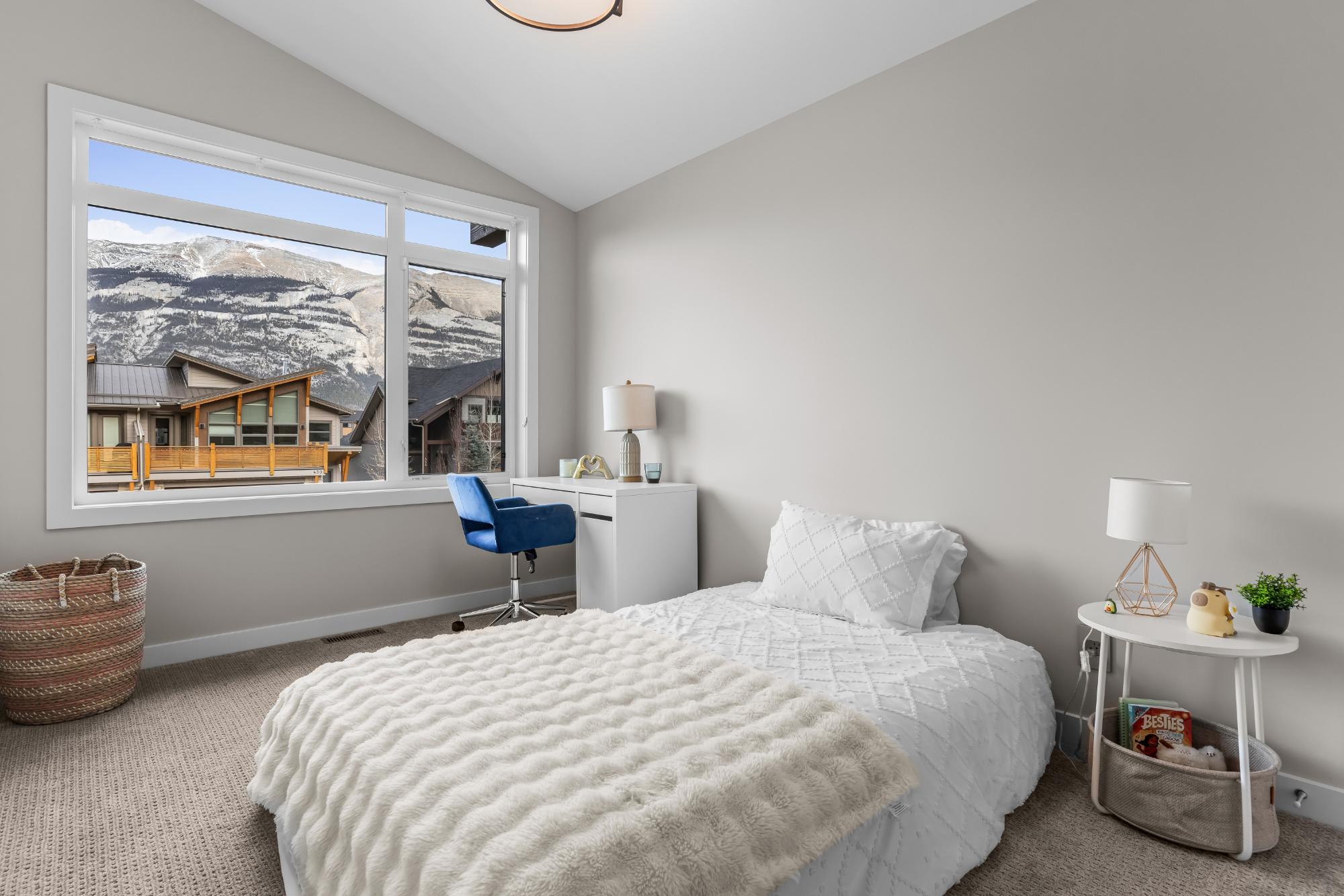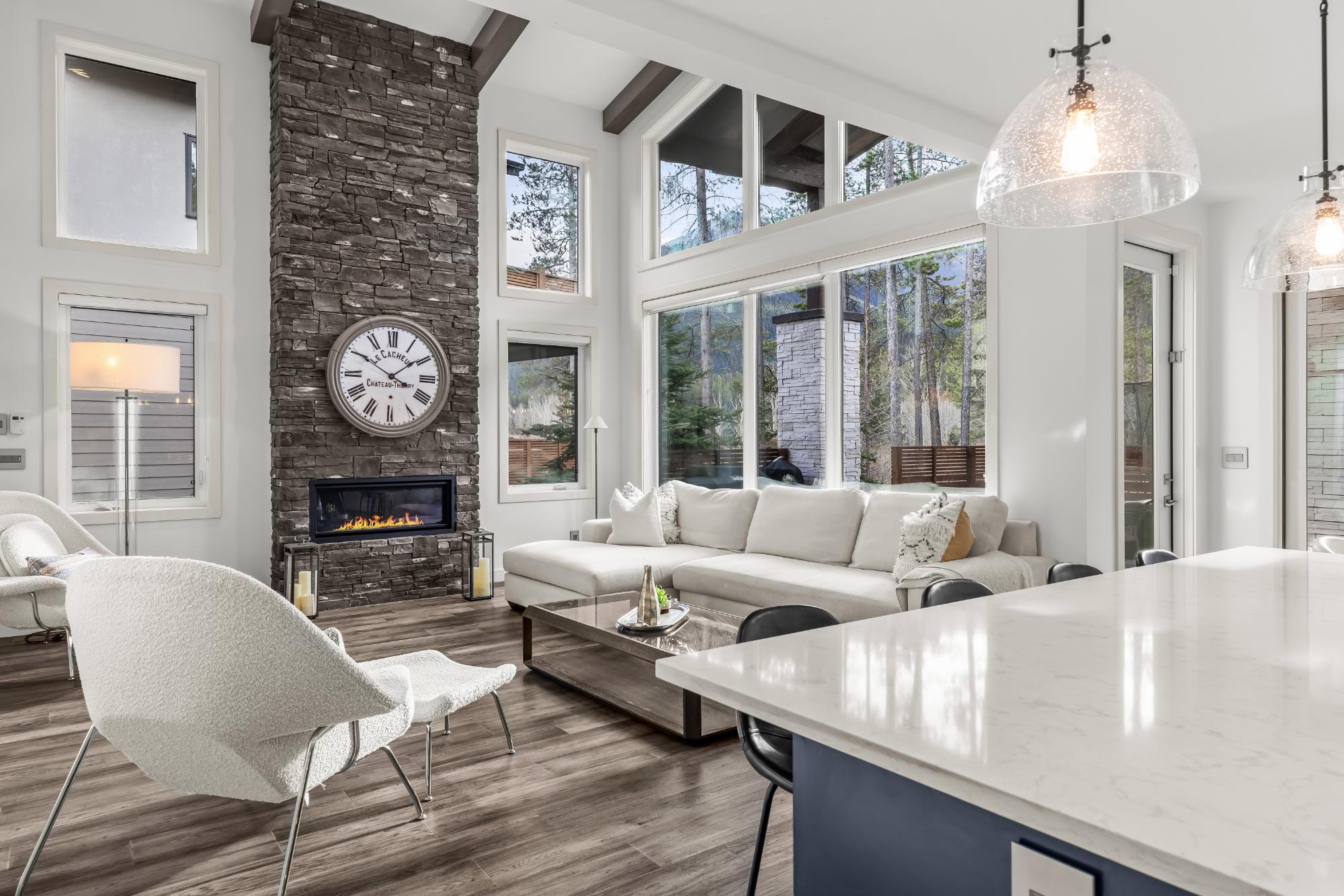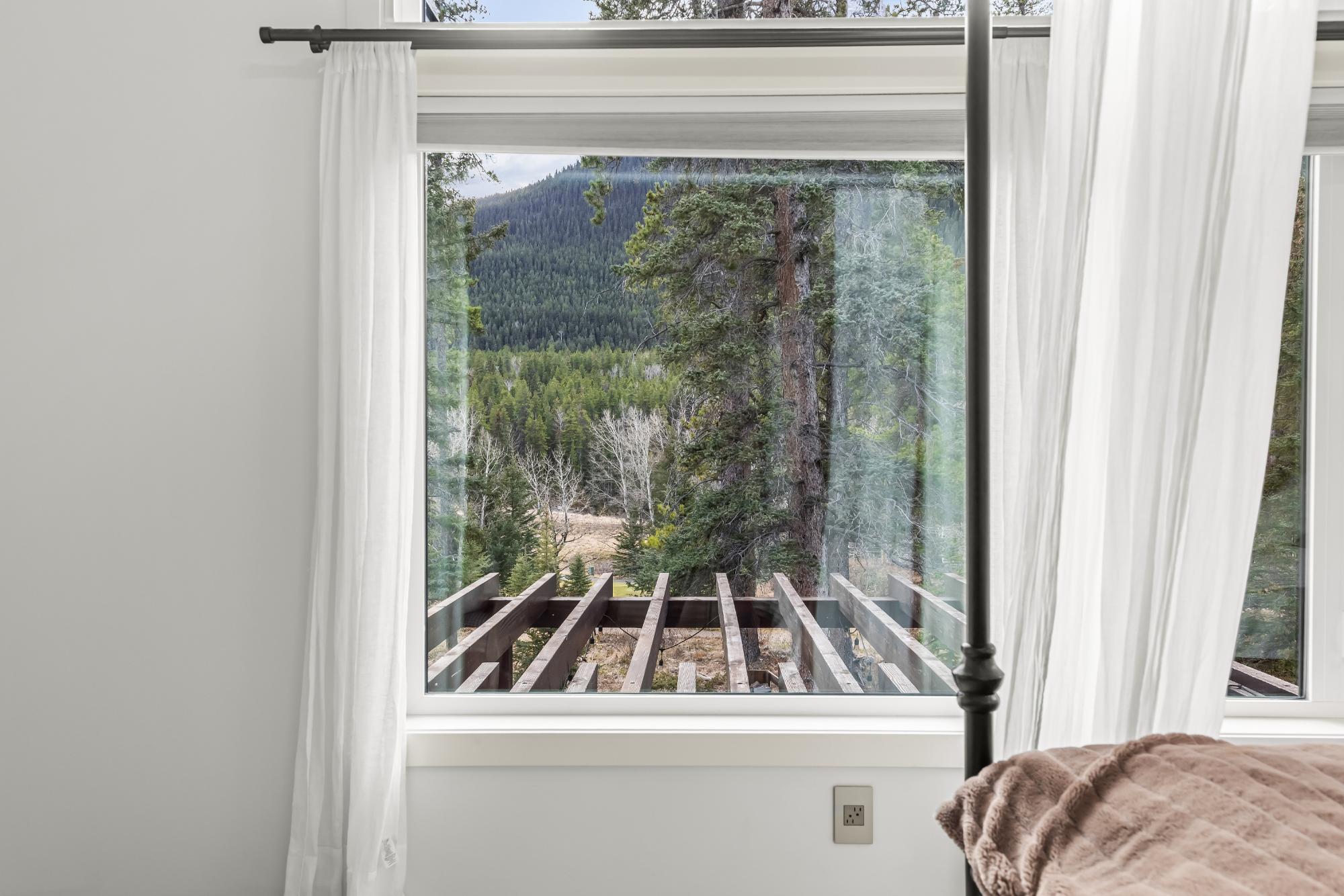 Discover mountain-modern living on the 10th hole of Stewart Creek Golf Course. This thoughtfully designed 4-bed, 4-bath home offers over 3,500 sq ft of bright, functional space with timber beams, large windows, and a warm alpine aesthetic. Enjoy an unobstructed and private backdrop ,creating a sense of calm and separation rarely found. Built with environmental and safety features, including solar panels and Fire-Smart roof sprinklers, the home blends modern efficiency with mountain style. The open-concept main level connects the kitchen, dining, and living areas, ideal for everyday living and entertaining. The private yard is a true retreat, featuring a sunken hot tub, fire pit, underground sprinklers, and thoughtful landscaping. Upstairs offers bright bedrooms and a welcoming primary suite, while the lower level provides flexible space for a gym, media room, or guests. Set in a quiet, scenic neighborhood with direct access to mountain recreation, this home