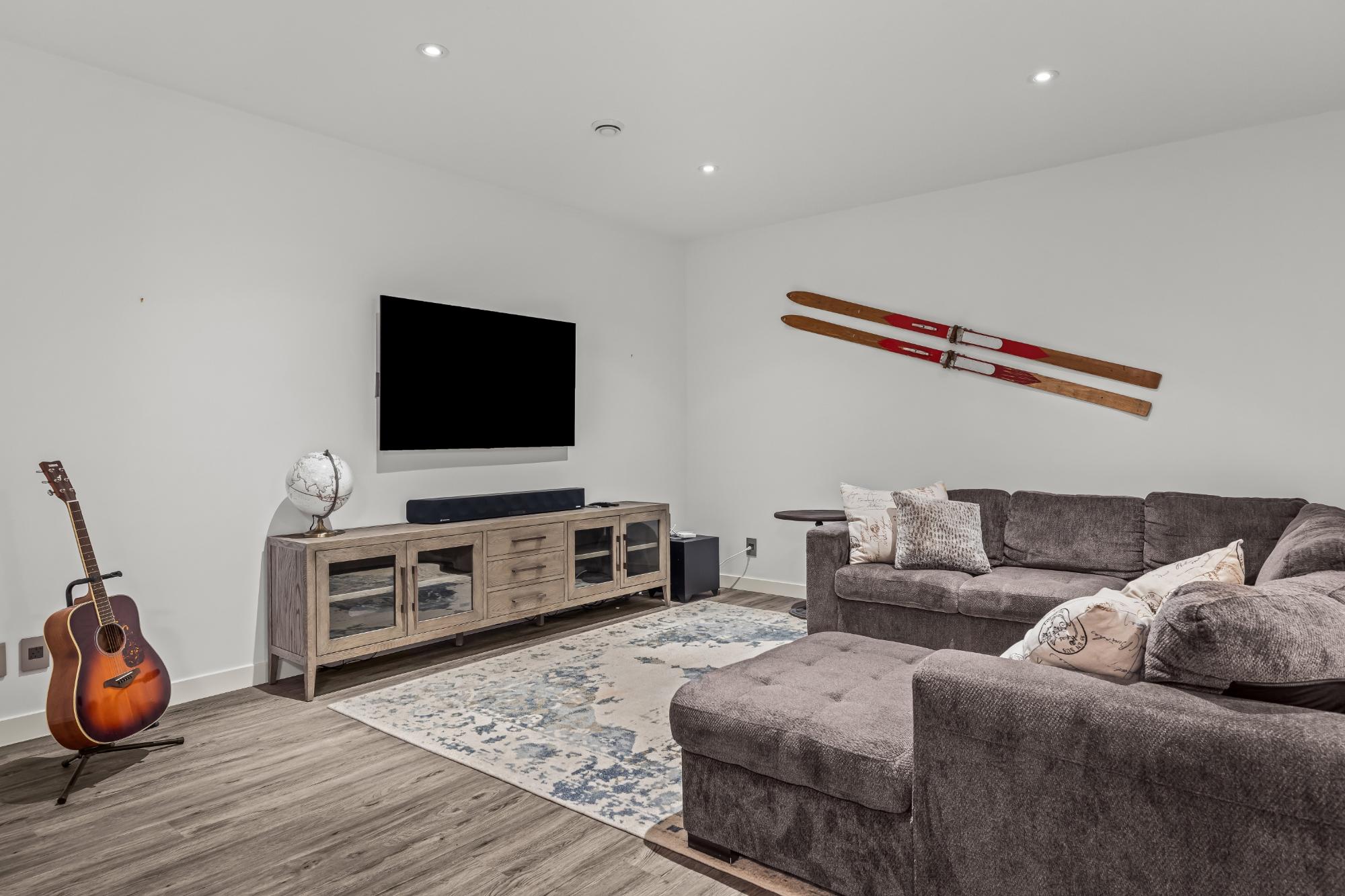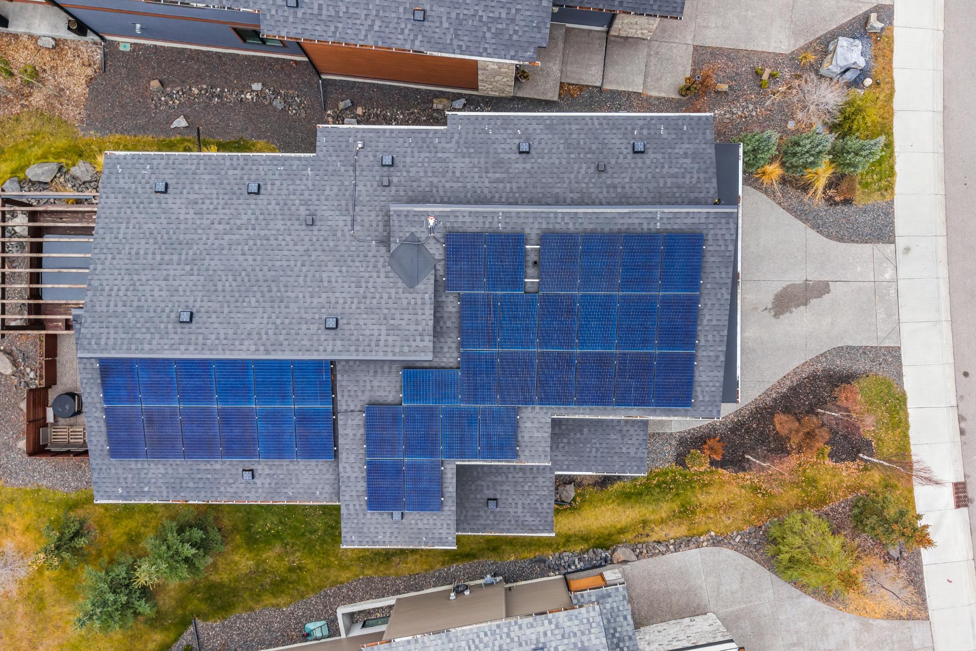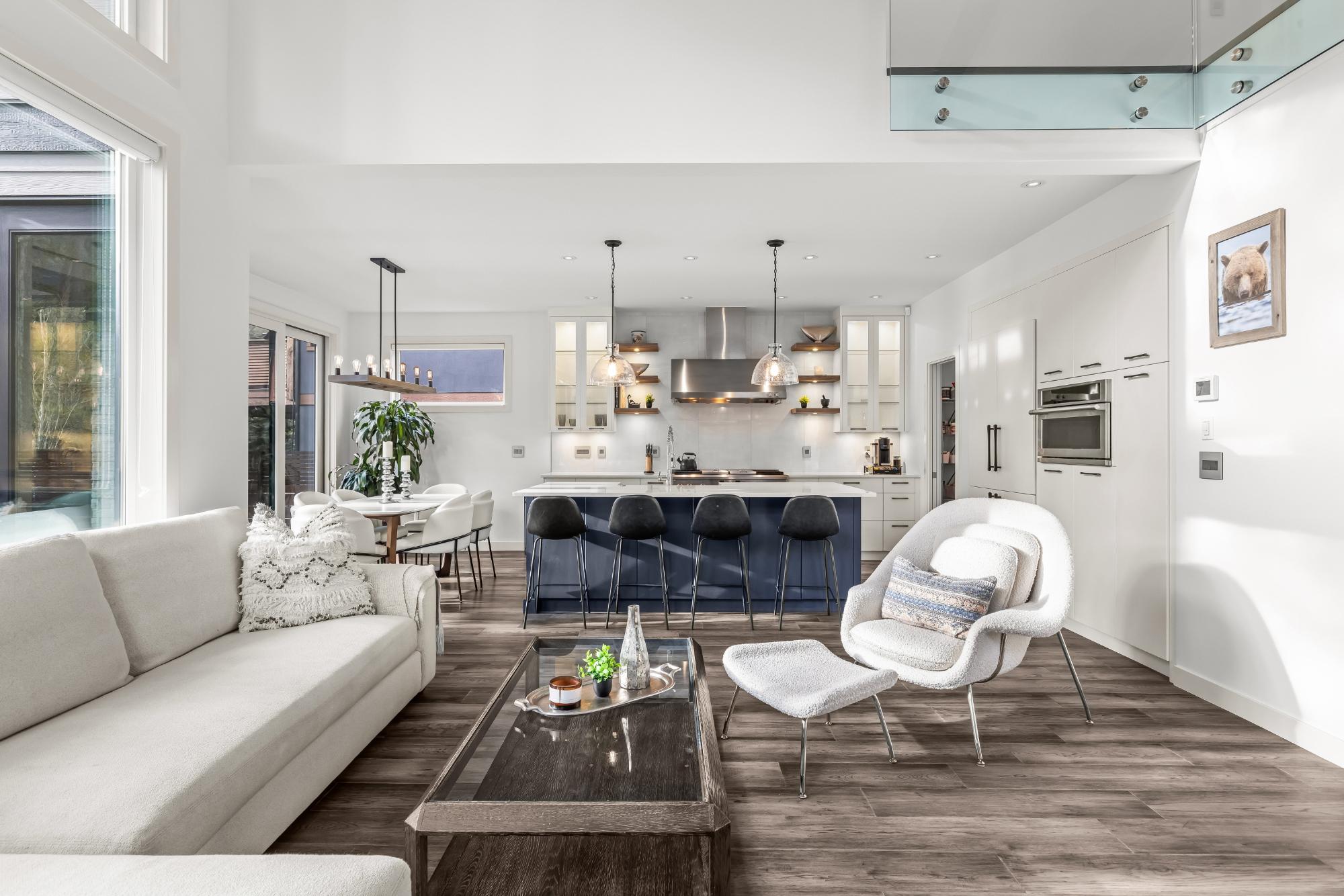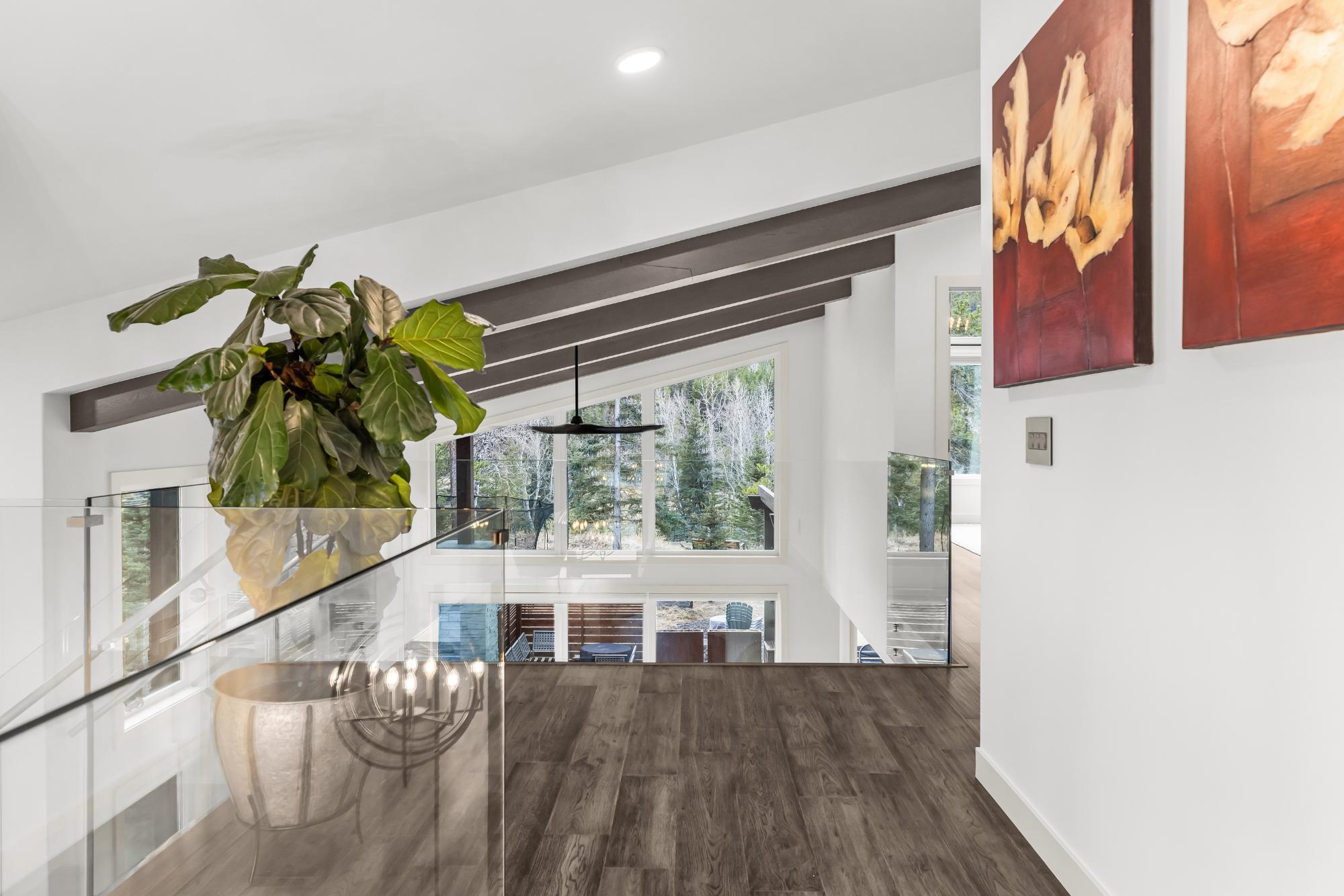 Discover mountain-modern living on the 10th hole of Stewart Creek Golf Course. This thoughtfully designed 4-bed, 4-bath home offers over 3,500 sq ft of bright, functional space with timber beams, large windows, and a warm alpine aesthetic. Enjoy an unobstructed and private backdrop ,creating a sense of calm and separation rarely found. Built with environmental and safety features, including solar panels and Fire-Smart roof sprinklers, the home blends modern efficiency with mountain style. The open-concept main level connects the kitchen, dining, and living areas, ideal for everyday living and entertaining. The private yard is a true retreat, featuring a sunken hot tub, fire pit, underground sprinklers, and thoughtful landscaping. Upstairs offers bright bedrooms and a welcoming primary suite, while the lower level provides flexible space for a gym, media room, or guests. Set in a quiet, scenic neighborhood with direct access to mountain recreation, this home