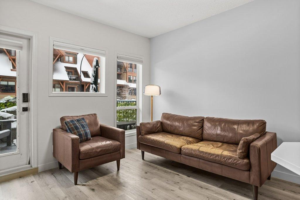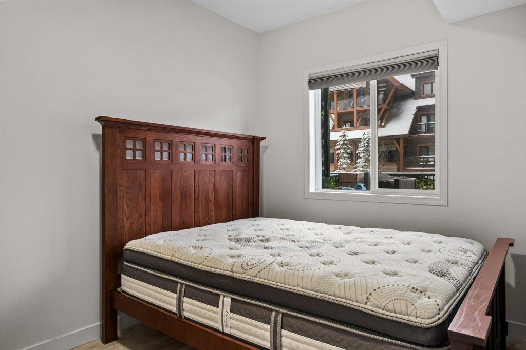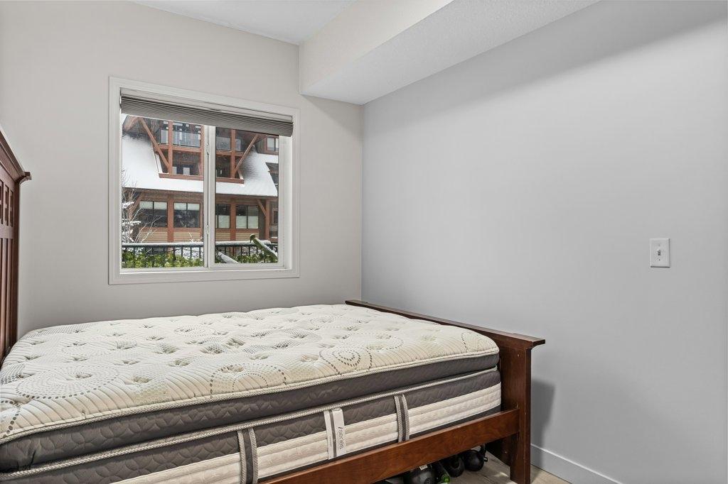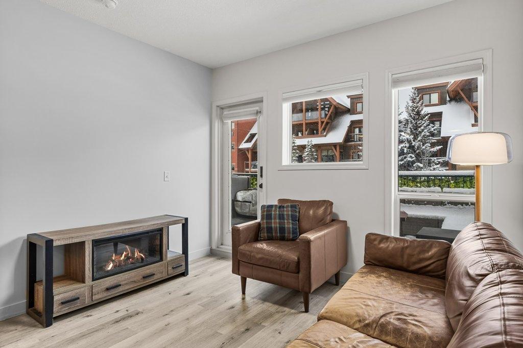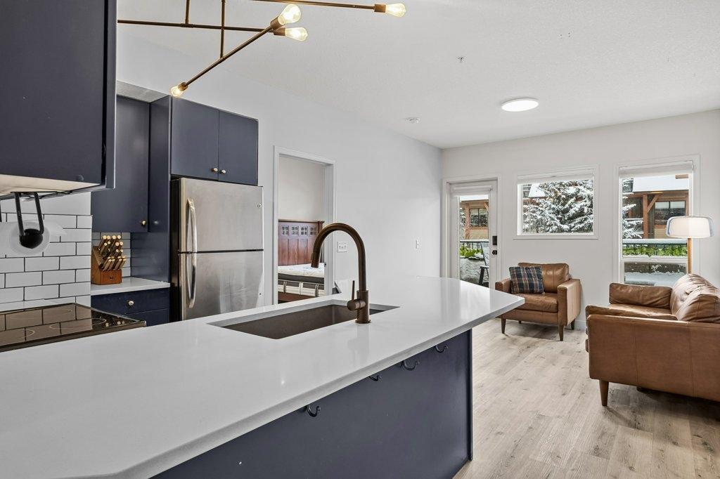 This updated 2-bed, 1-bath condo is a fantastic opportunity for singles, couples, young families and first-time home buyers. Located just steps from downtown, it offers modern style and everyday convenience at a great value. Inside, enjoy stainless steel appliances, white granite counters with matching backsplash, vinyl floors, and fresh paint. The spacious living area opens onto a large sunny balcony with South-facing mountain views - perfect as extra summer living space. The primary bedroom is generously sized. Practical perks include two underground parking stalls (titled and assigned), bike storage, an assigned secure storage cage, elevator access, and pet-friendly living. Low condo fees and taxes keep ownership affordable. Zoning requires residents to work in Canmore for at least 20 hours per week (or after 2 years in Canmore, the Bow Valley). A stylish, move-in-ready home with everything you need—at an unbeatable entry-level price point. Easy to show contact your Realtor now