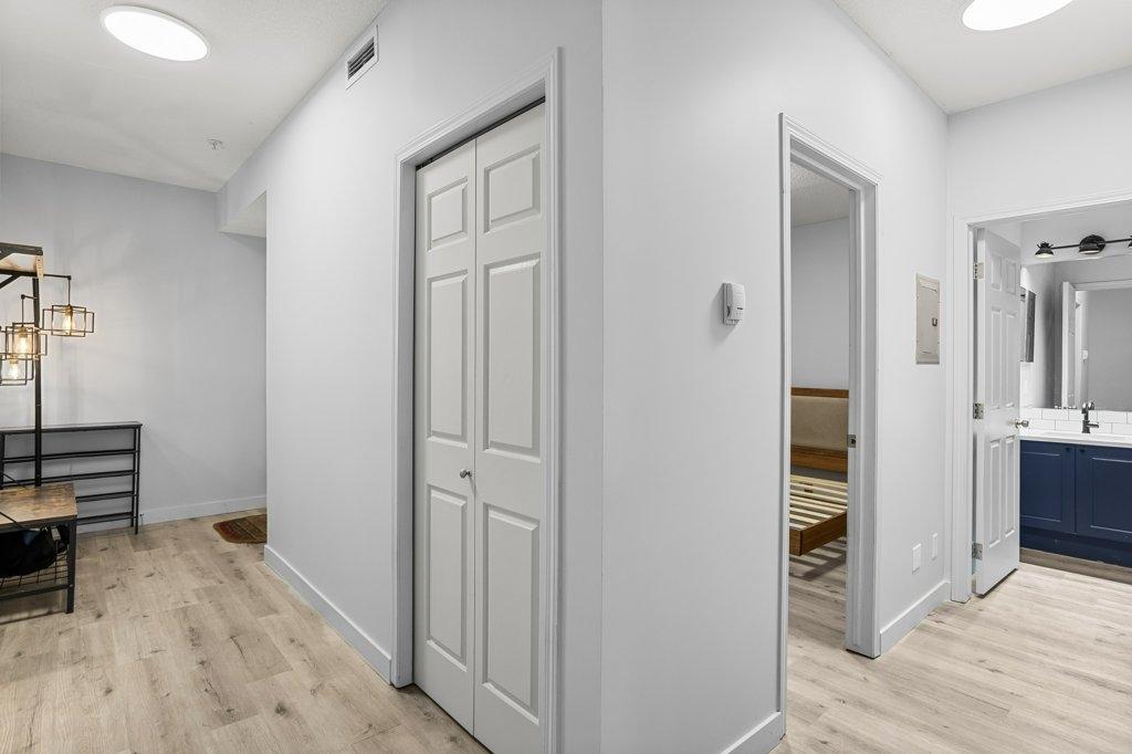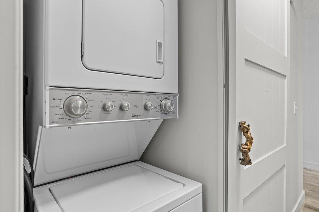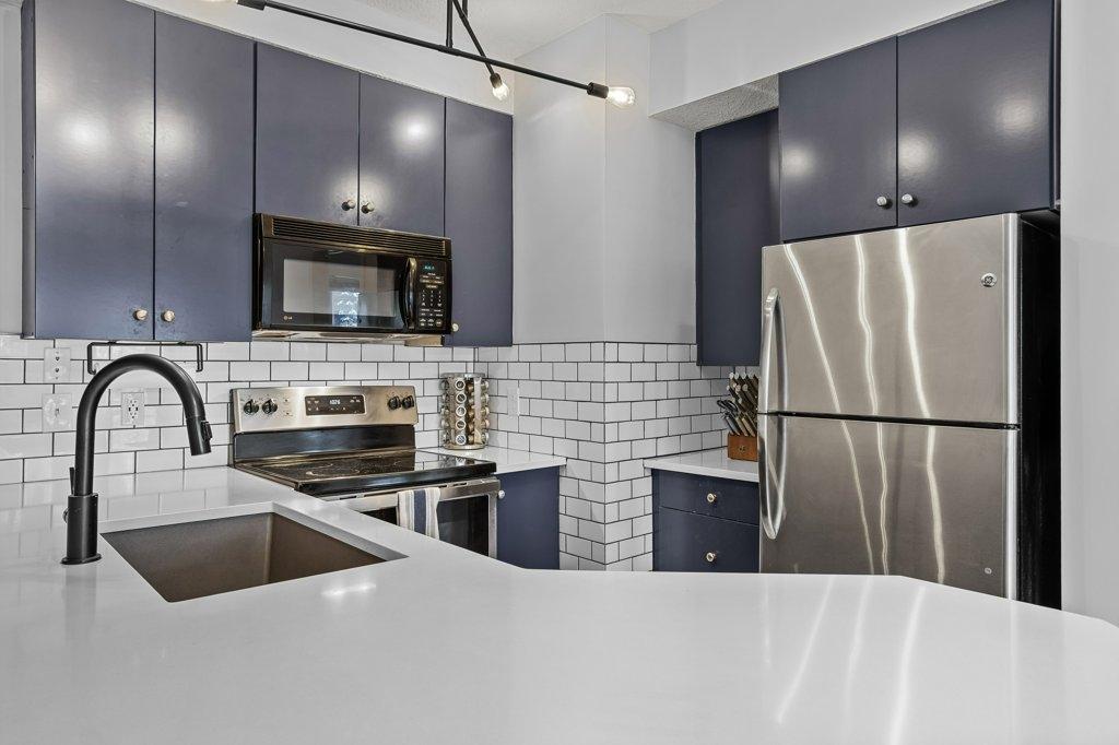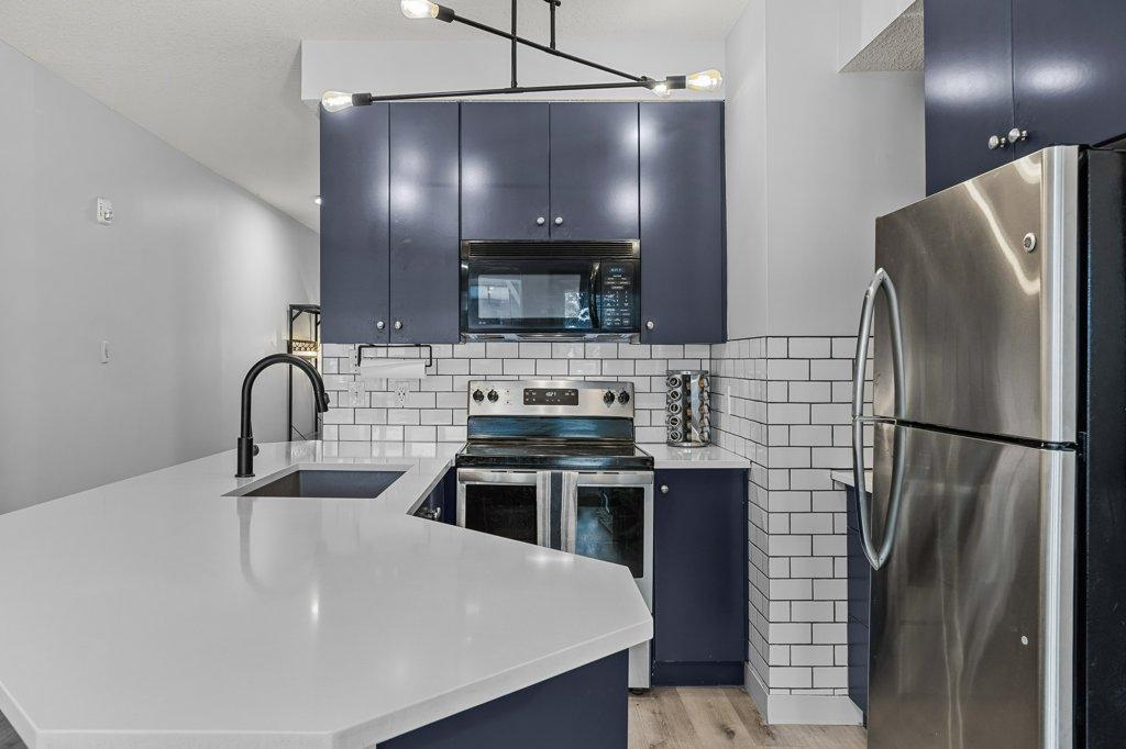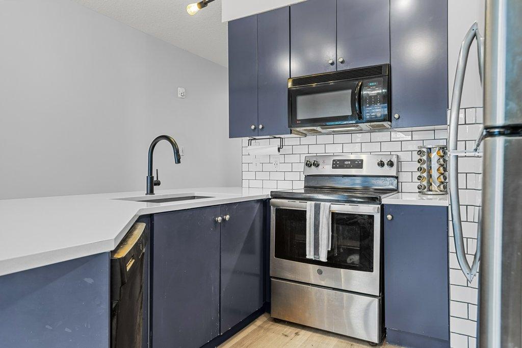 This updated 2-bed, 1-bath condo is a fantastic opportunity for singles, couples, young families and first-time home buyers. Located just steps from downtown, it offers modern style and everyday convenience at a great value. Inside, enjoy stainless steel appliances, white granite counters with matching backsplash, vinyl floors, and fresh paint. The spacious living area opens onto a large sunny balcony with South-facing mountain views - perfect as extra summer living space. The primary bedroom is generously sized. Practical perks include two underground parking stalls (titled and assigned), bike storage, an assigned secure storage cage, elevator access, and pet-friendly living. Low condo fees and taxes keep ownership affordable. Zoning requires residents to work in Canmore for at least 20 hours per week (or after 2 years in Canmore, the Bow Valley). A stylish, move-in-ready home with everything you need—at an unbeatable entry-level price point. Easy to show contact your Realtor now