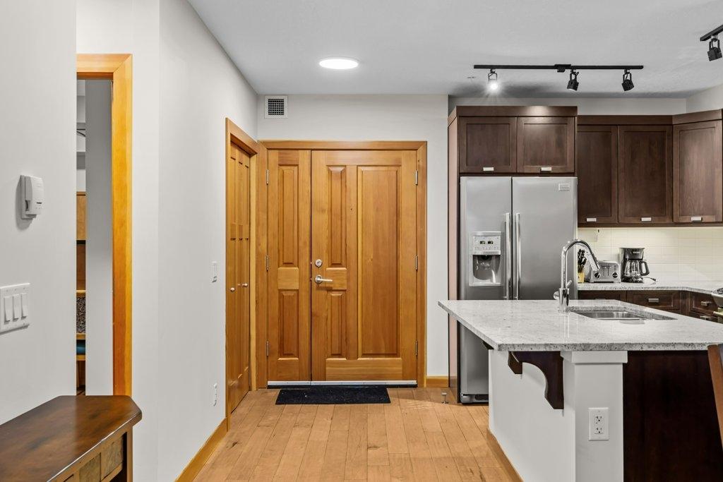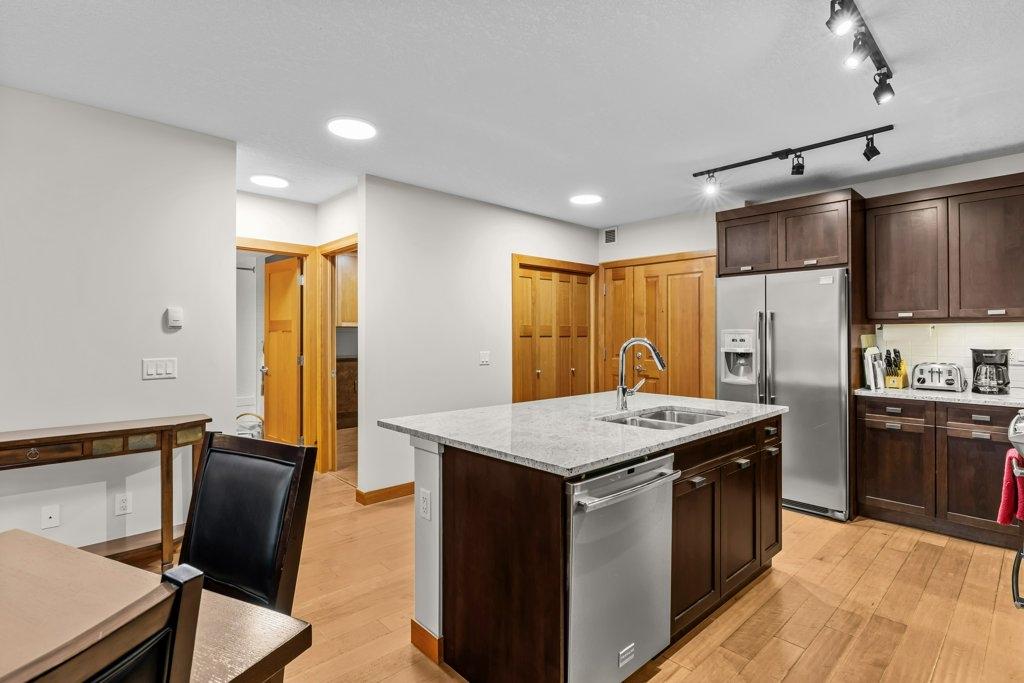 This inviting 1-bedroom+den, 2-bath home offers a well-designed 921 sq. ft. layout that perfectly balances gathering spaces with private retreats. Beautifully upgraded, it features a modern kitchen and bathrooms with custom wood cabinetry and quality finishes throughout. Sold fully furnished, this turn-key property is ideal for personal or family use, or as a long-term rental mountain retreat. The primary bedroom is a relaxing sanctuary with an updated ensuite, while the den’s Murphy bed allows the space to function as both a bedroom and a home office. Located in the highly sought-after Serenity Ridge development in Stewart Creek, residents enjoy a quiet setting with easy access to trails, golf, shopping, and schools. Amenities include secure underground parking, onsite storage, a hot tub, and an owner’s lounge. With its style, flexibility, and prime location, this move-in-ready home should be on your short list—come experience the Canmore lifestyle. It is calling you ‘HOME’.