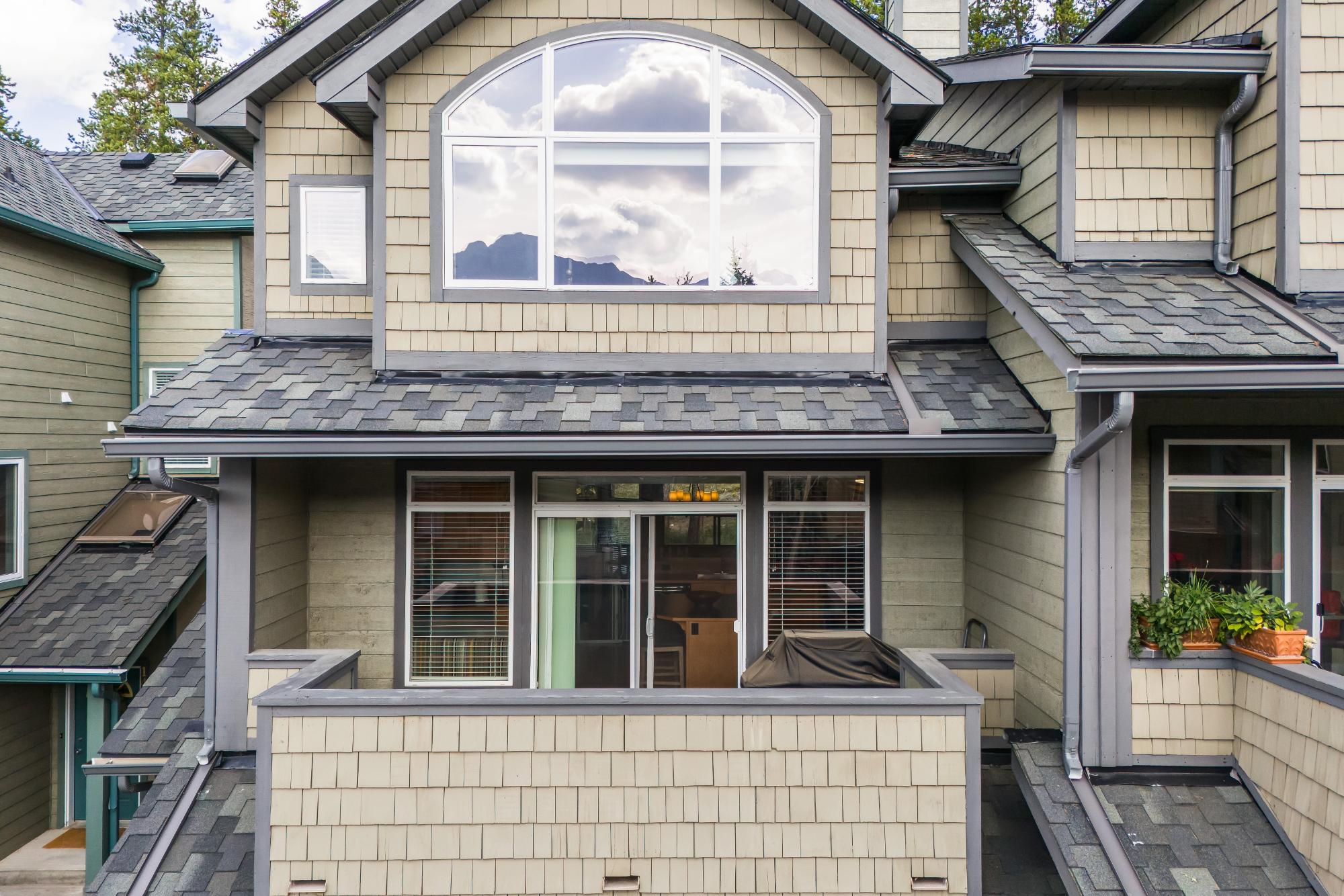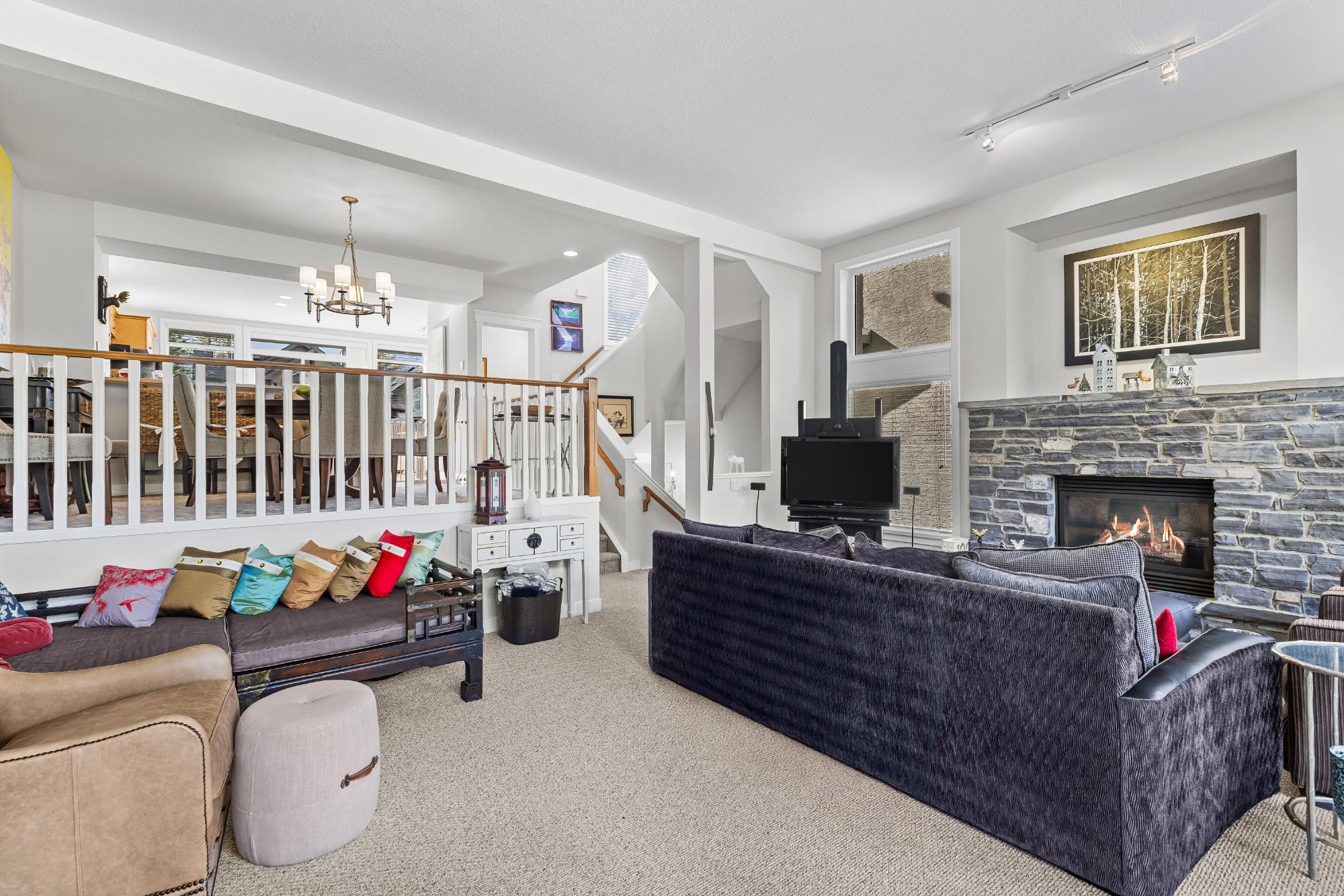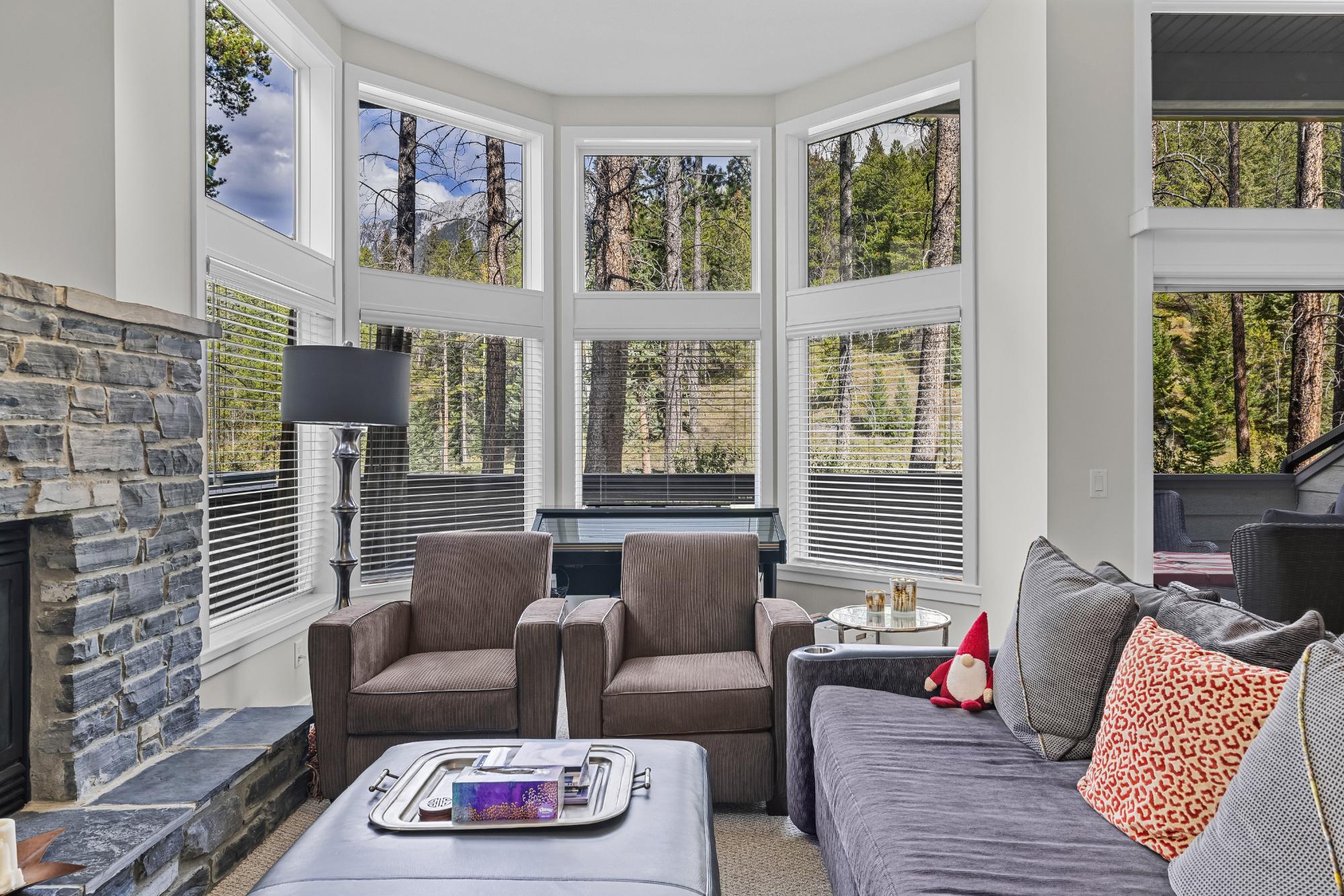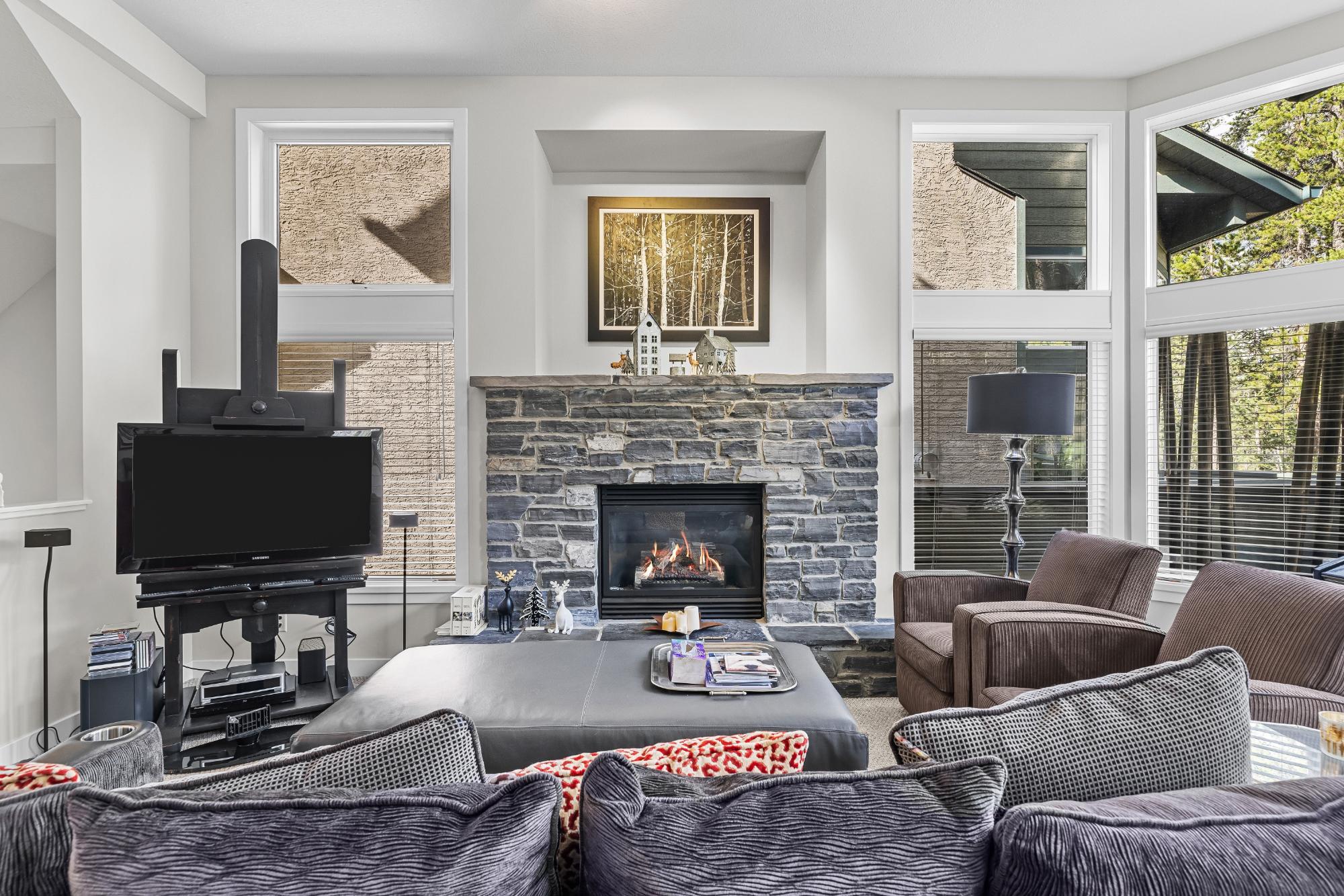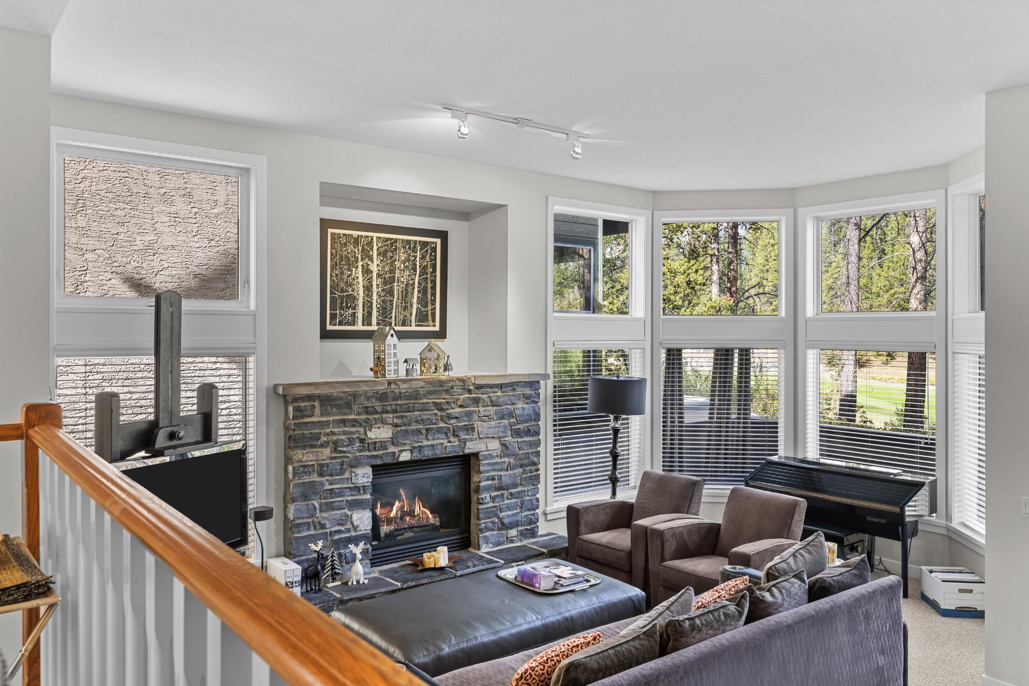A rare opportunity in Aspen Glen, Grizzly Ridge — a serene end-unit townhome tucked along the coveted fairways of Silvertip Golf Course. This spacious 3-bed, 4-bath home blends mountain charm with thoughtful design. Skylights over the foyer and staircase brighten the entry, while the sunken living room boasts soaring ceilings and a wall of windows overlooking hole #1. A cozy fireplace, spacious dining room, and breakfast nook highlight sweeping views of the iconic Three Sisters. Upstairs, two bedrooms each enjoy their own ensuite, plus laundry for convenience. The lower level offers flexibility with an optional third bedroom or family room, complete with fireplace and 4-piece bath. With air conditioning, a double-car garage, abundant light, privacy, and its end-unit setting, this townhome is perfect as a full-time home, weekend retreat, or gathering place for family and friends. Backed by golf course serenity and fronted by mountain views, it embodies the Canmore lifestyle
