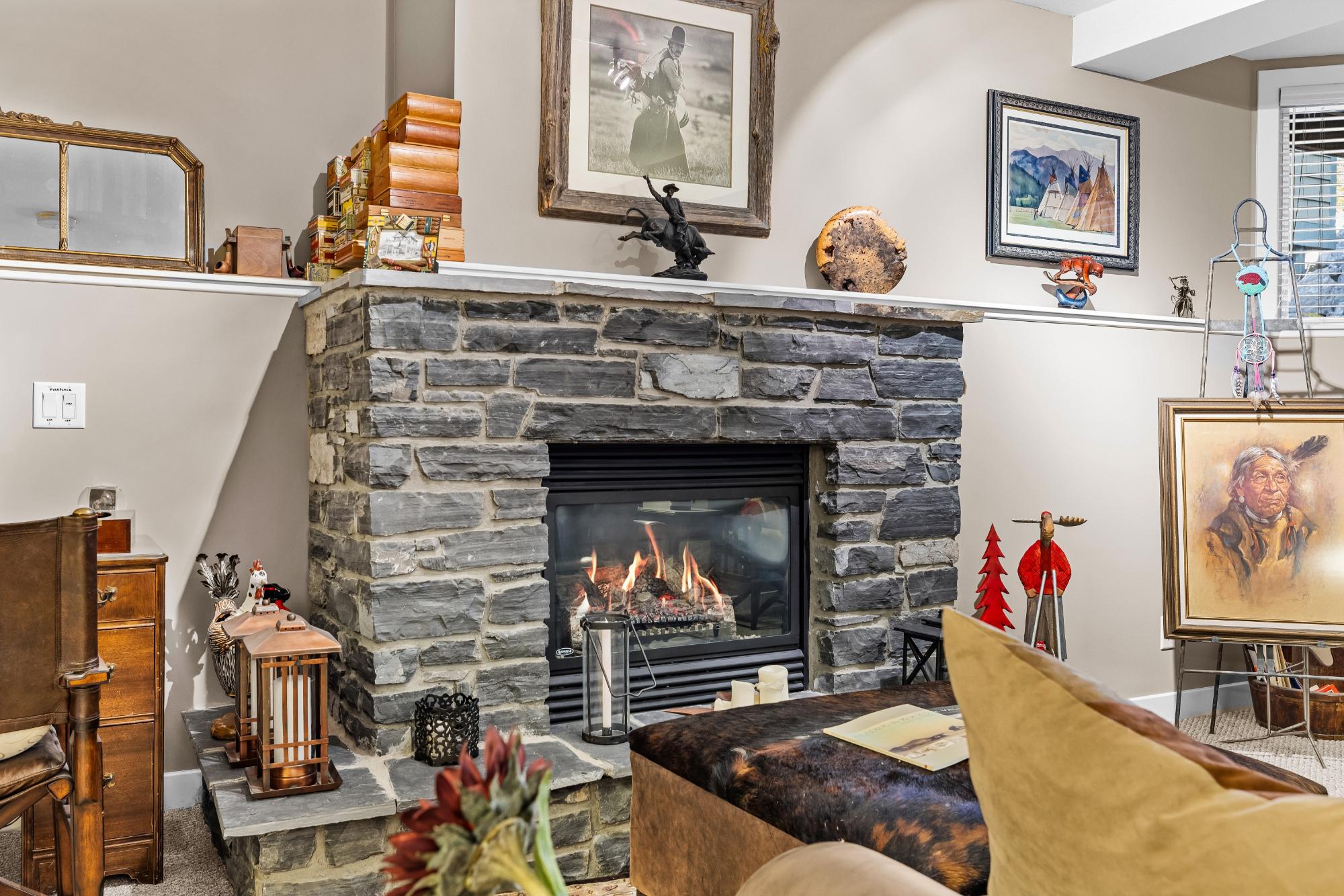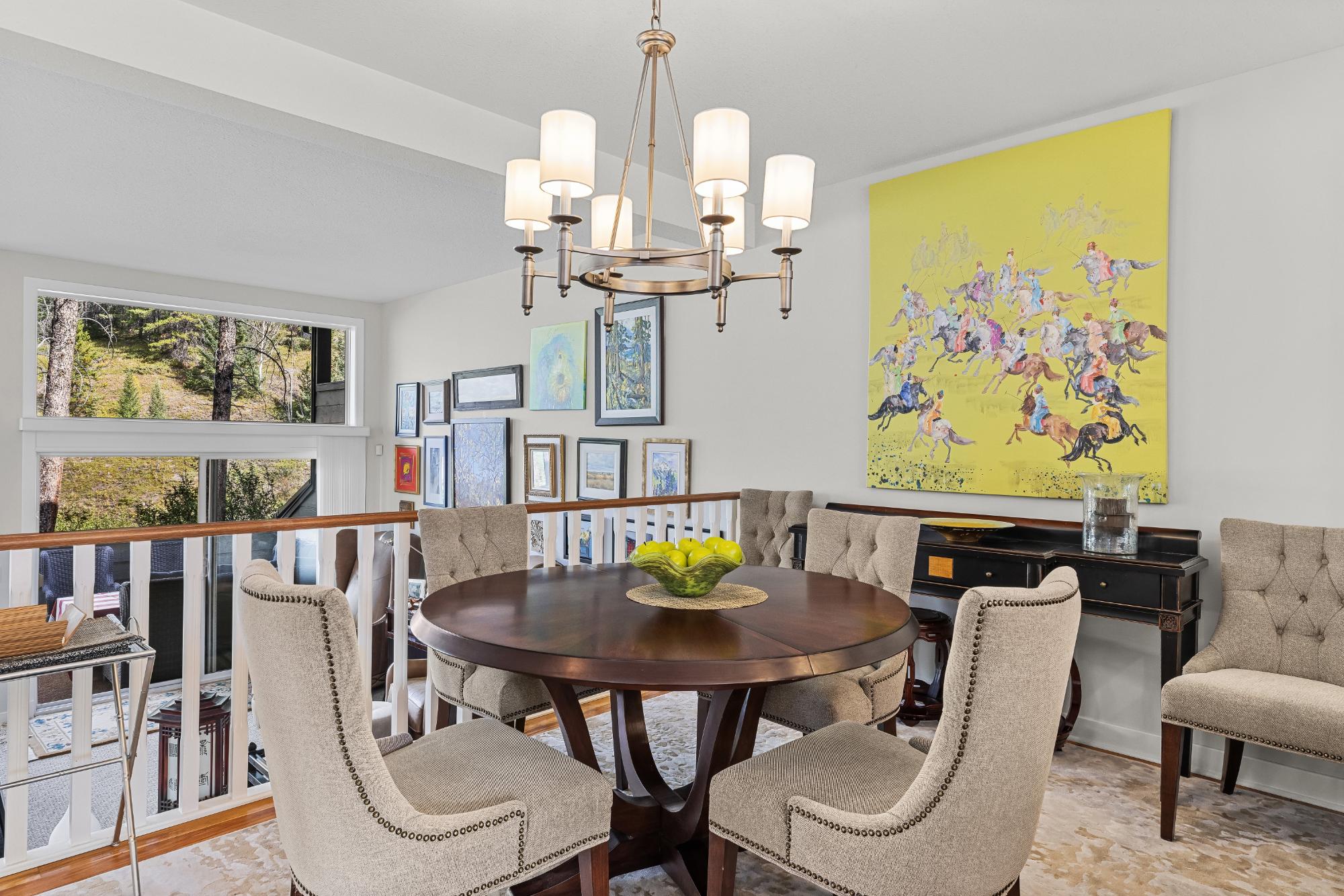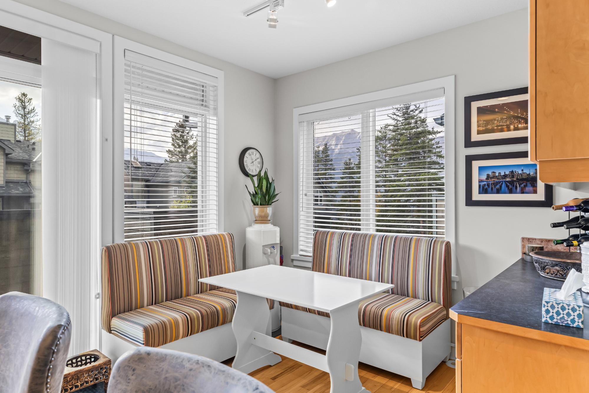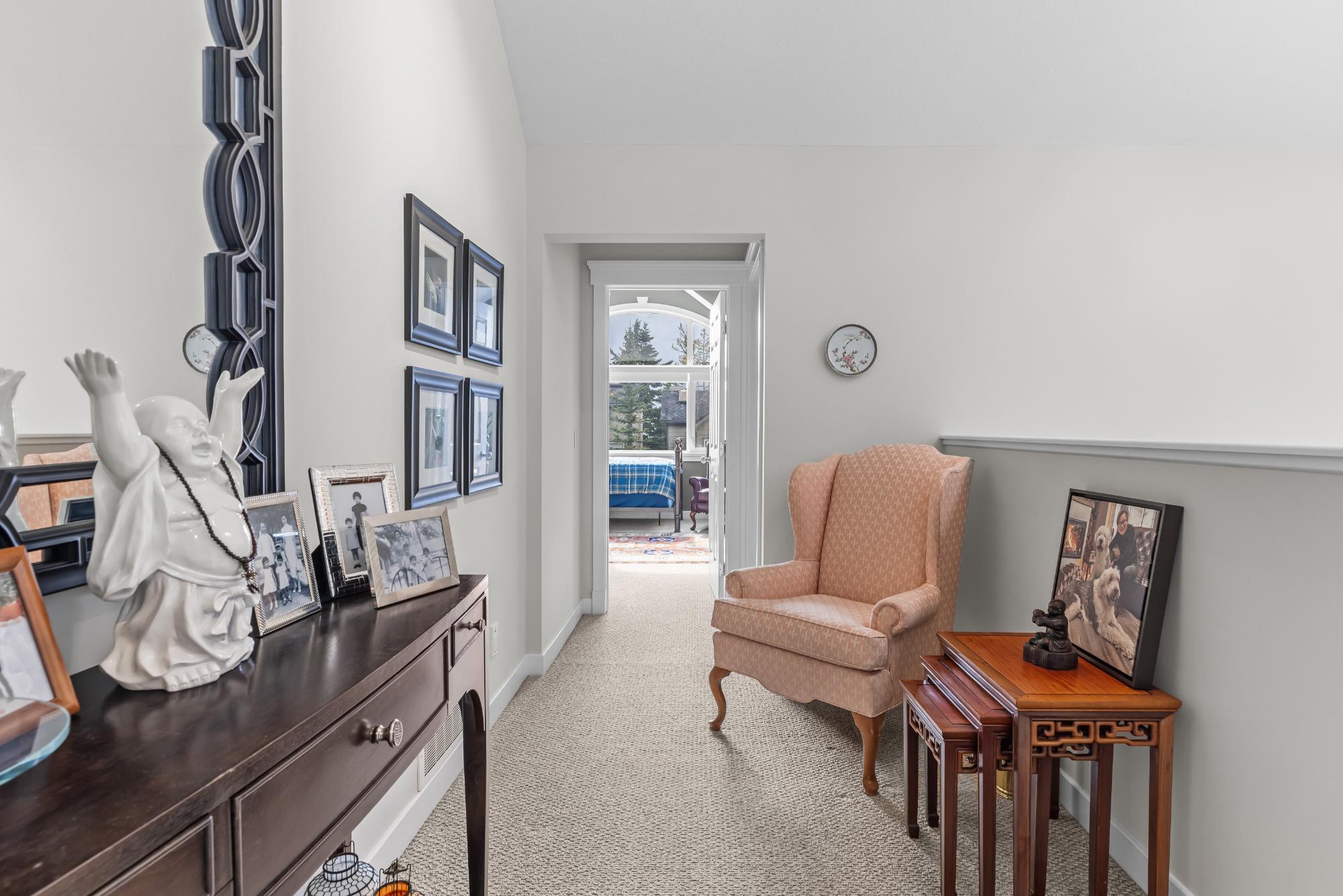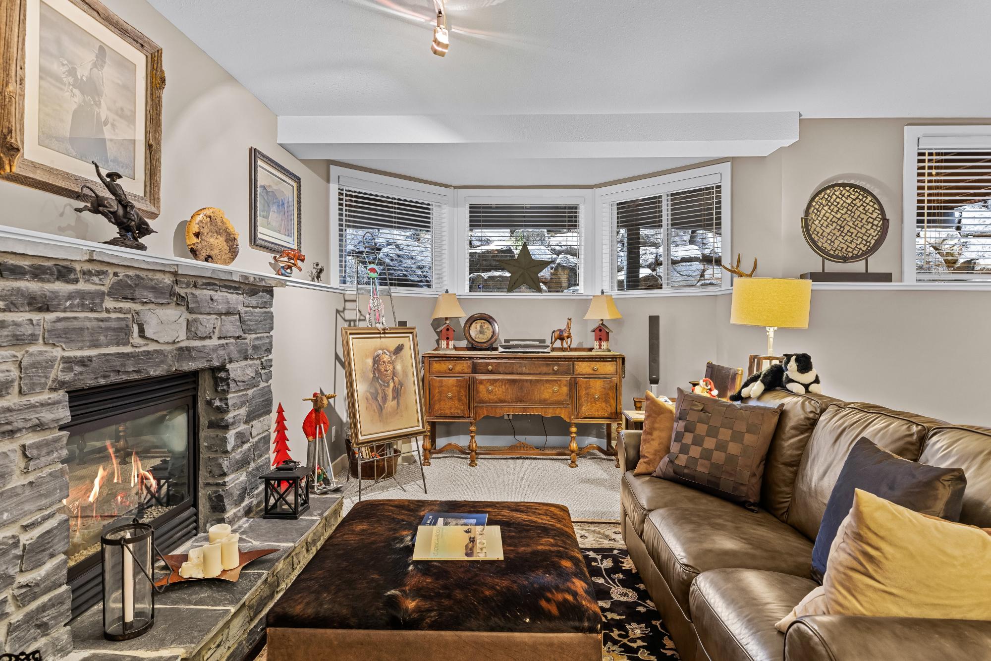 A rare opportunity in Aspen Glen, Grizzly Ridge — a serene end-unit townhome tucked along the coveted fairways of Silvertip Golf Course. This spacious 3-bed, 4-bath home blends mountain charm with thoughtful design. Skylights over the foyer and staircase brighten the entry, while the sunken living room boasts soaring ceilings and a wall of windows overlooking hole #1. A cozy fireplace, spacious dining room, and breakfast nook highlight sweeping views of the iconic Three Sisters. Upstairs, two bedrooms each enjoy their own ensuite, plus laundry for convenience. The lower level offers flexibility with an optional third bedroom or family room, complete with fireplace and 4-piece bath. With air conditioning, a double-car garage, abundant light, privacy, and its end-unit setting, this townhome is perfect as a full-time home, weekend retreat, or gathering place for family and friends. Backed by golf course serenity and fronted by mountain views, it embodies the Canmore lifestyle