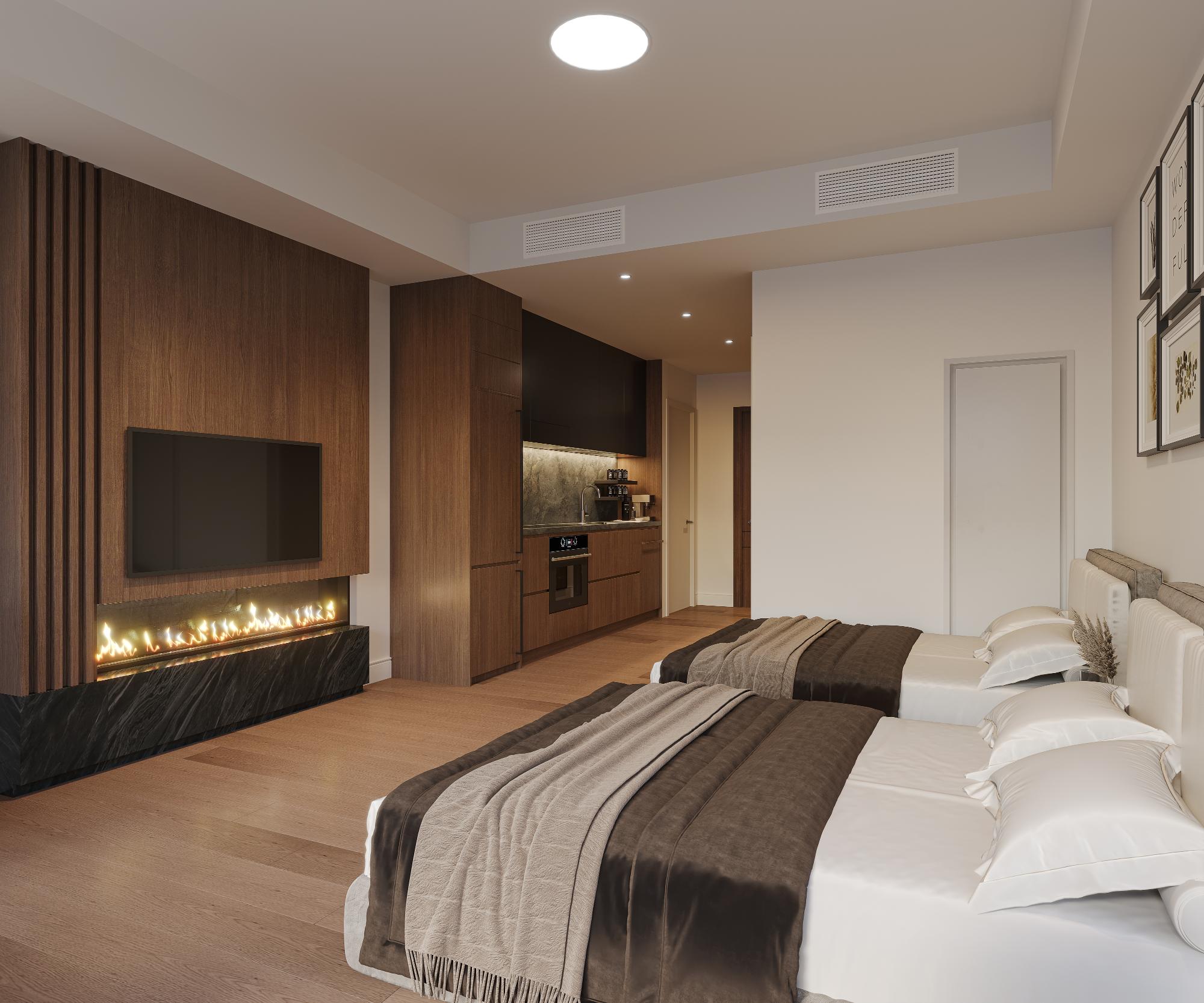 Experience refined mountain living in this modern studio suite at Rundle Park, offering 390 sq ft of thoughtfully designed living space. This stunning unit features elevated contemporary finishes, a 3-piece bath, stainless steel appliances, a cozy fireplace, and an inviting indoor/outdoor solarium — perfect for soaking in the mountain air year-round. Rundle Park sets a new standard for alpine lifestyle with Nordic-inspired amenities designed for relaxation and rejuvenation. Enjoy a sophisticated hydrotherapy experience complete with an outdoor pool featuring two temperature zones, a sunken firepit lounge, and sauna pods, cabanas, and a warming room that create a true spa-like escape. Families will appreciate the outdoor playground and the Airstream trailer playroom, while fitness enthusiasts can stay active in the state-of-the-art fitness studio framed by a stunning mountain backdrop. Don't miss the opportunity to make this retreat your own!