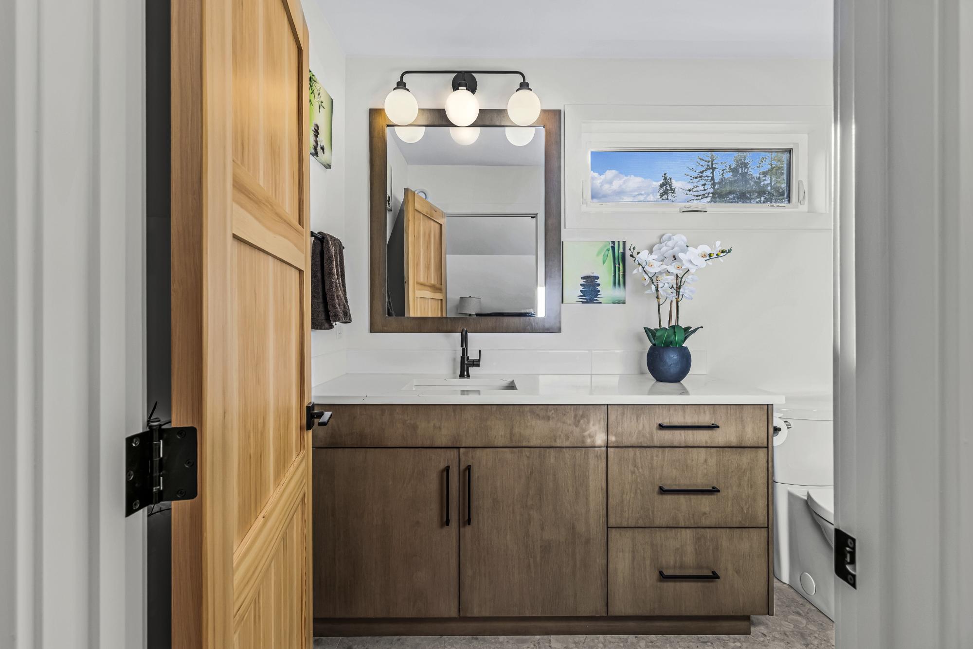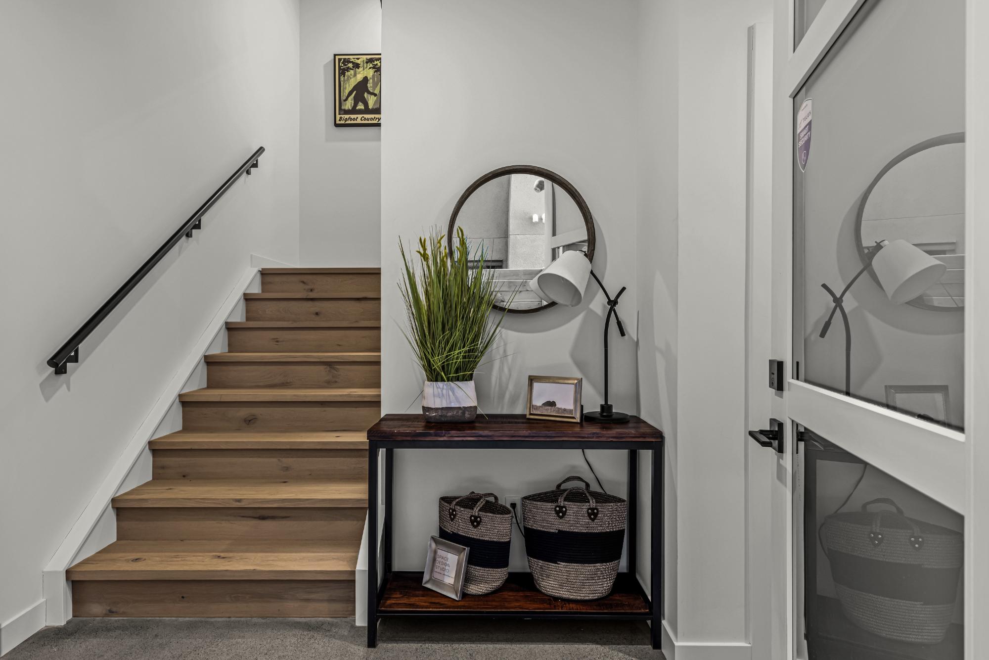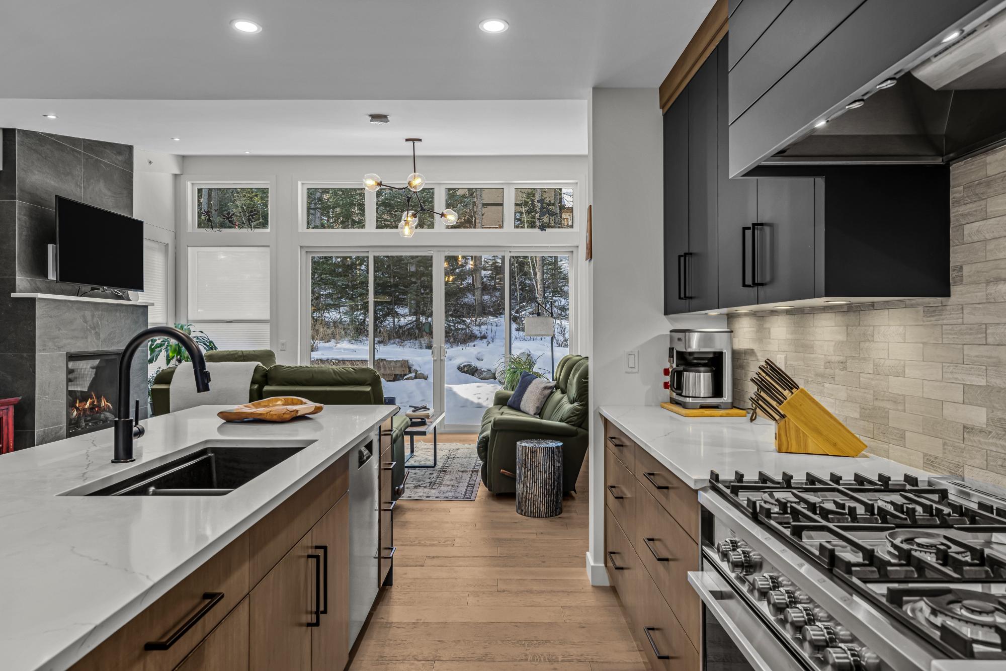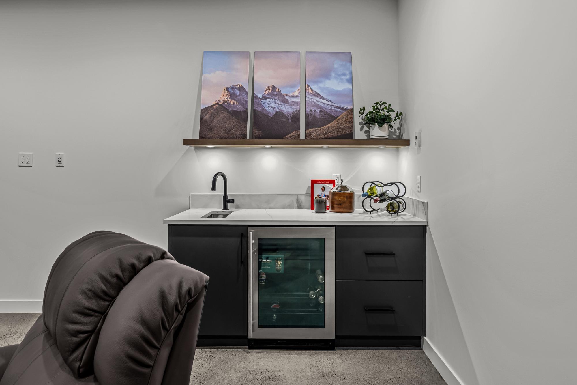 Step into luxury living with this stunning 4 bedroom, 5 bathroom modern built home by Lakusta Custom Homes, who are known for their quality craftsmanship, attention to detail, and refined mountain design. The layout features 2671sqft of livable space spread over 3 levels, with the open concept living and dining area anchoring the home with sleek kitchen appliances and an expansive island leading to a wall of windows that flood the great room with natural light. Outdoor living extends seamlessly with a spacious upper-level patio spanning the entire back of the home. The primary suite is a true retreat, complete with a soaking tub with a separate luxurious walk-in tiled shower, and serene mountain views from the king bed. Upstairs, two spacious bedrooms each with their own spa inspired bathroom and elevated design elements. Downstairs, there is a media lounge with custom bar, including additional guest space with a large bedroom and 3pc bathroom and access to the garage.