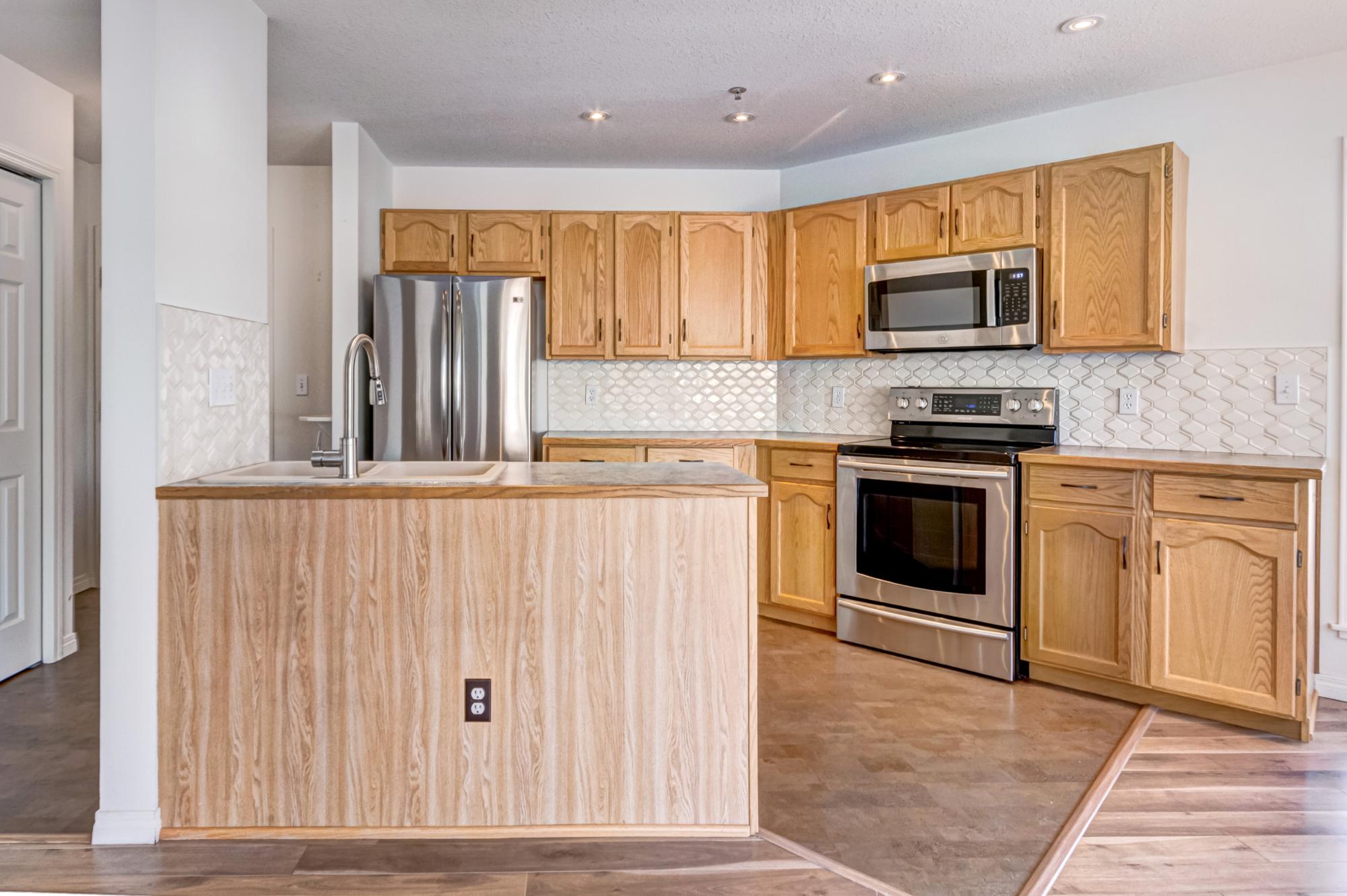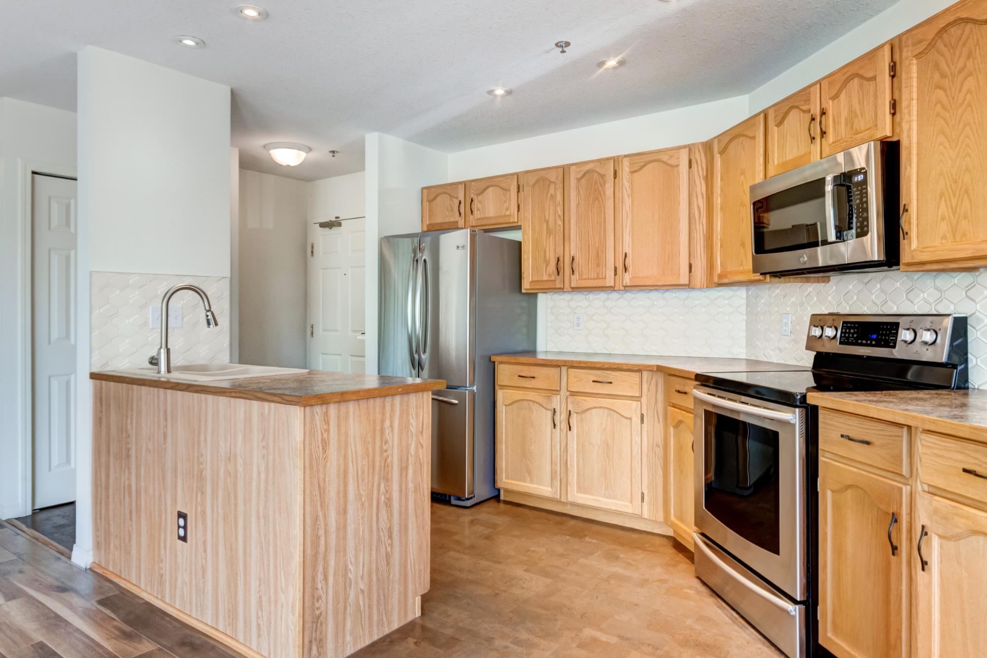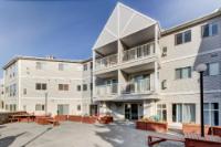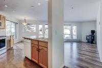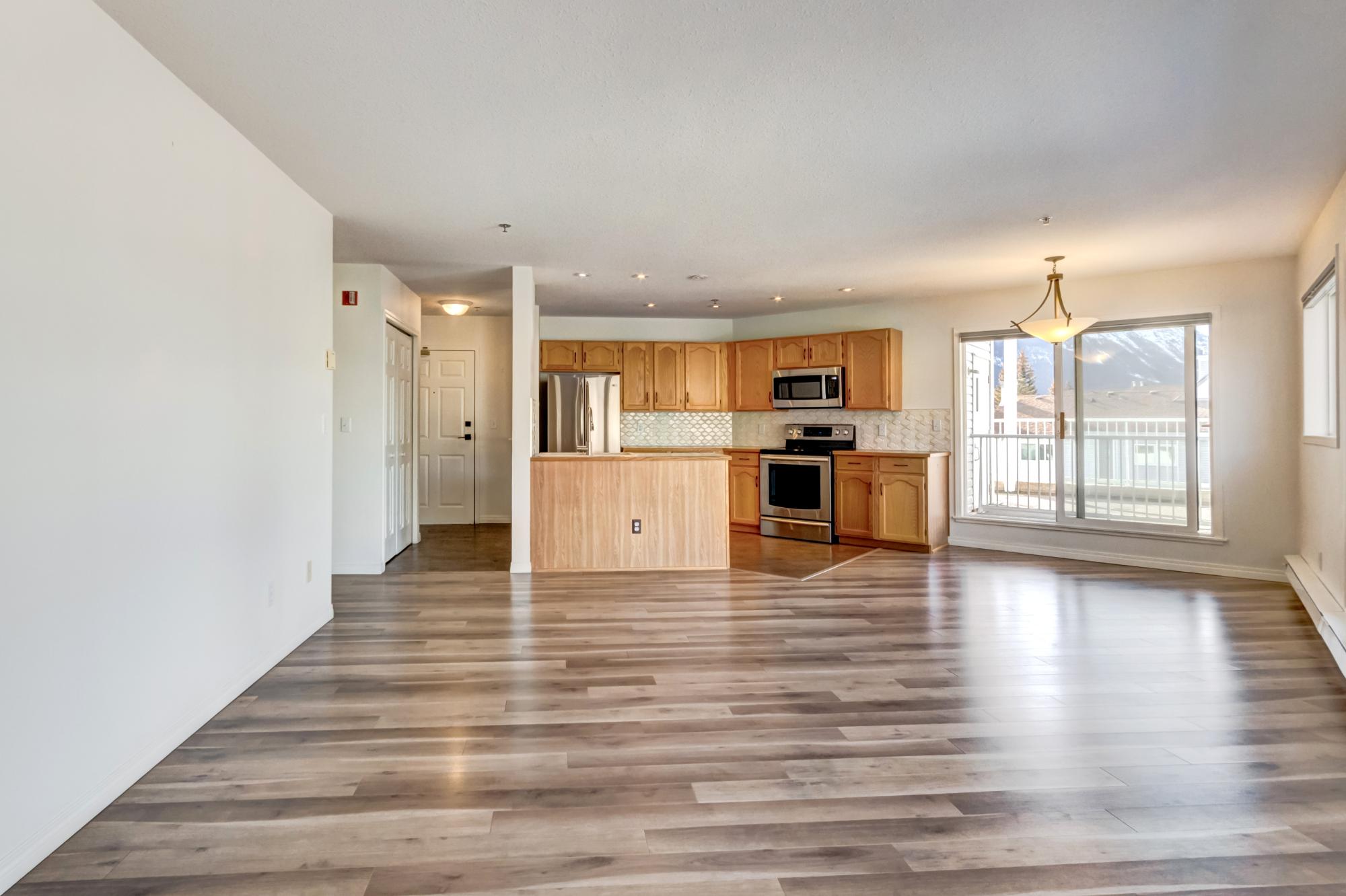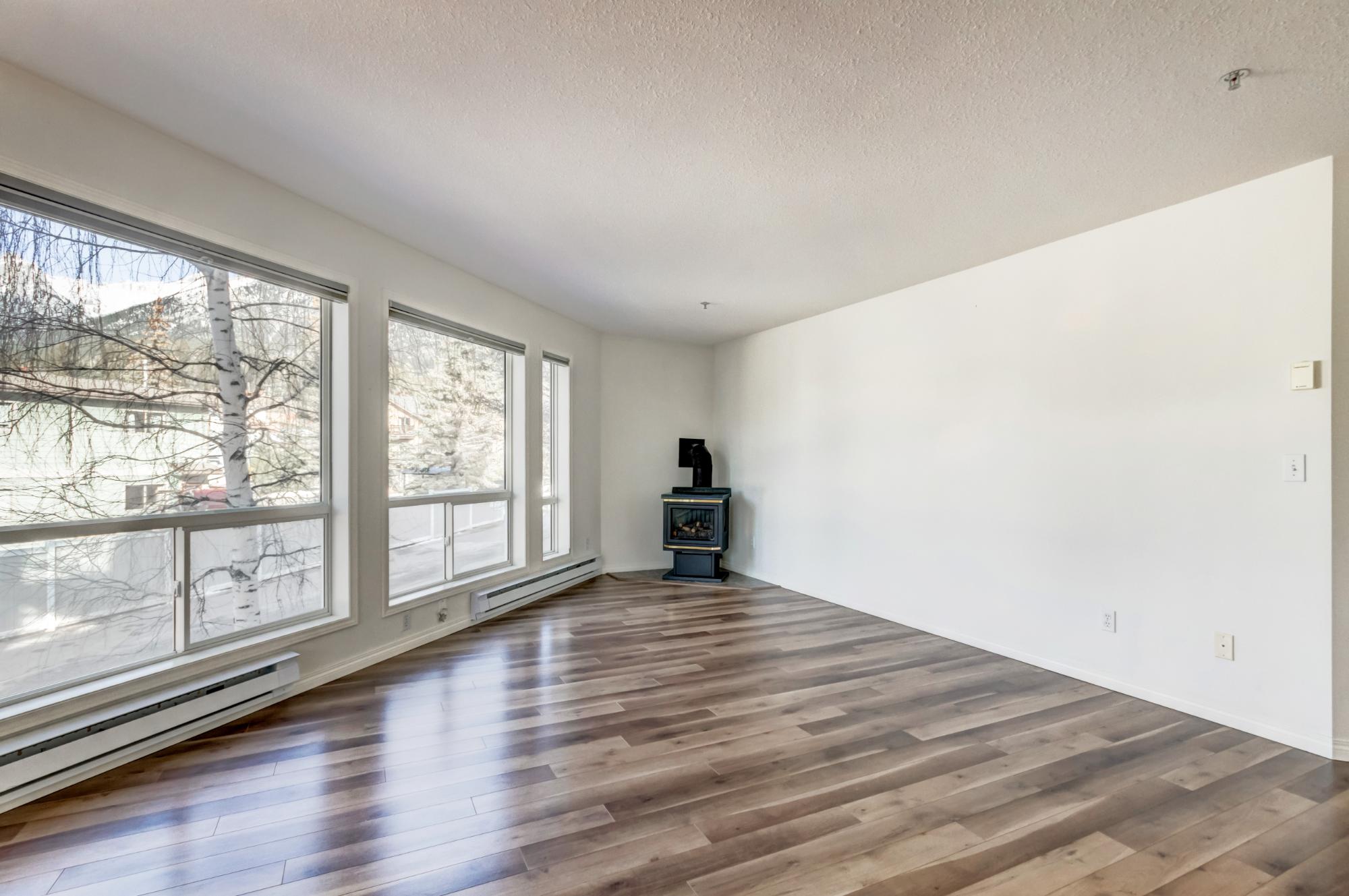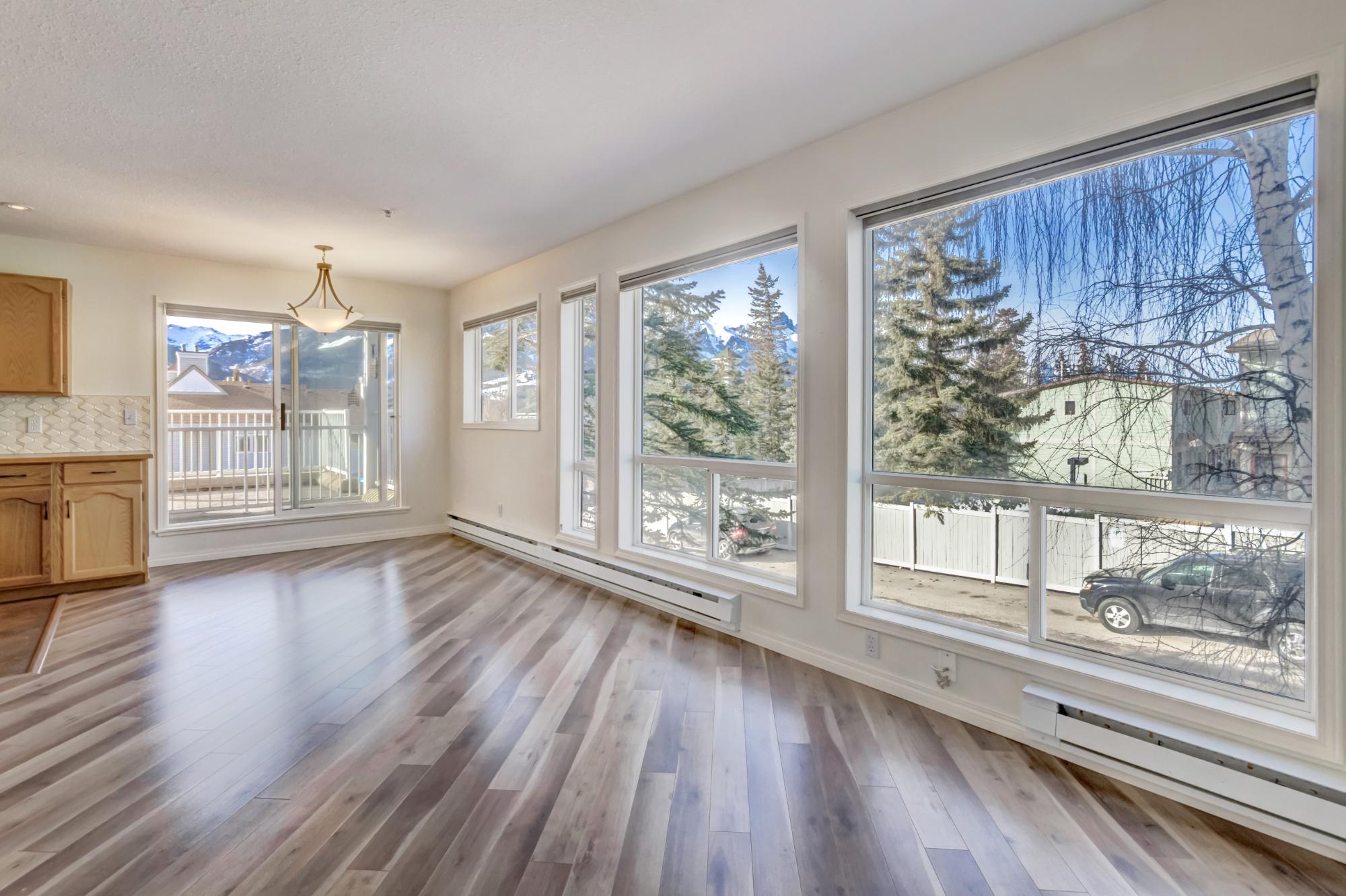 This bright two bedroom, two bathroom corner suite offers over 980 sqft of single level living, perfectly positioned to capture breathtaking mountain views. Oversized windows and the coveted corner location flood the home with natural light, while its sunny valley side setting enhances the warm, inviting atmosphere. The open concept kitchen, dining and living area is ideal for both everyday living and entertaining, anchored by a cozy fireplace. Step outside to the spacious private patio, an extension of the living space and the perfect spot to relax and take in the surrounding alpine scenery. The primary bedroom features a walk in closet and private ensuite, while a second bedroom, full bathroom, walk-in laundry room and ample storage complete the layout. Residents enjoy excellent on site amenities, including an outdoor hot tub, a common gathering space, underground parking and storage. Located just steps from hiking and biking trails plus numerous Bow Valley attractions.