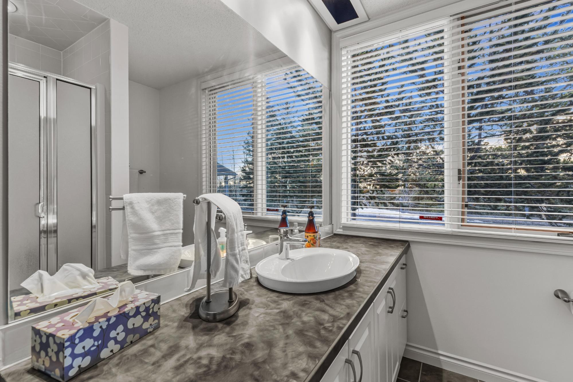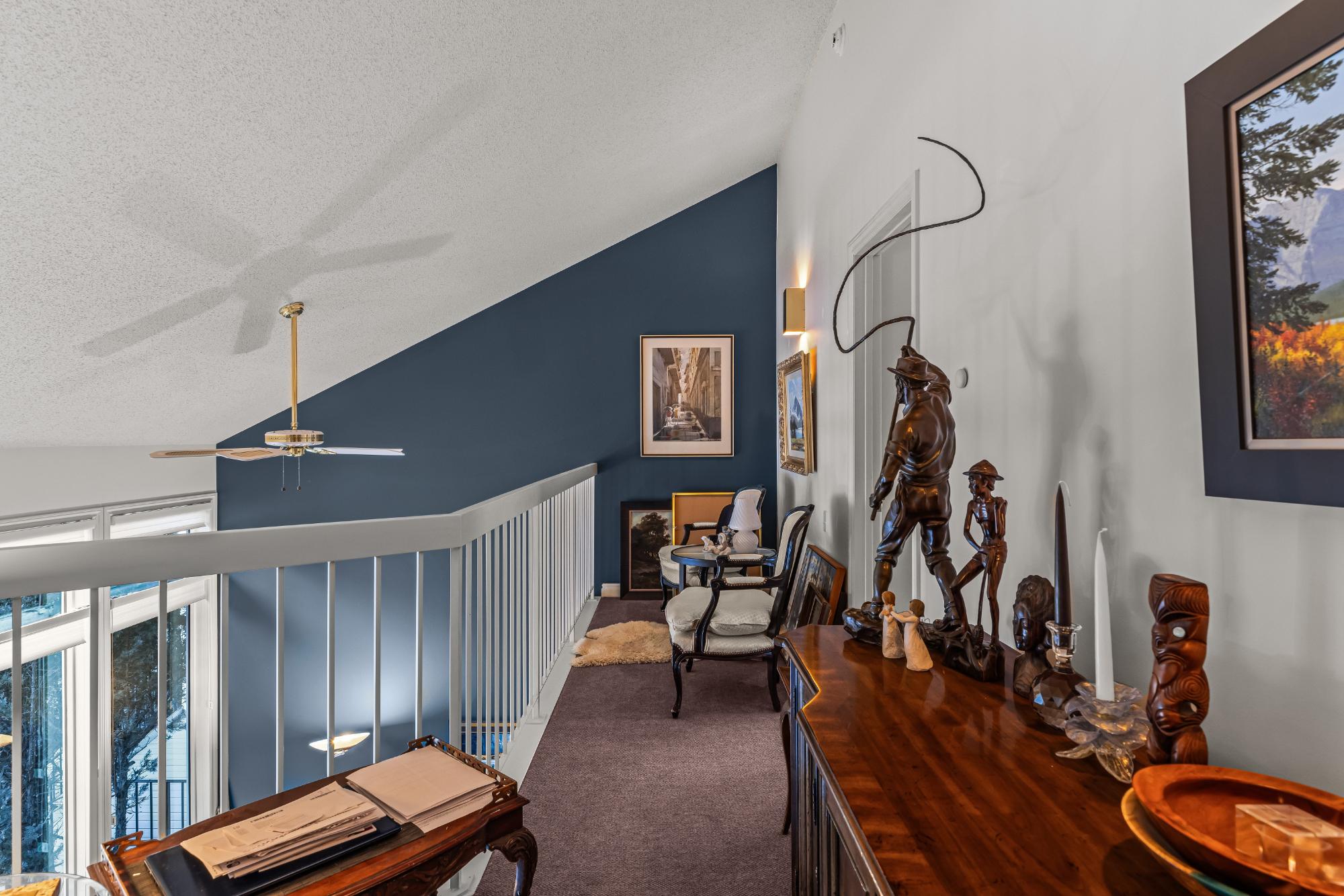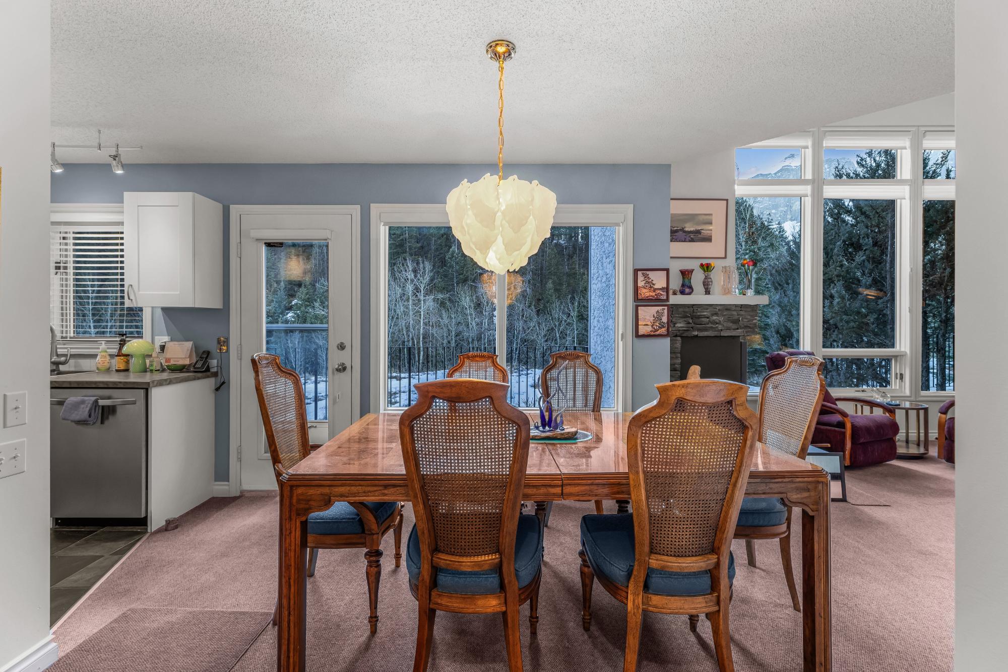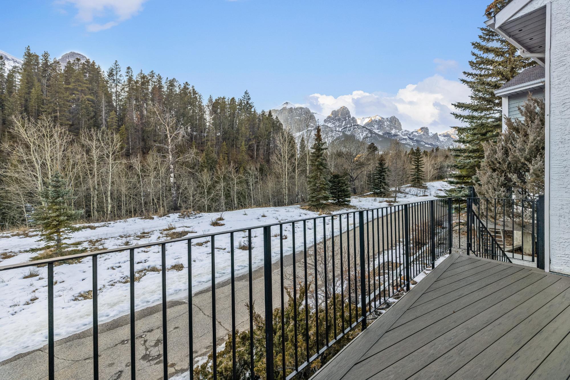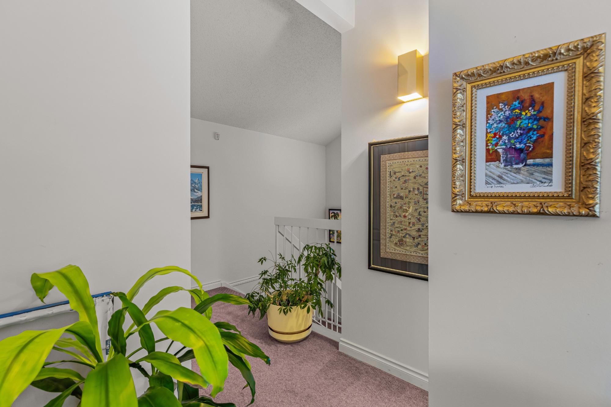Properties within this limited collection of residences are rarely available, reflecting the desirability and long-term ownership in this location. Offering over 2,200 sq ft of living space, this 3-bedroom, 3-bathroom home backs directly onto unique green space with exceptional south-facing mountain views. The main floor is designed for convenient primary living and includes a spacious primary bedroom, 3-piece bathroom, kitchen, dining area, and living room. Vaulted ceilings and expansive windows provide abundant natural light and frame the surrounding landscape. A slate entry foyer creates a strong first impression, while the adjacent deck offers a sunny setting to enjoy the views. Upstairs features two additional bedrooms and a 4-piece bathroom. The fully developed basement includes a recreation room, 3-piece bathroom, laundry, storage, and utility space. Covered carport included. A rare opportunity in a tightly held, sought-after community.