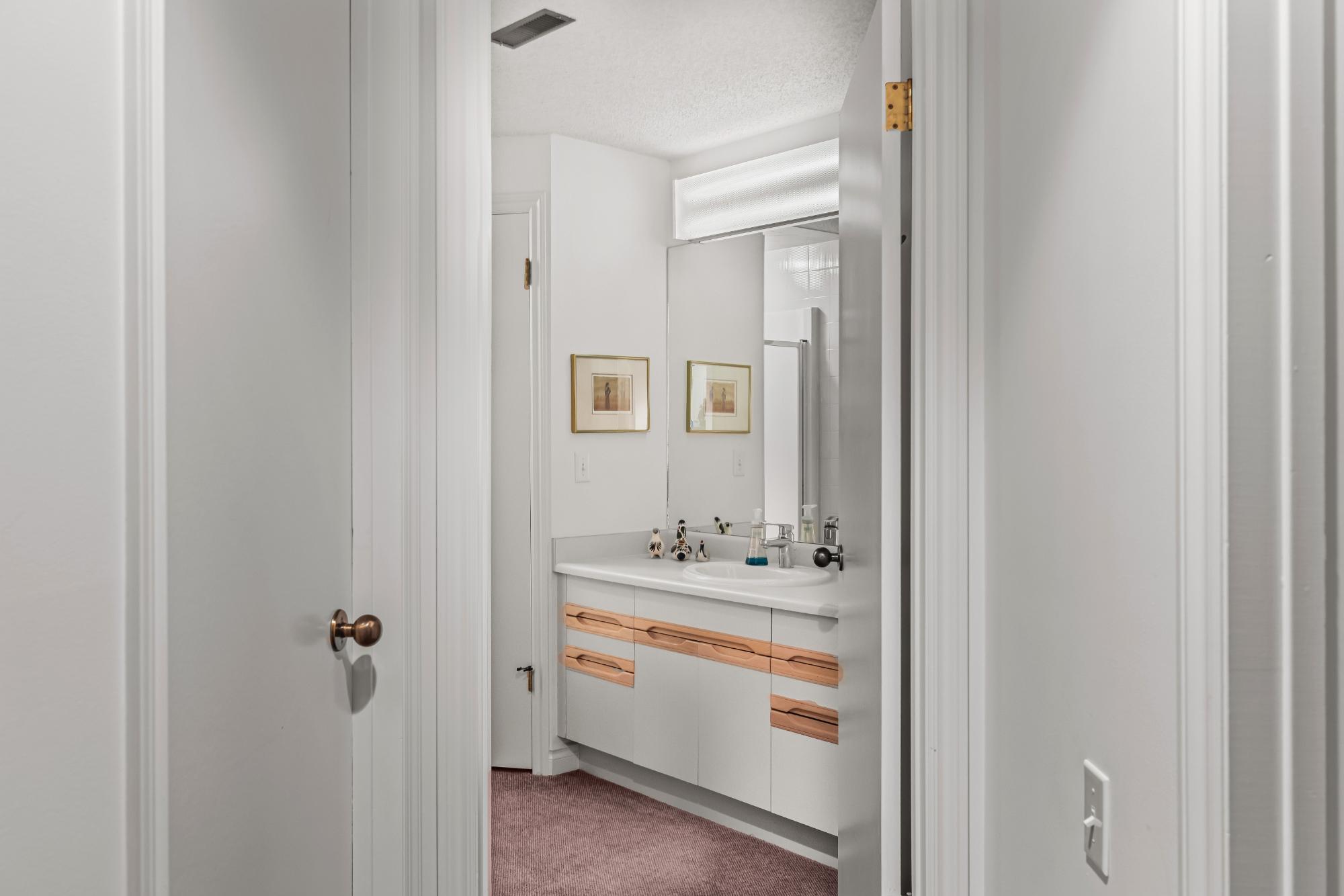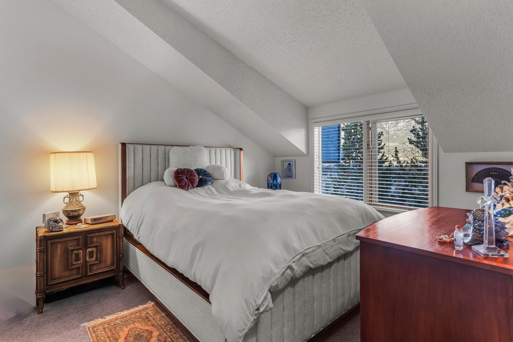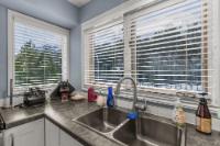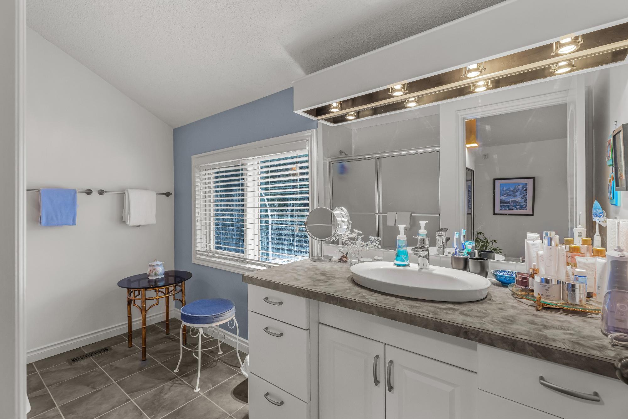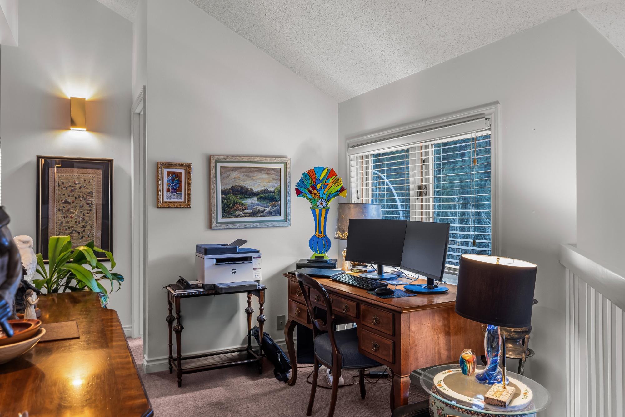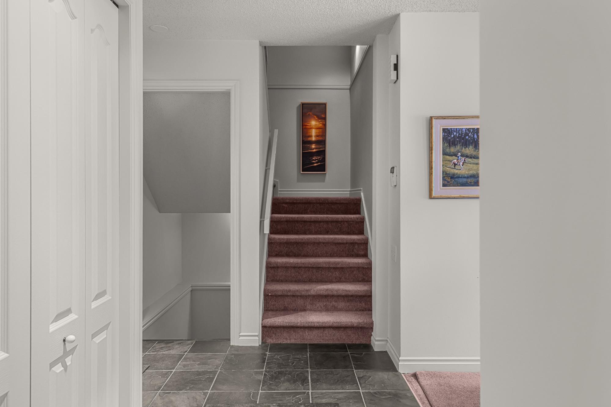 Properties within this limited collection of residences are rarely available, reflecting the desirability and long-term ownership in this location. Offering over 2,200 sq ft of living space, this 3-bedroom, 3-bathroom home backs directly onto unique green space with exceptional south-facing mountain views. The main floor is designed for convenient primary living and includes a spacious primary bedroom, 3-piece bathroom, kitchen, dining area, and living room. Vaulted ceilings and expansive windows provide abundant natural light and frame the surrounding landscape. A slate entry foyer creates a strong first impression, while the adjacent deck offers a sunny setting to enjoy the views. Upstairs features two additional bedrooms and a 4-piece bathroom. The fully developed basement includes a recreation room, 3-piece bathroom, laundry, storage, and utility space. Covered carport included. A rare opportunity in a tightly held, sought-after community.