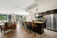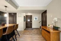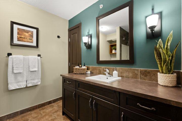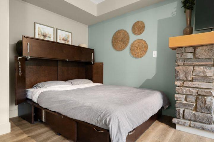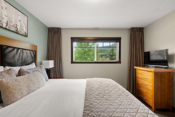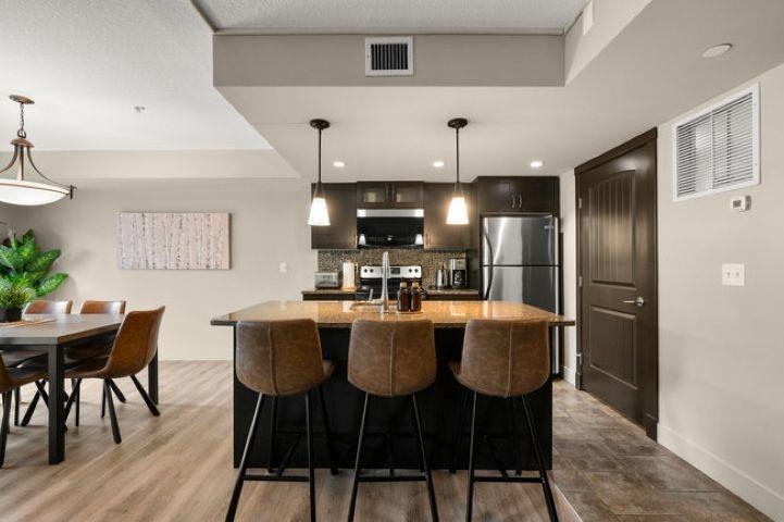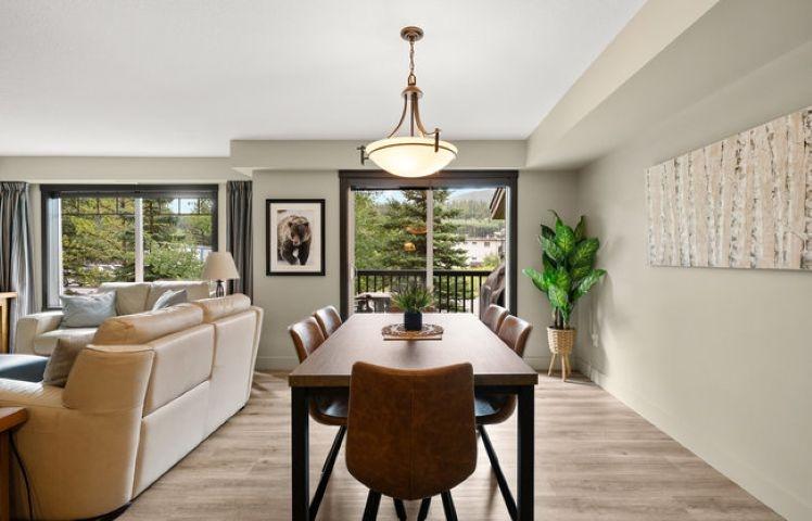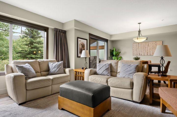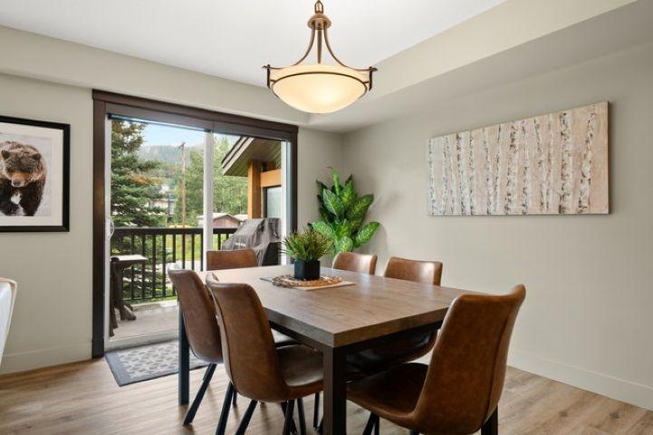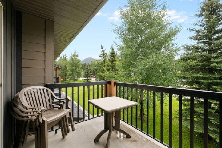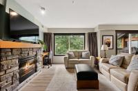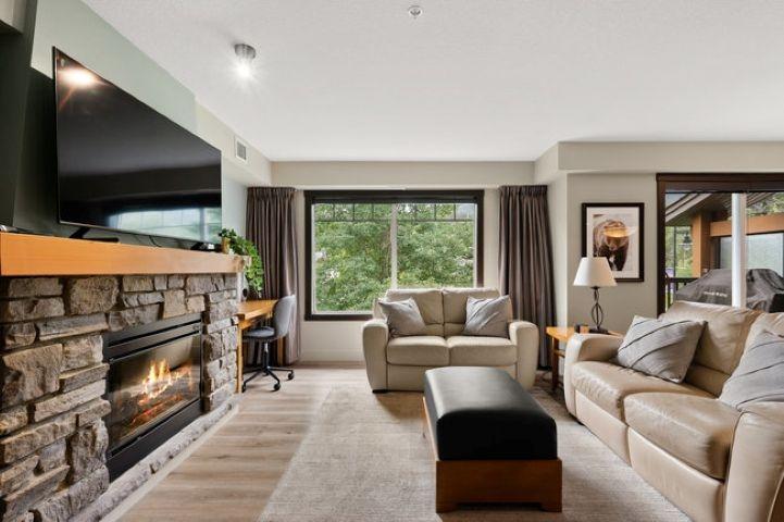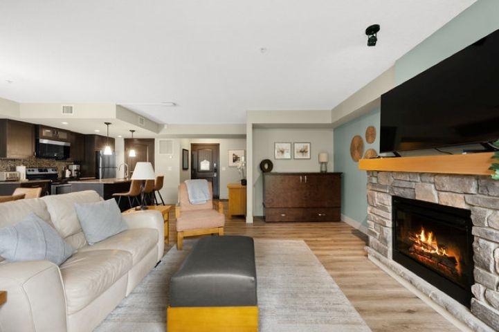 This bright, spacious two-level condo offers the perfect mountain escape, excellent for personal getaway and short-term rental potential to offset costs when you're not here. Open-concept main level features an upgraded kitchen with granite countertops, a large island, and stainless steel appliances, flowing into the dining area and generous living room with a cozy stone fireplace, a handy desk nook, Cabinet Bed for additional guests, and a sunny South-Facing deck with spectacular mountain views. Upstairs, the Large Primary Bedroom and 4-piece ensuite with a sizeable vanity. Second bedroom,& spacious main 4-piece bathroom, complete the upper level. Including in-suite laundry, underground parking, and storage cage, all in a pet-friendly complex. Amenities include outdoor hot tub, BBQ, firepit, and fitness facility. Zoning allows short-term rentals, with the flexibility to self-manage or use the on-site management company. Offered fully turnkey, price subject to GST