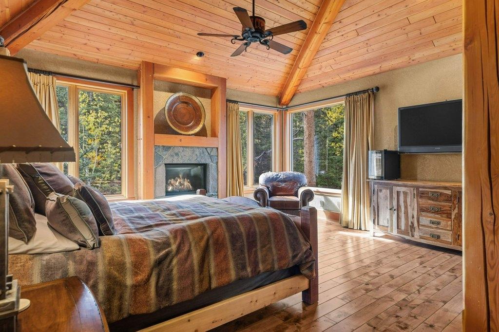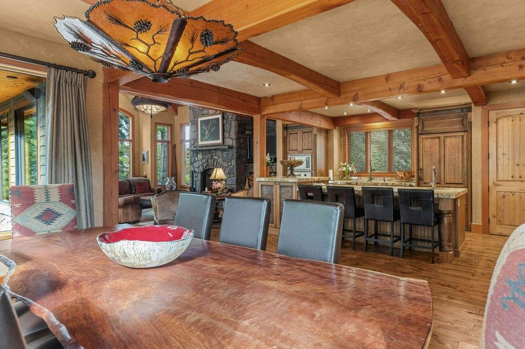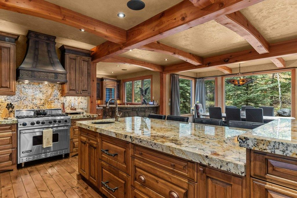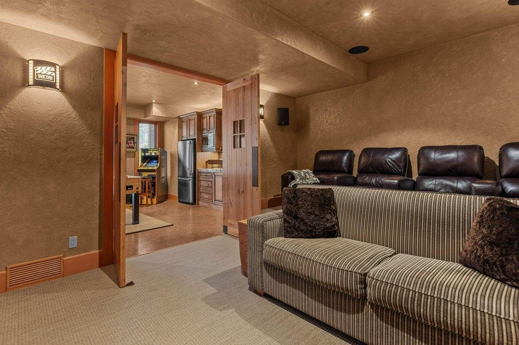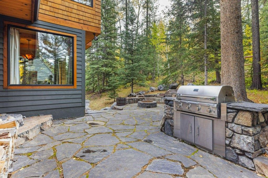 Located in Cairns on the Bow, this custom 4,000+ sq ft timber-frame home offers privacy, warmth, and mountain character. Set on a beautifully treed 17,642 sq ft lot in Canmore’s only gated community, it blends natural seclusion with exceptional craftsmanship. Soaring fir-paneled ceilings and Italian plaster create a refined atmosphere throughout. The open-concept layout connects the main living spaces, ideal for daily living and entertaining. A Rundle stone wood-burning fireplace anchors the great room, while the kitchen features custom cabinetry and premium Sub-Zero and Viking appliances. The primary suite is a tranquil retreat with treetop views and a spa-inspired ensuite finished in Marinace granite and travertine with a jetted tub. Two guest bedrooms, a home theatre, recreation room, office, and custom bar provide flexibility for family and guests. Professionally landscaped grounds with natural stonework, built-in BBQ, and fire pit complete this timeless mountain retreat.
