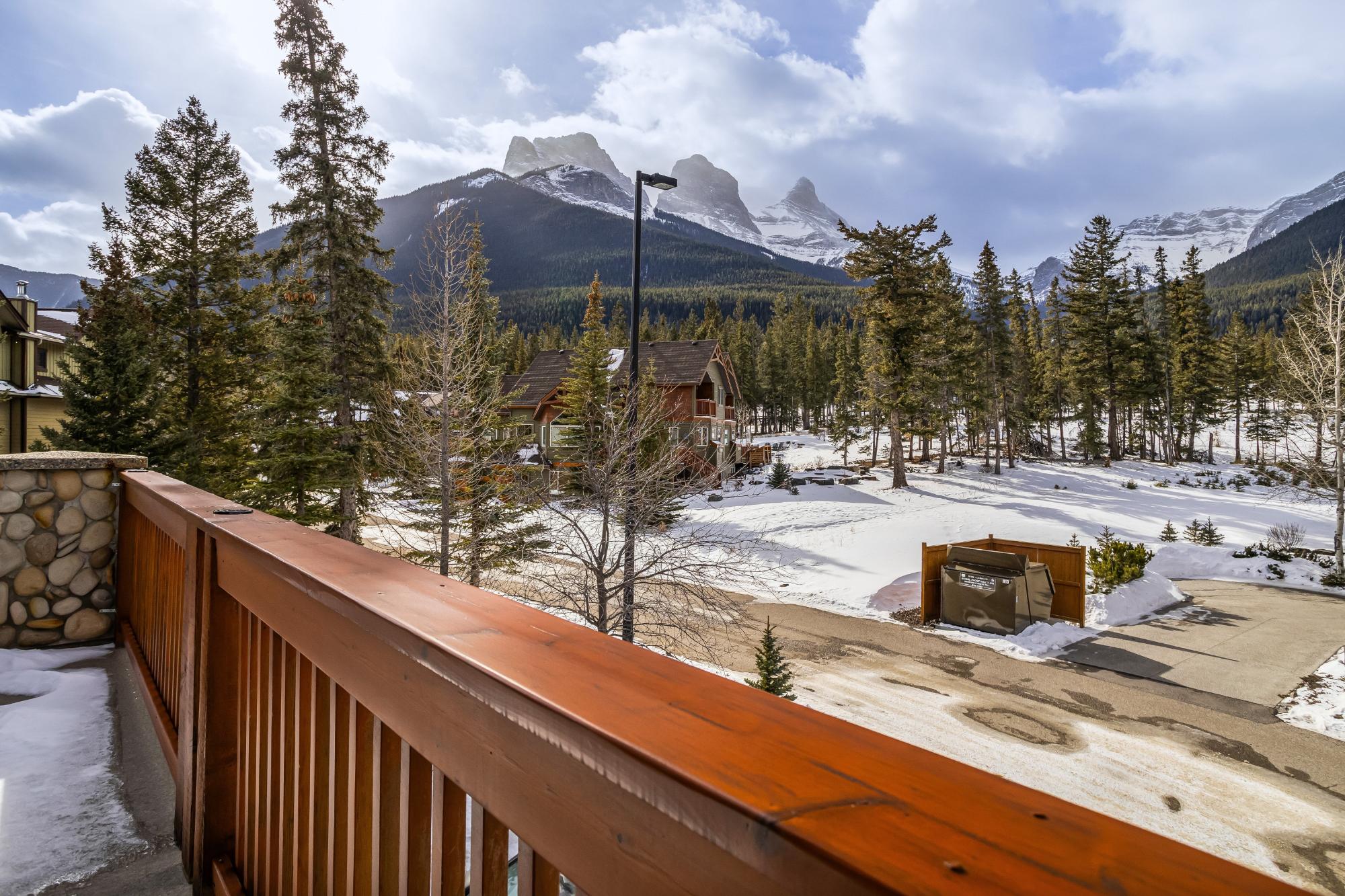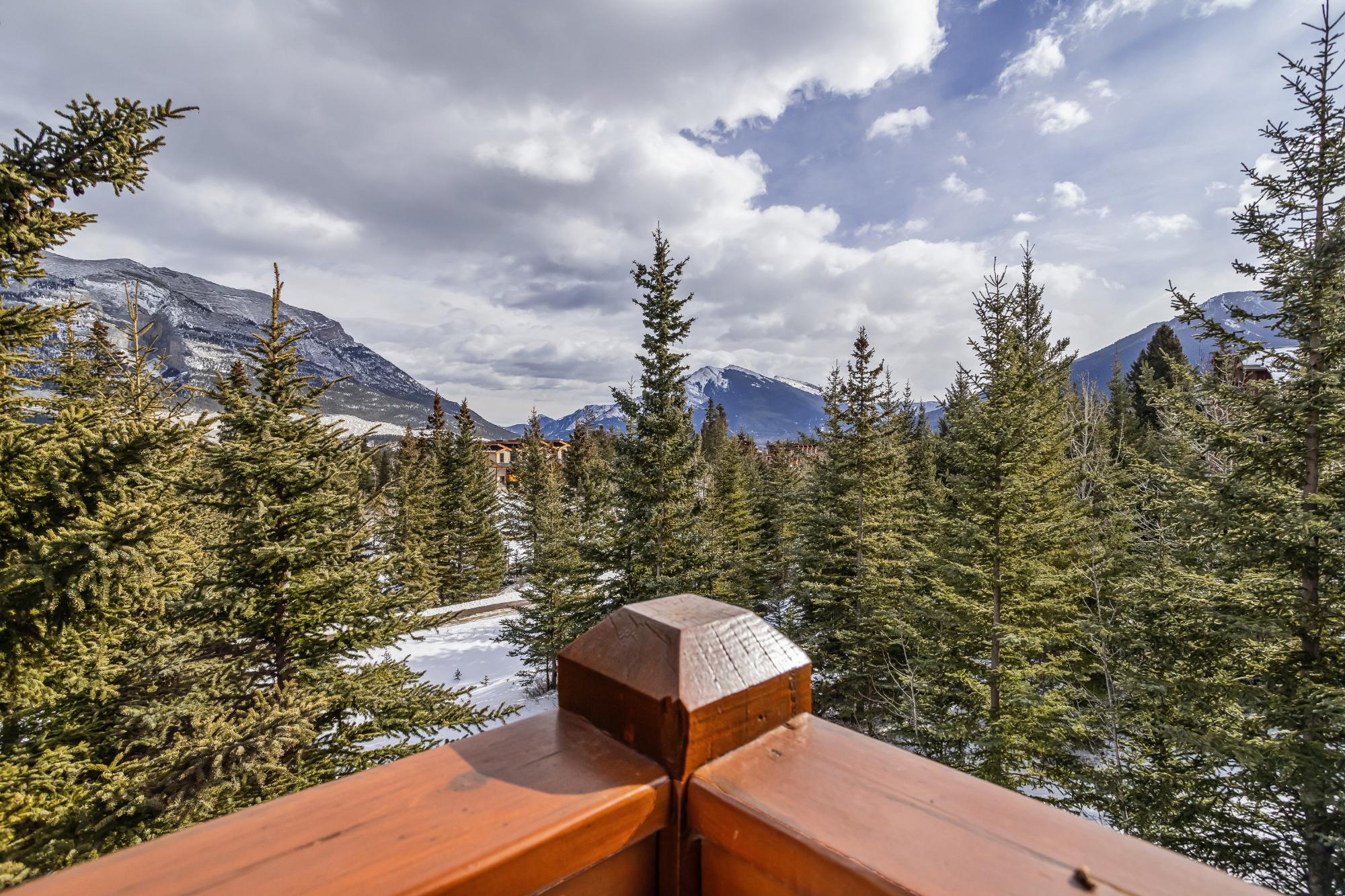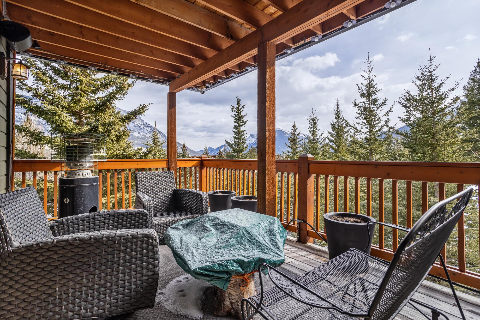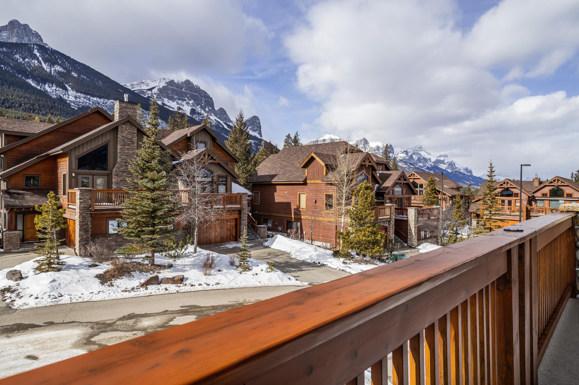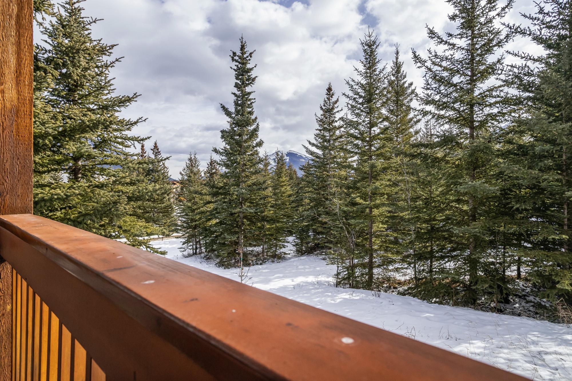 Set within the exclusive enclave of Hubman Landing, this 5-bedroom, 5-bathroom home offers over 4,100 sq ft of living space, positioned to capture exceptional views from nearly every window. Elevated above the surrounding trees and backing onto privacy, multiple outdoor patios and balconies fully embrace the natural setting. The main level features vaulted ceilings and warm hardwood flooring, creating a timeless Canmore aesthetic. The kitchen is functional and inviting, opening to generous living and dining spaces that frame the mountains beyond. The primary suite is located on the main floor for true one-level living and includes a striking floor-to-ceiling fireplace. The walkout lower level provides excellent separation of space, ideal for guests, family, or multi-generational living. With five bedrooms and five bathrooms in total, the layout offers flexibility without compromising privacy. A tranquil backyard with a patio and fire pit, surrounded by mature trees.