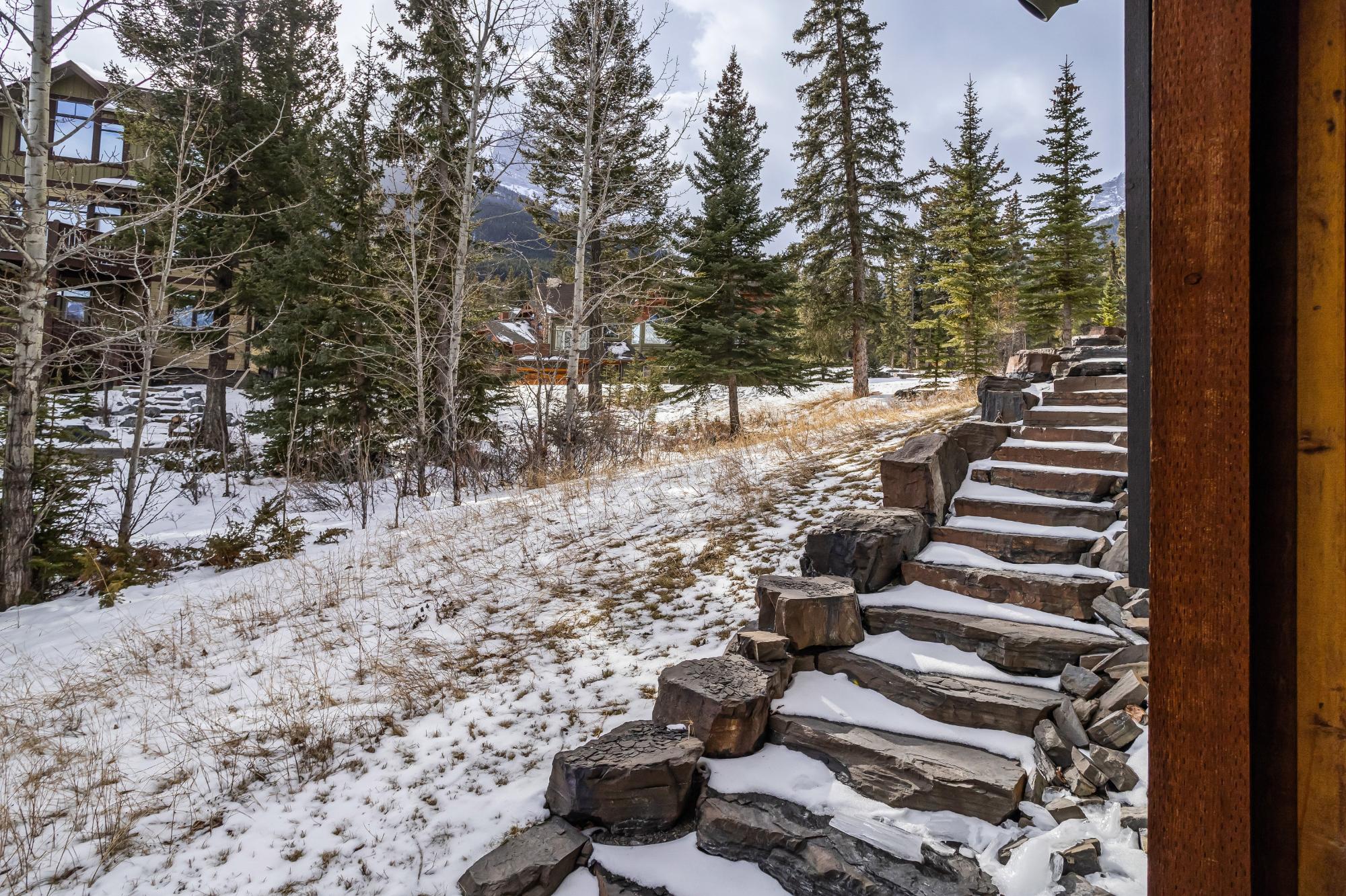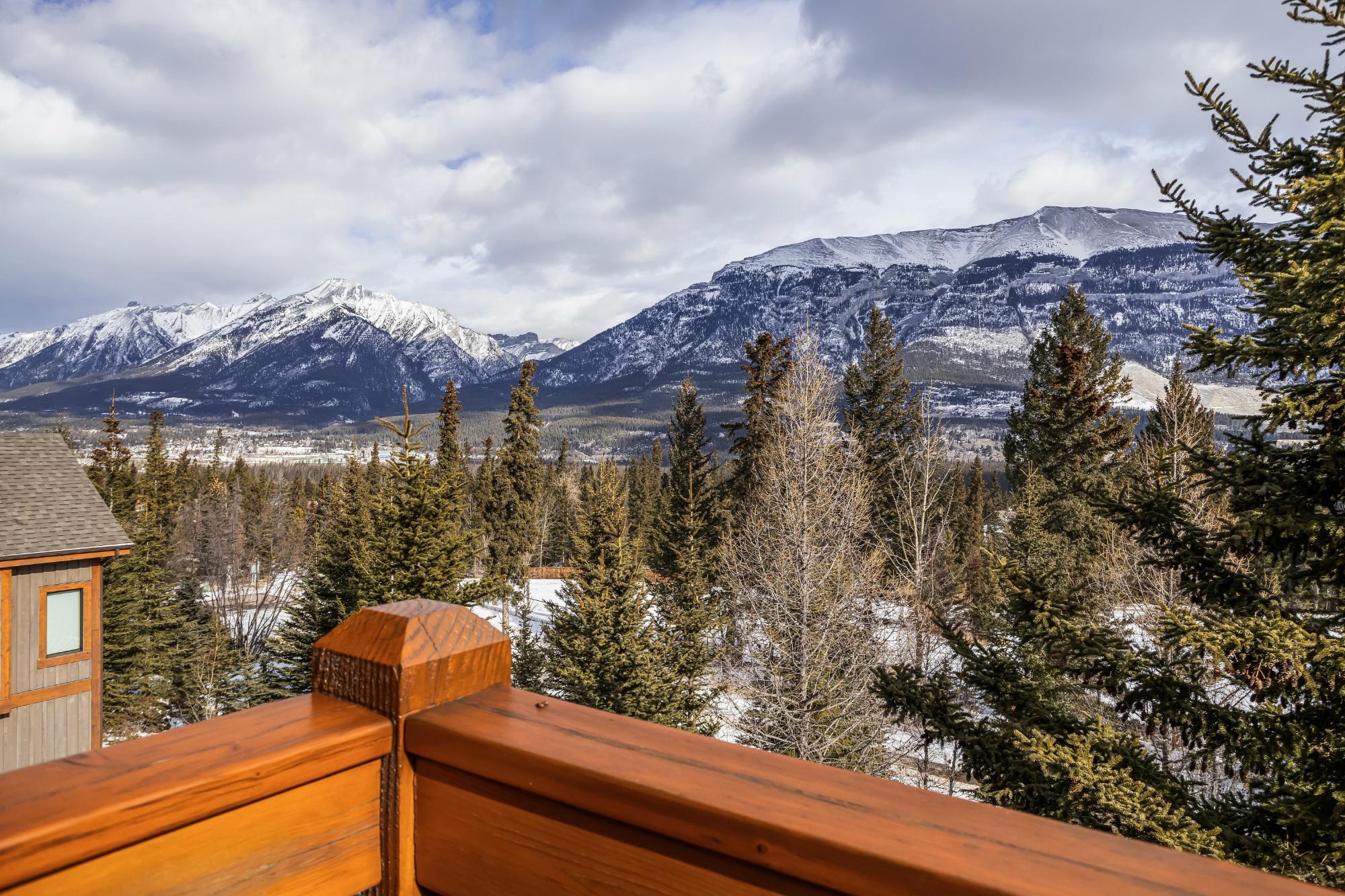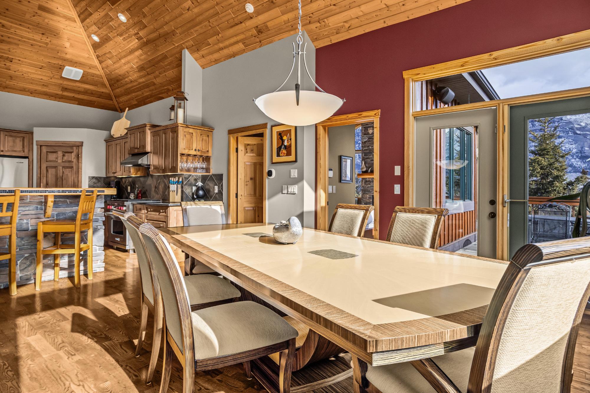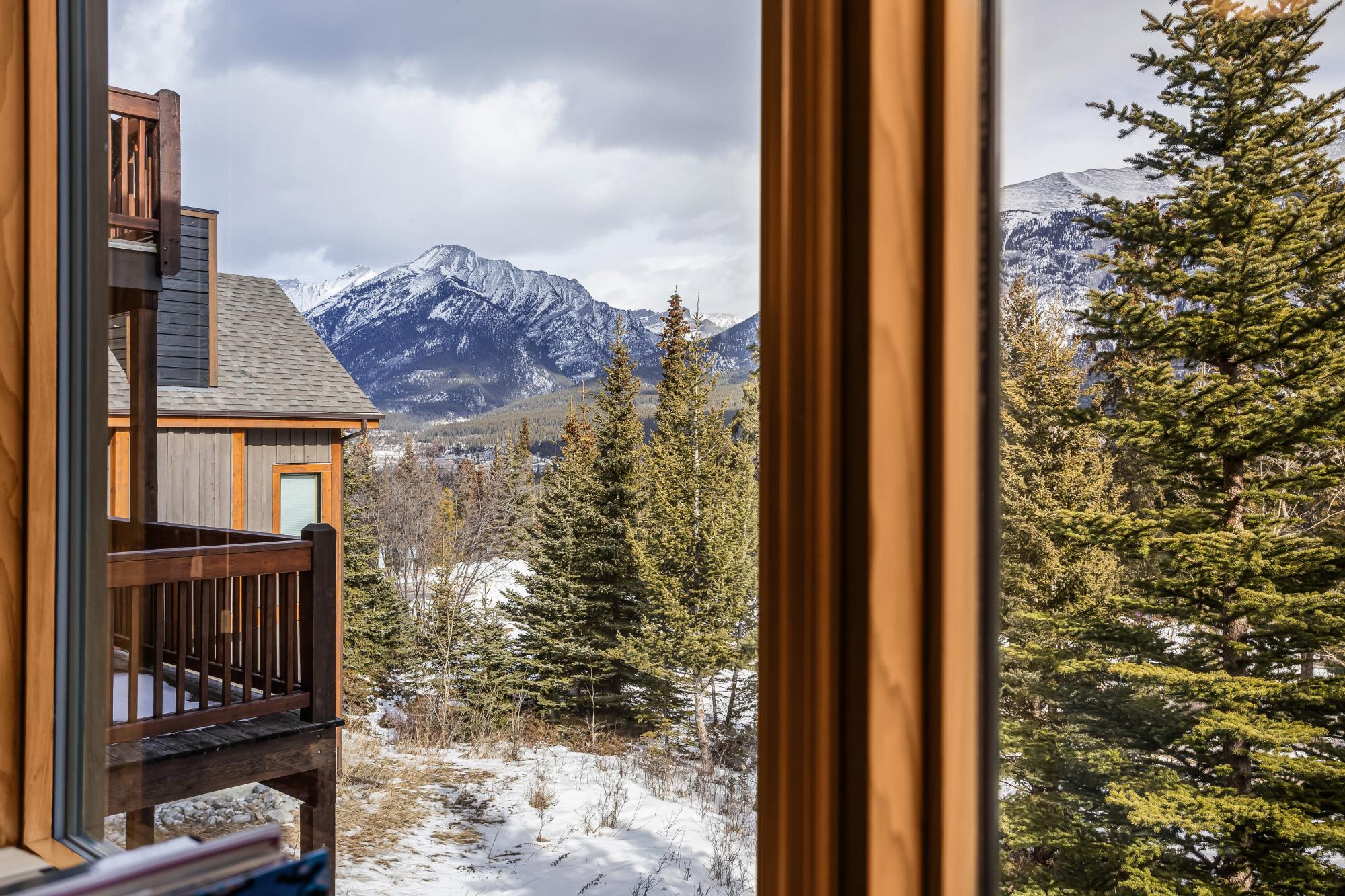 Set within the exclusive enclave of Hubman Landing, this 5-bedroom, 5-bathroom home offers over 4,100 sq ft of living space, positioned to capture exceptional views from nearly every window. Elevated above the surrounding trees and backing onto privacy, multiple outdoor patios and balconies fully embrace the natural setting. The main level features vaulted ceilings and warm hardwood flooring, creating a timeless Canmore aesthetic. The kitchen is functional and inviting, opening to generous living and dining spaces that frame the mountains beyond. The primary suite is located on the main floor for true one-level living and includes a striking floor-to-ceiling fireplace. The walkout lower level provides excellent separation of space, ideal for guests, family, or multi-generational living. With five bedrooms and five bathrooms in total, the layout offers flexibility without compromising privacy. A tranquil backyard with a patio and fire pit, surrounded by mature trees.