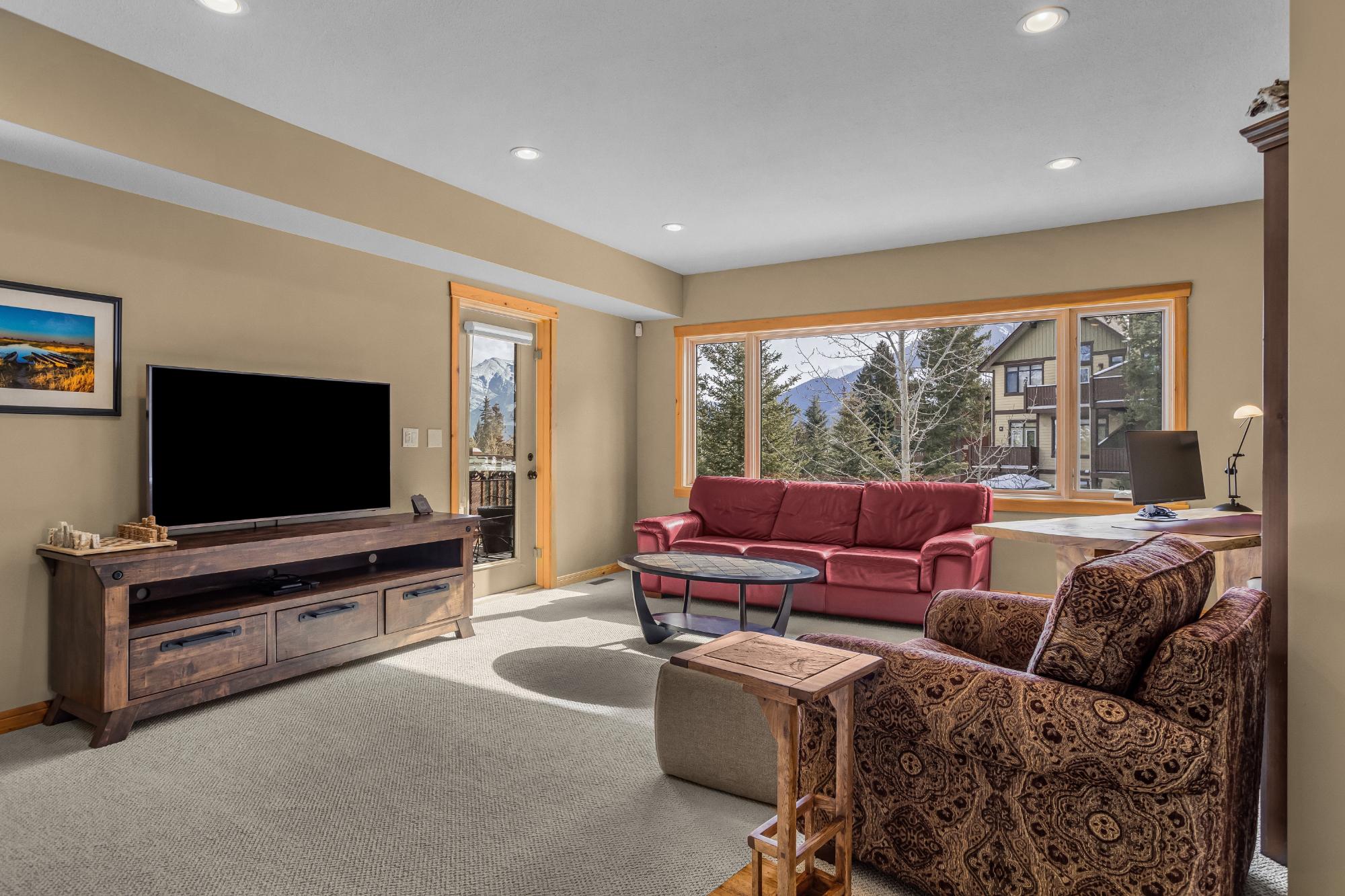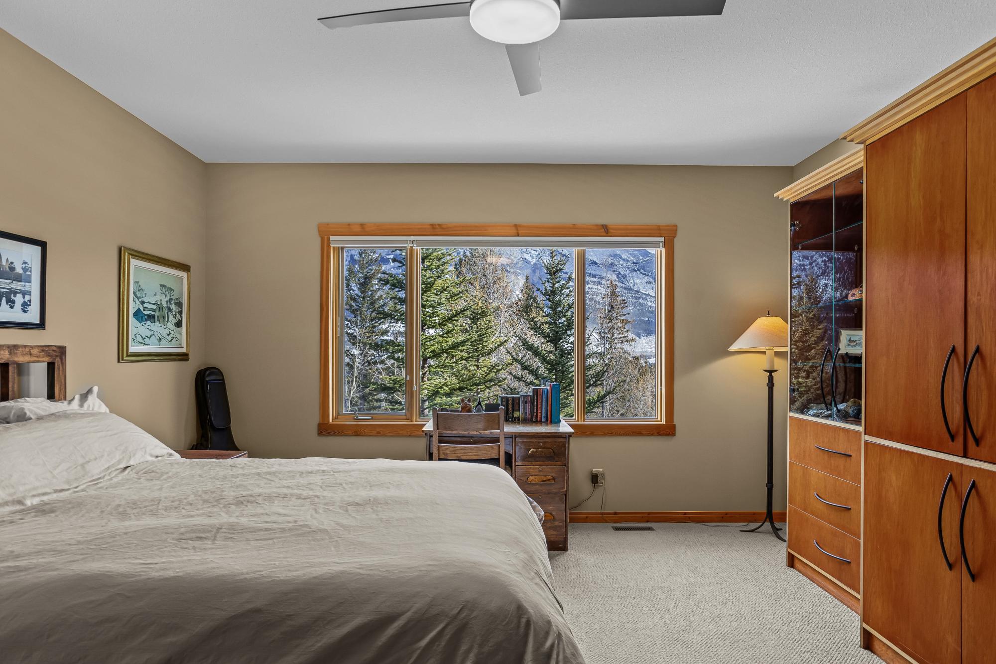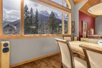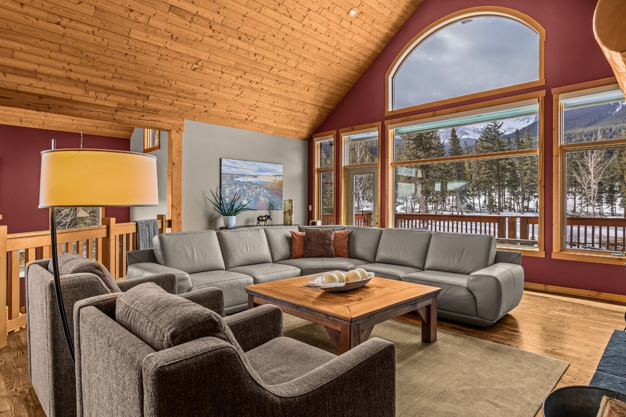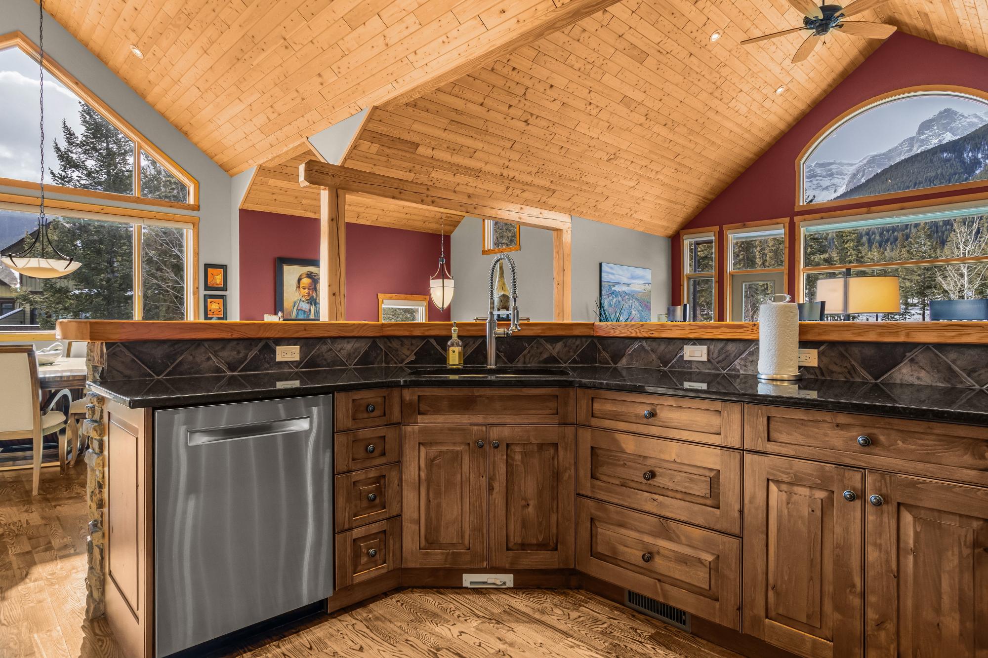 Set within the exclusive enclave of Hubman Landing, this 5-bedroom, 5-bathroom home offers over 4,100 sq ft of living space, positioned to capture exceptional views from nearly every window. Elevated above the surrounding trees and backing onto privacy, multiple outdoor patios and balconies fully embrace the natural setting. The main level features vaulted ceilings and warm hardwood flooring, creating a timeless Canmore aesthetic. The kitchen is functional and inviting, opening to generous living and dining spaces that frame the mountains beyond. The primary suite is located on the main floor for true one-level living and includes a striking floor-to-ceiling fireplace. The walkout lower level provides excellent separation of space, ideal for guests, family, or multi-generational living. With five bedrooms and five bathrooms in total, the layout offers flexibility without compromising privacy. A tranquil backyard with a patio and fire pit, surrounded by mature trees.