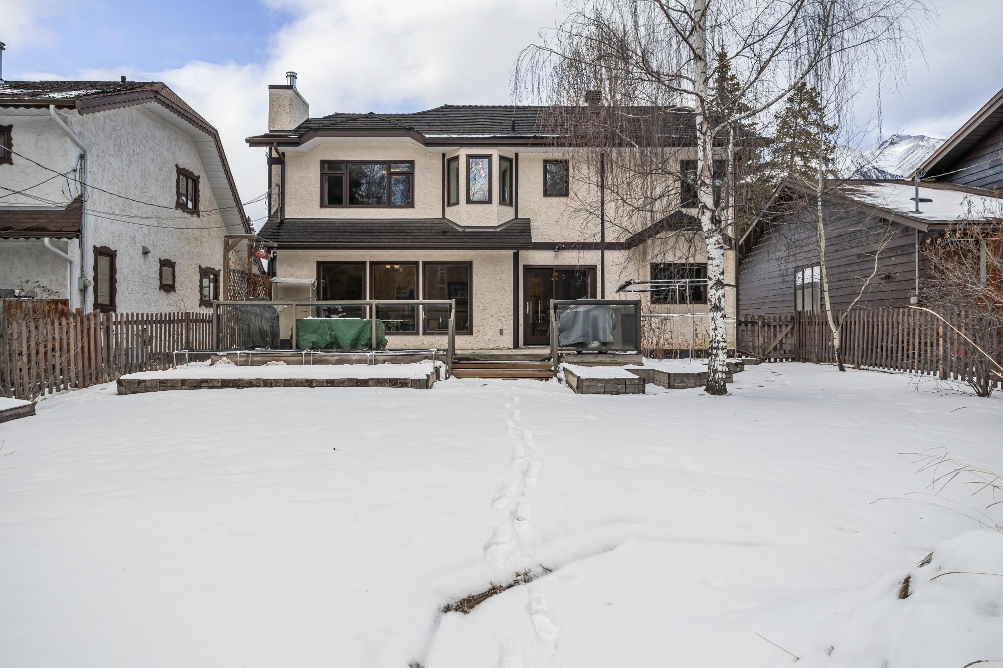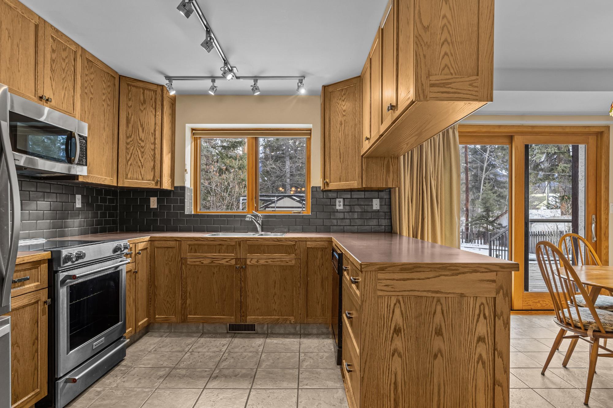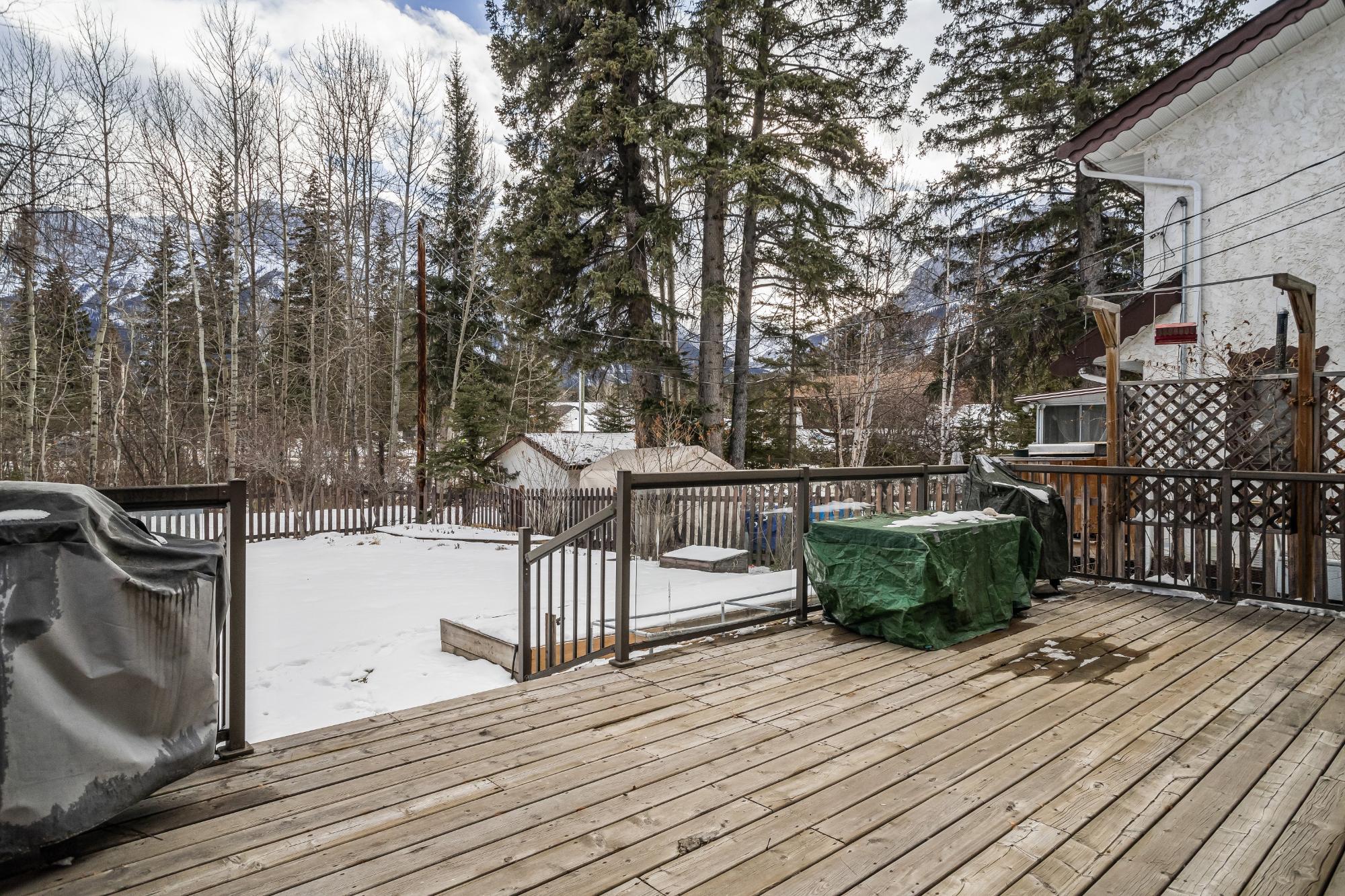 This 4 bed, 4 bath home has the perfect floorplan for your family and guests. Boasting a generous kitchen, two dining areas, and two large living rooms on the main level this very flexible floorplan has space for everyone. The bright living level extends outdoors onto the huge 370 sqft south-facing deck to enjoy the plentiful sun. Two large primary bedrooms with mountain views and ensuites occupy the upper level, along with 2 more bedrooms, a 5 piece family bathroom and a home office. Keep your cars and mountain toys safe in the heated double garage, with parking for up to 4 more on the driveway. The back yard also benefits from rear lane access. All this within walking distance of the Bow River trails, Arts Place, Elevation Place, and the heart of Canmore on Main Street. This delightful home has seen many quality upgrades over the years including replacement windows, rubber roof, on-demand hot water & high efficiency furnace. A fantastic opportunity in a sought-after neighborhood