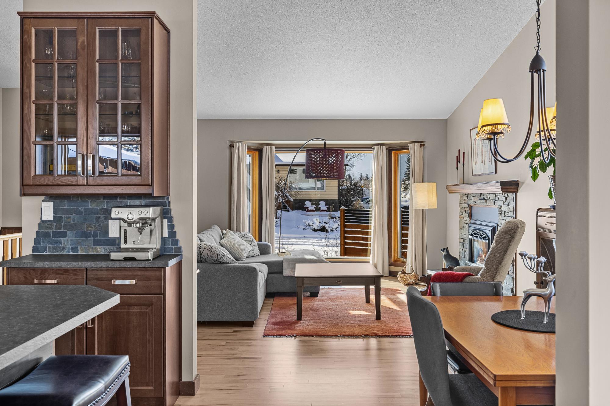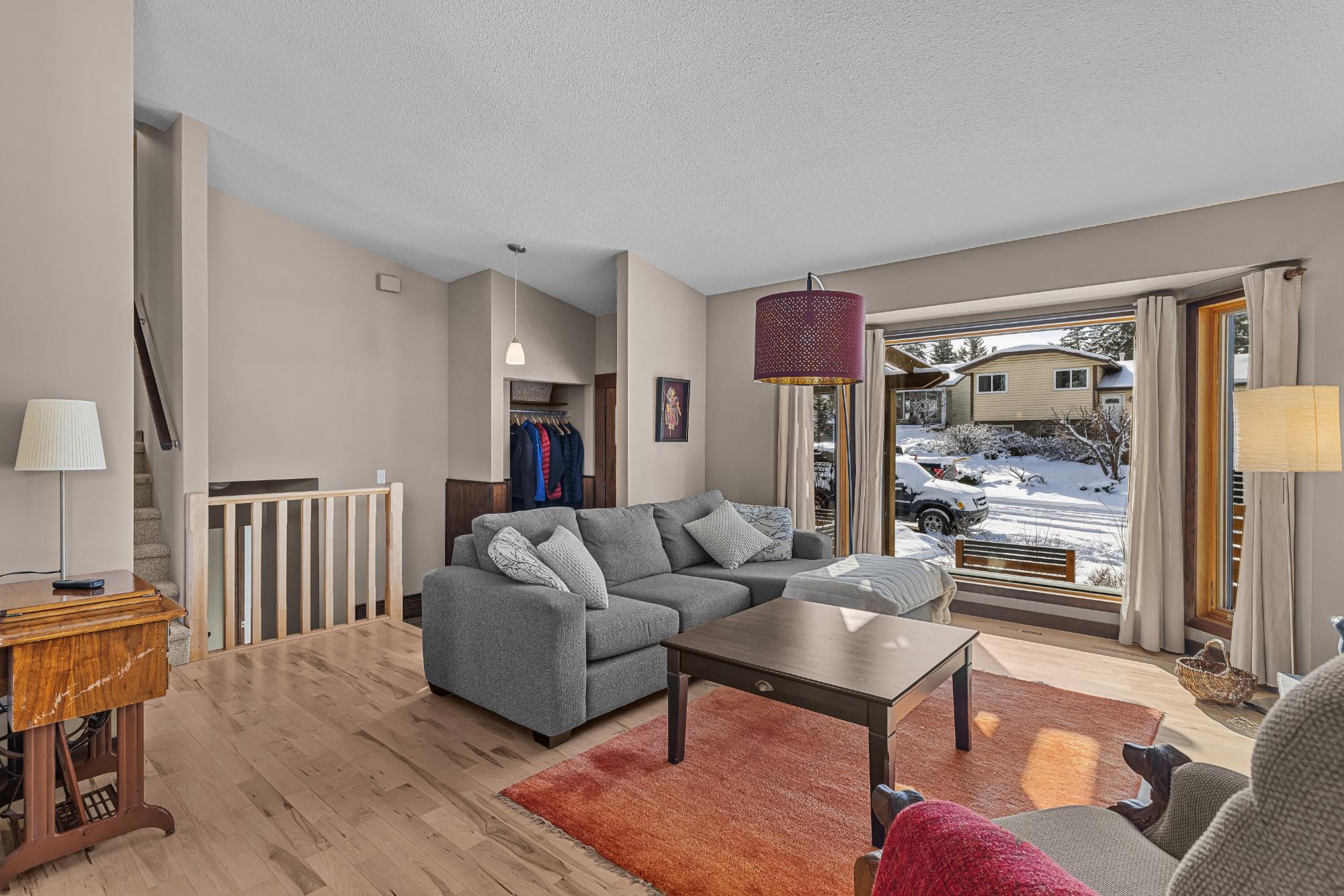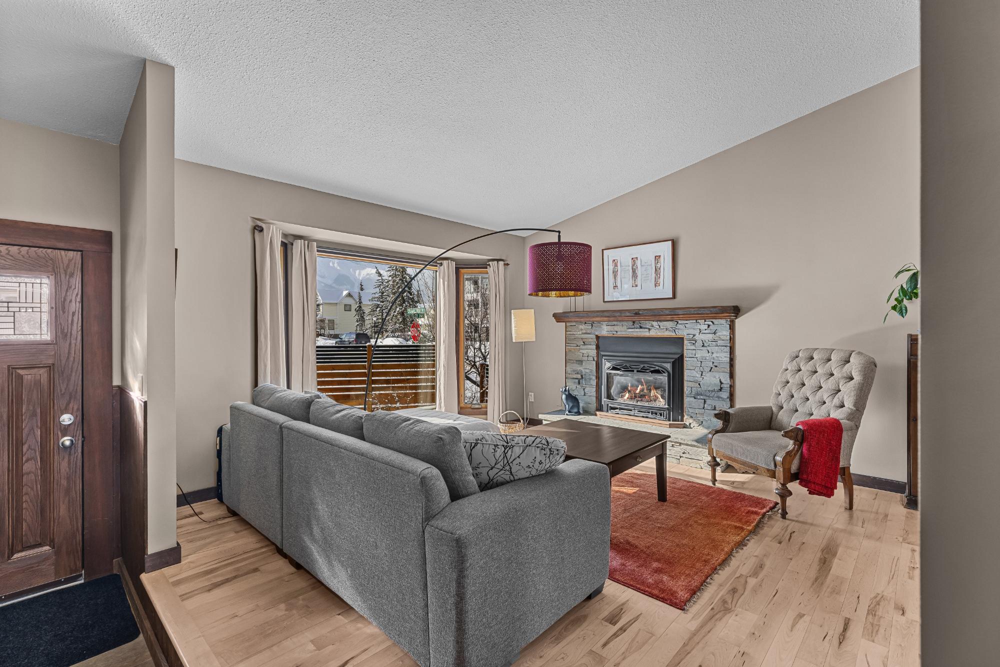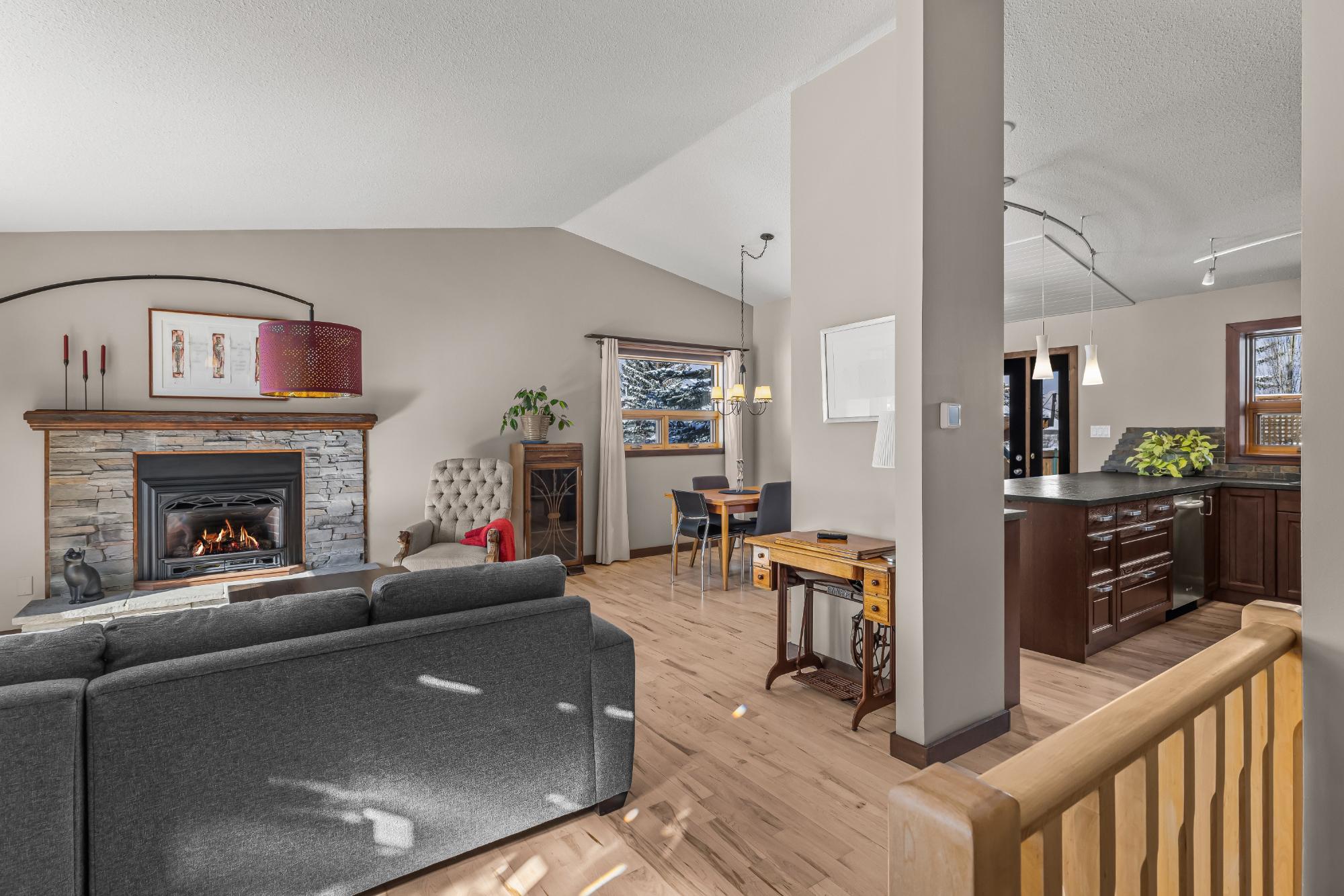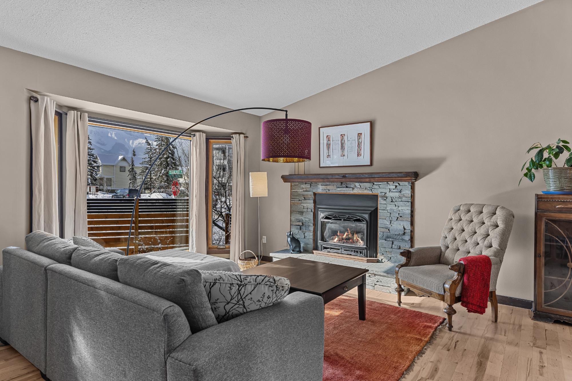 Set on a desirable corner lot on the sunny side of the valley, this Cougar Creek home offers exceptional mountain views and a prime location just minutes to schools, trails, parks, and shops. The open-concept main level is bright and welcoming, featuring hardwood flooring, a slate entry, and a cozy gas fireplace. The split-level layout offers great flexibility. Just above the main living area are two bedrooms and a full bathroom. Down one level, you’ll find a third bedroom, laundry, and a 3-piece bathroom. The lower level features a spacious family room with a second gas fireplace and a versatile flex space ideal as a fourth bedroom, office, or guest area. The backyard is a standout, complete with a gazebo and firepit area perfect for relaxing or entertaining. A large shed provides excellent storage for bikes and gear, while the side parking pad accommodates up to three vehicles. A fantastic family home in one of Canmore’s most desirable neighbourhoods.