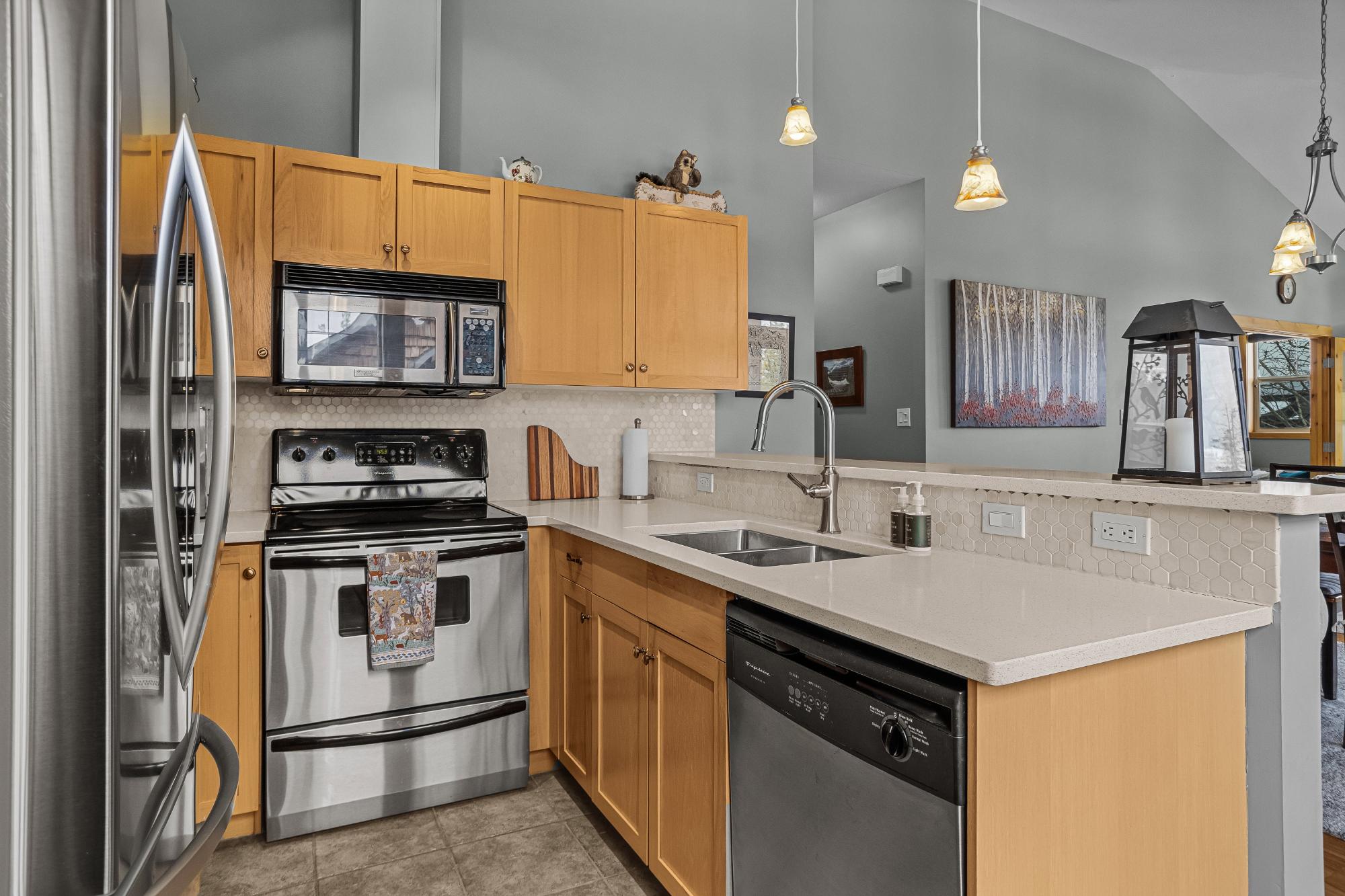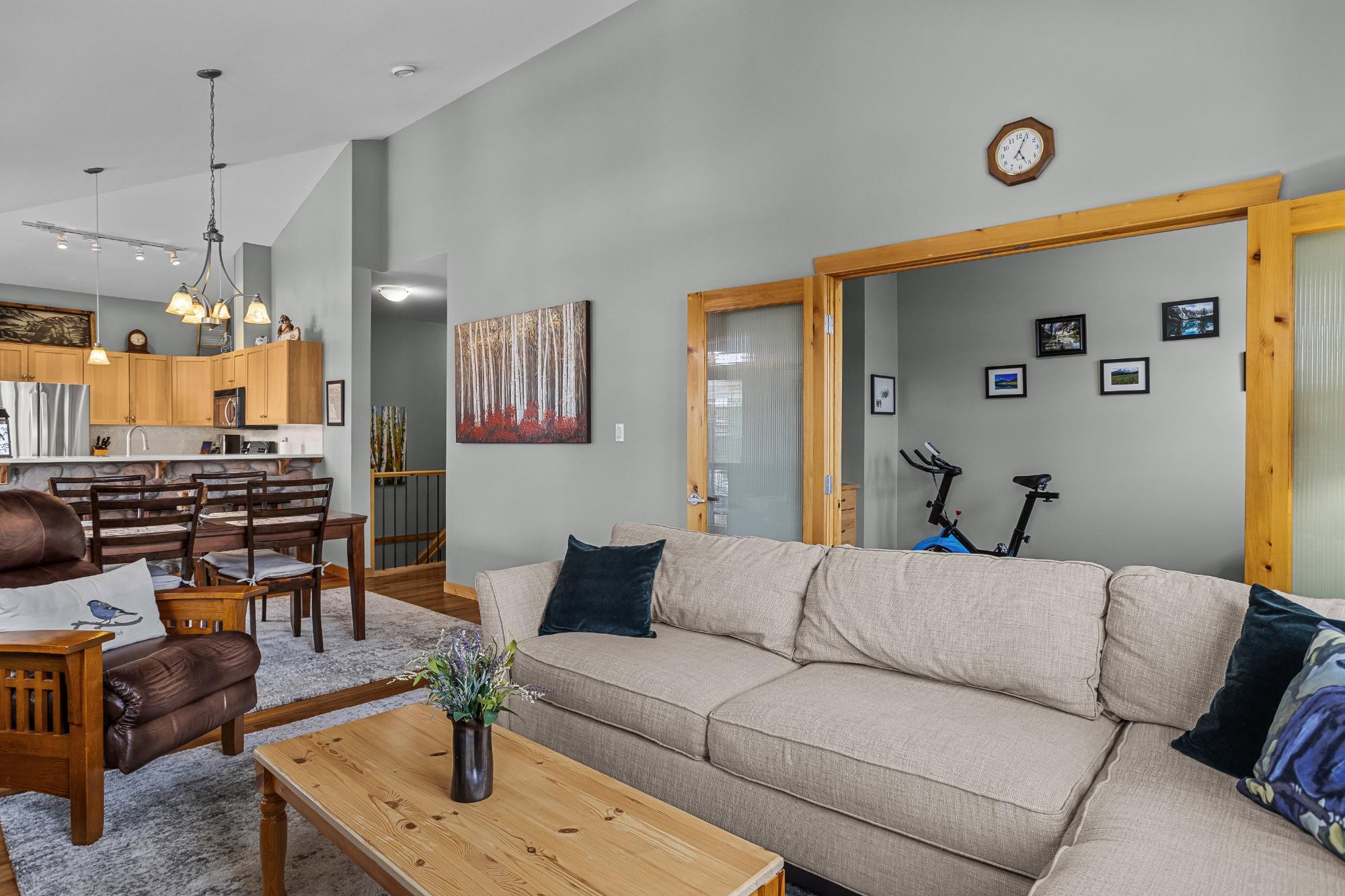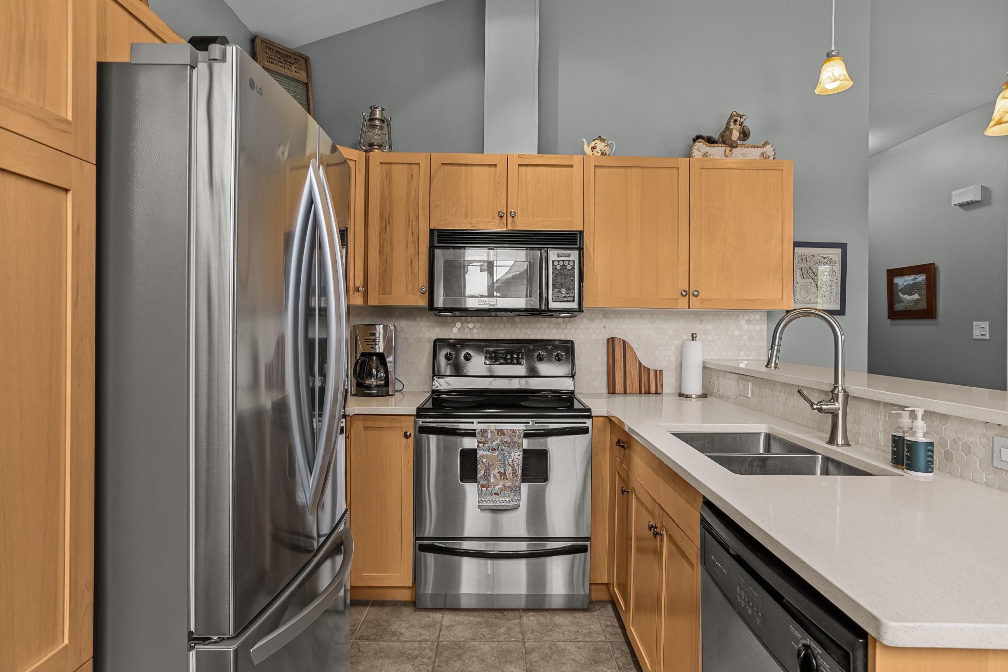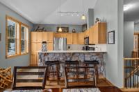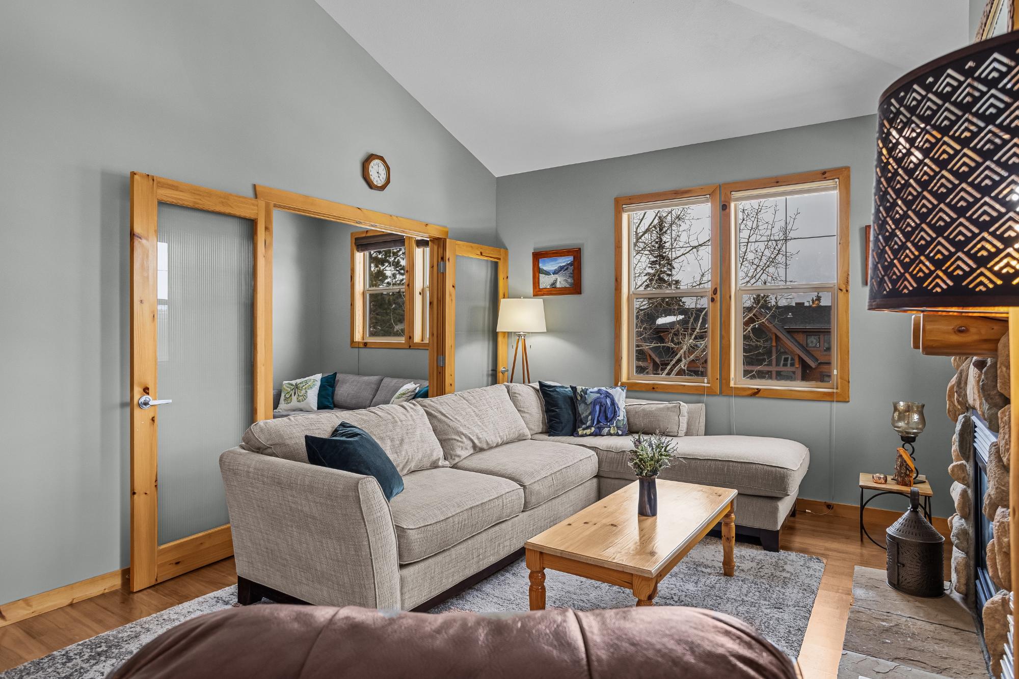 Step into this thoughtfully designed townhome featuring a bright, vaulted main living area with warm wood accents and hardwood floors. The sleek kitchen is both functional and stylish, with quartz countertops, an eating bar, and an open flow into the living space, highlighted by river stone accents and a cozy gas fireplace. Large windows bring in plenty of natural light and capture beautiful mountain views, while the covered upper balcony offers a perfect spot to relax and enjoy the scenery year-round. This home includes 3 bedrooms and 2 bathrooms, with a primary suite featuring its own ensuite and walk-in-closet. A single-car garage and additional storage provide everyday convenience. Located in a well-maintained complex with easy access to shopping and nearby trails, perfect for those who love an active lifestyle without sacrificing comfort or style.