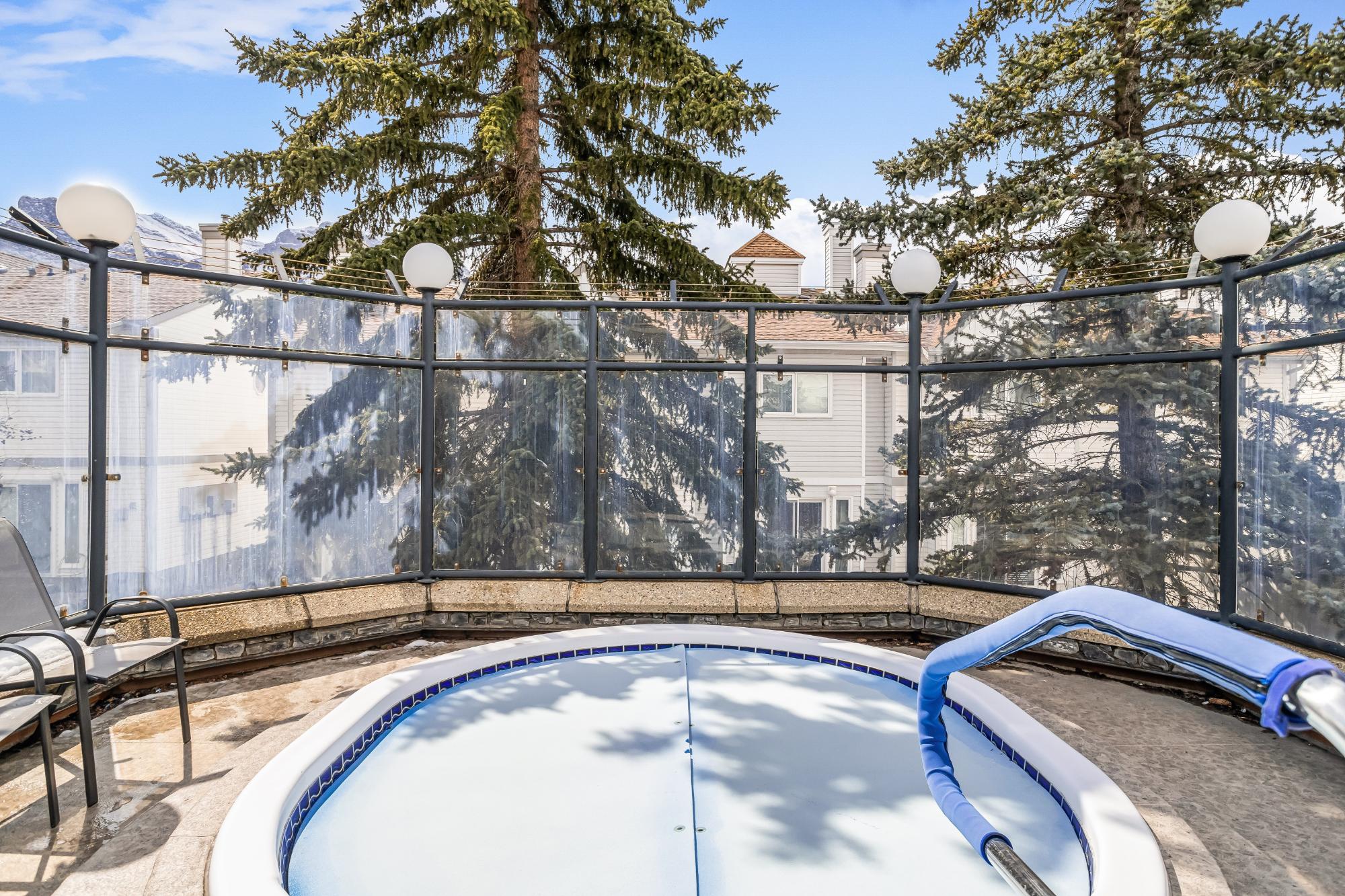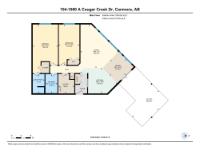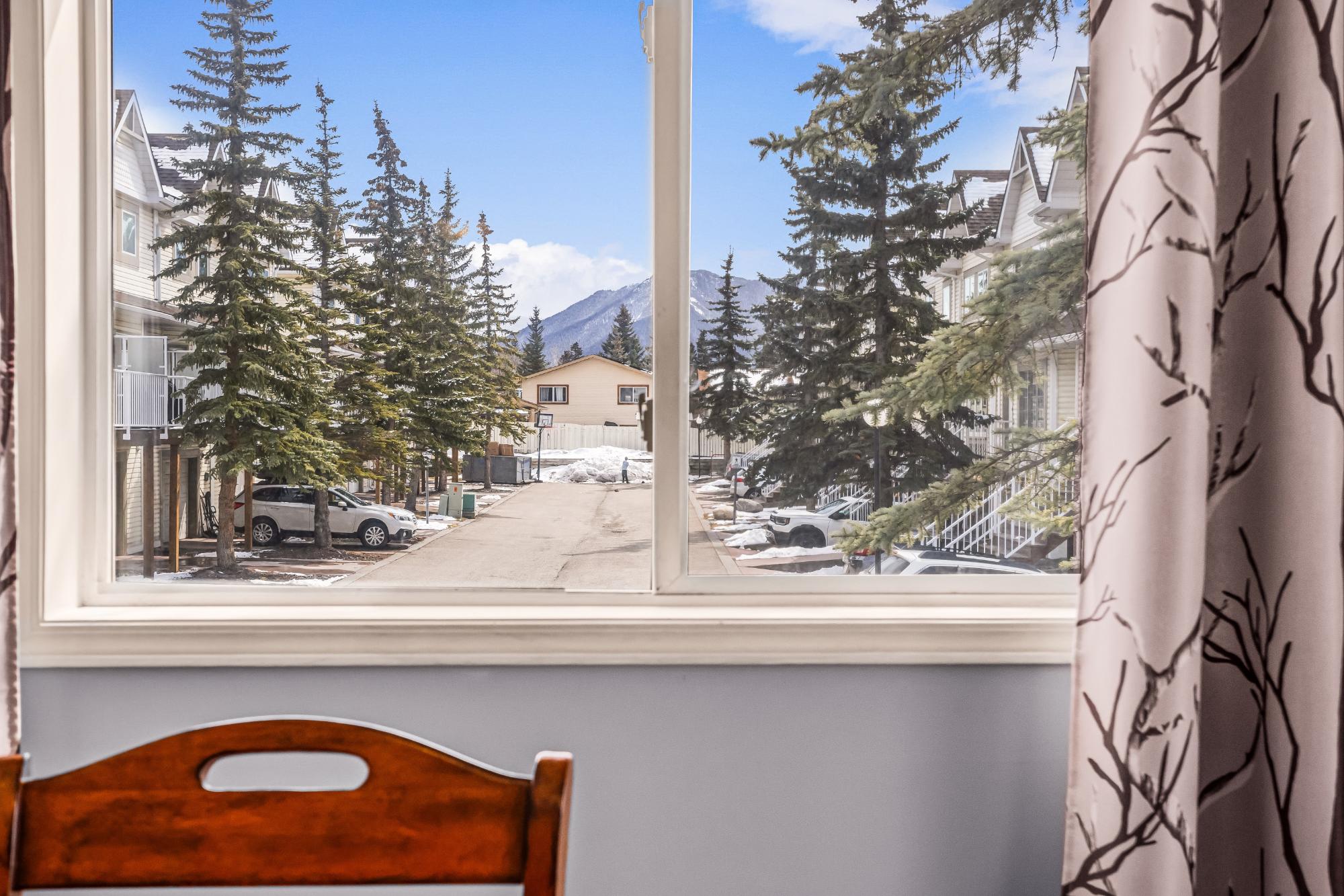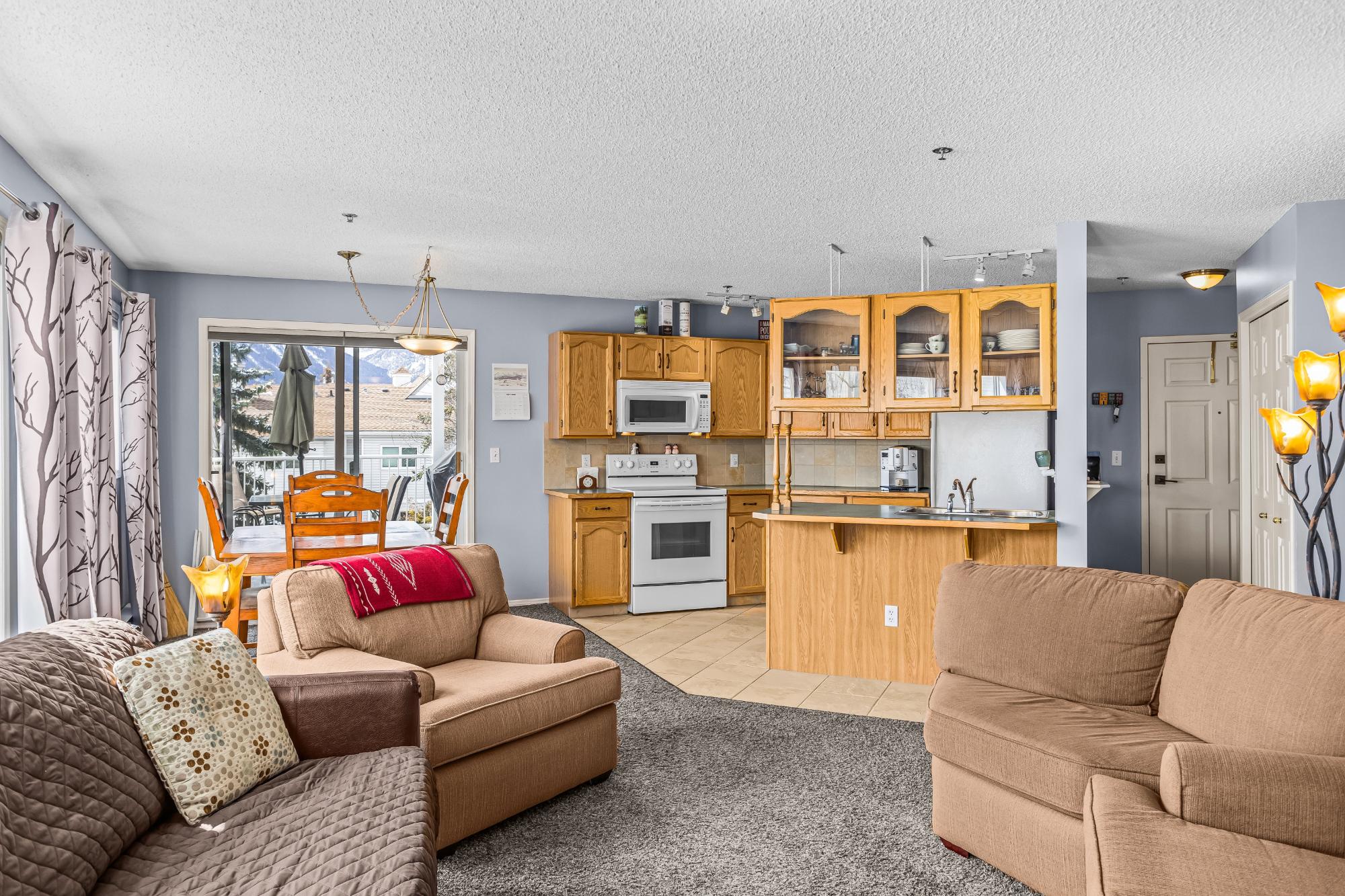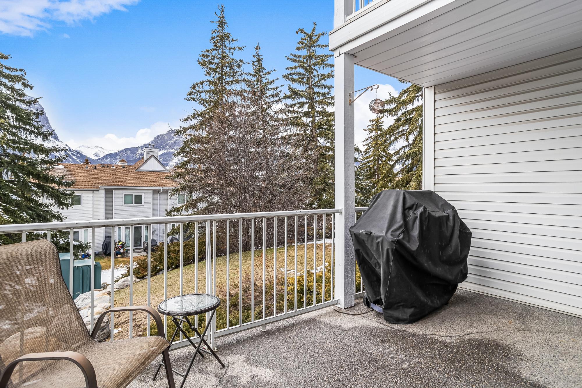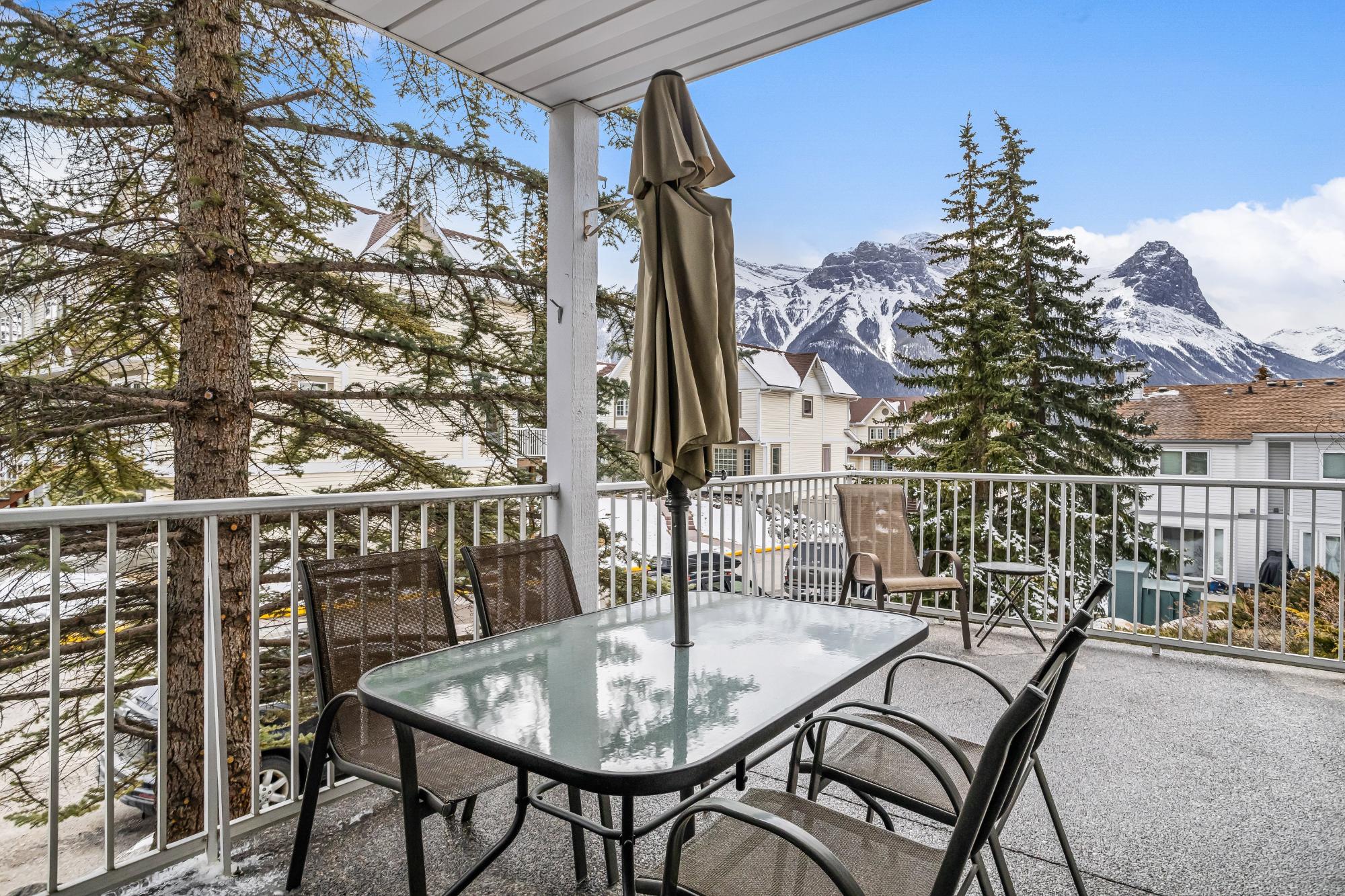 Step into this well-maintained two-bedroom, two-bathroom condo in Cougar Creek, offering a bright and functional open-concept layout. The entry and kitchen feature ceramic tile flooring that flows seamlessly into the living and dining areas. The west-facing living room captures afternoon and evening sun, highlighted by a corner gas fireplace and access to a spacious view deck with stunning mountain vistas. The generous primary bedroom includes a three-piece ensuite, while the second bedroom is thoughtfully positioned across from the updated four-piece main bathroom, alongside in-suite laundry and storage. Both bathrooms have been tastefully updated. This home also includes one heated underground parking stall and a storage locker. Located in a quiet complex with an amenities games room and out door hot tub, this property is well suited for full-time living or a mountain retreat.